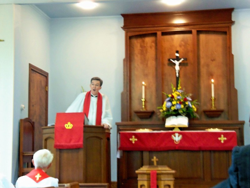 It’s also hard when you renovate one because you remember what this place was like before. Oh, you can certainly say now it’s greatly improved, but that doesn’t mean that you don’t remember the time when—fill in the blank. And it’s very much connected with the things that you did here. Perhaps you remember a beloved parent’s casket sitting right there. You could think about a son or daughter or even yourself in that glowing white gown. (Well, I’m sure your son wasn’t in that glowing white gown; he was in a tuxedo.) Your wedding day is important. You can think about that child who was baptized in this Font in the Name of the Father and of the Son and of the Holy Spirit. Amen. What an important event! And the fact that the furniture perhaps has been moved around a little bit, the paint’s different, the windows are different, doesn’t change any of that.