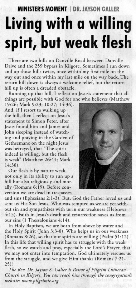 Some of you know that this Lent I have been trying both to eat healthier and to exercise more‑regularly, and some of you know that I have not been doing all that well with either the diet or the exercise. So, as we again this Lent both hear Readings from the Passion of our Lord Jesus Christ as drawn from the four Gospel accounts and reflect on key statements or events from the Readings, the statement from tonight’s Reading that particularly resonated with me was Jesus’s statement to Peter that “the spirit indeed is willing, but the flesh is weak” (Matthew 26:41; Mark 14:38). Some of you may even recall my mentioning that passage in connection both with a 2013 Midweek Lenten sermon on the Fourth Petition of the Lord’s Prayer in light of the words and deeds of our Lord’s Passion and with a “Minister’s Moment” I wrote a month or so later in 20‑13 for the Kilgore News Herald. As was implicit on both of those occasions, I will say explicitly tonight, but already you and I who believe know from our own experience: what Jesus says to Peter is equally true of us: “the spirit is willing, but the flesh is weak”.