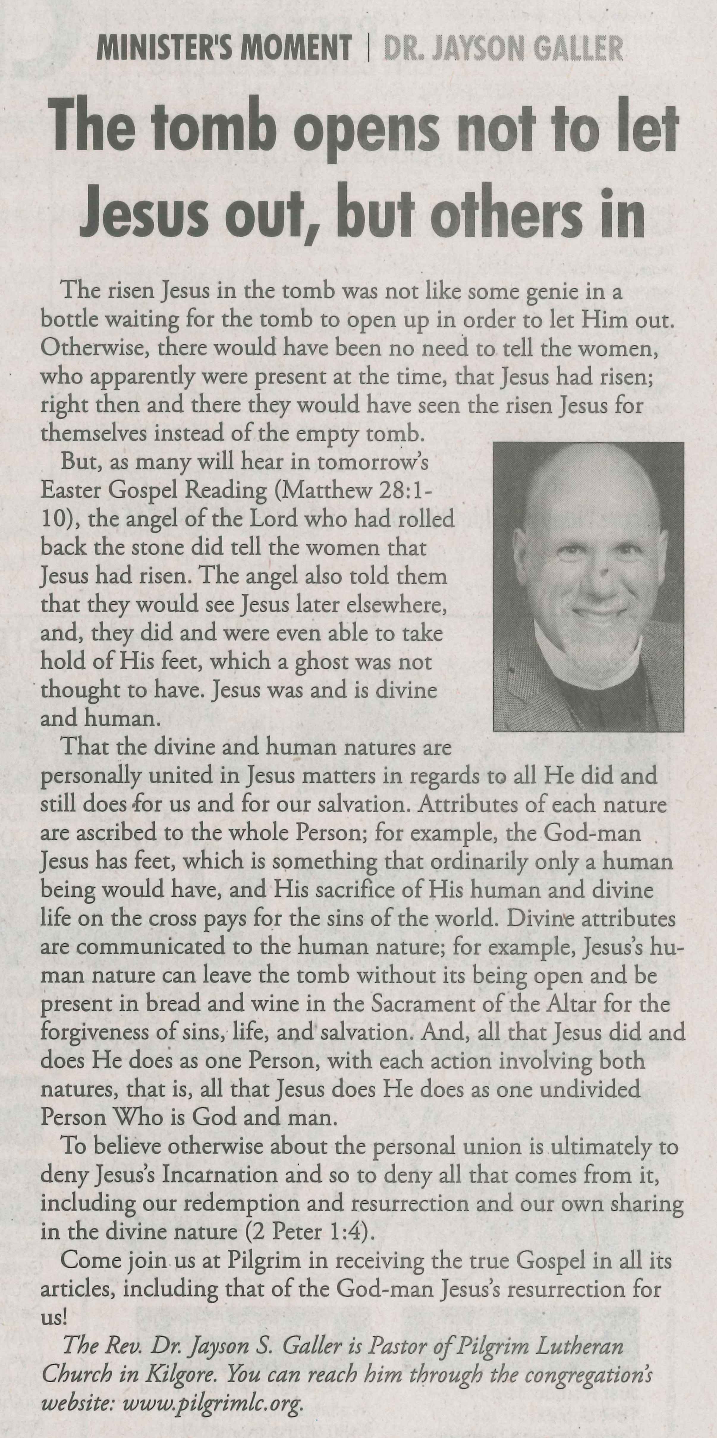 Note well that St. Matthew tells us that the women came up and took hold of Jesus’s feet and worshiped Him. If you read my column for yesterday’s newspaper (copies of which are available in the Narthex) you may know, or you may know otherwise, that the women’s taking hold of Jesus’s feet is important because, since ghosts were not thought to have feet, the women’s taking hold of Jesus’s feet emphasizes that Jesus was resurrected with a body, the feet as a part for the whole. And, the women were on their knees not only taking hold of Jesus’s feet but also worshiping Him, perhaps both giving Him reverence and seeking His mercy and grace, such as by seeking the forgiveness of sins. We believe, teach, and confess that the highest worship of the Gospel is to seek and receive the forgiveness of sins from God in the ways that that He has given for us to receive that forgiveness, namely through His Word and Sacraments. We think of Baptism, in which we are buried and raised with Jesus, as St. Paul tells the Colossians (2:12), verses before today’s Epistle Reading (Colossians 3:1-4). And, we think of the Sacrament of the Altar, where we take hold of Jesus’s resurrected Body and Blood that had been given and shed for us for the forgiveness of our sins.