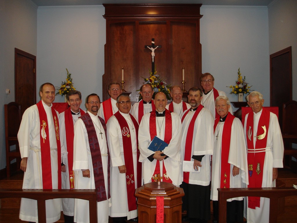 With the new reredos in the background and part of the new communion rail in the foreground, shown are the pastors attending the 60th Anniversary Vespers service (left to right): The Rev. Mark Dahn of Trinity, Tyler; The Rev. Dr. Scott R. Murray of Memorial, Houston (guest preacher); The Rev. Art L. Hill of Trinity, Tyler; The Rev. Vic Willmann, retired, of Tyler; The Rev. Eloy Gonzalez of Our Redeemer, Irving (Vice President of Texas District Area B); The Rev. Toby Byrd of Grace, Paris; The Rev. Dr. Jayson S. Galler (Pilgrim’s current pastor); The Rev. Frank Starr, retired, of Lufkin (Pilgrim’s most-recent vacancy pastor who served as one of the lectors for the occasion); The Rev. Michael Monterastelli of First, Lufkin; The Rev. Dennis J. Bragdon of Our Redeemer, Longview; The Rev. David R. Bergman of Bethlehem, Palestine (Circuit #14 Counselor and another lector); and The Rev. Harold Wageman, retired, of Overton (Pilgrim’s pastor from 1960-1981 and the third lector). Photo: Gayle Gardner