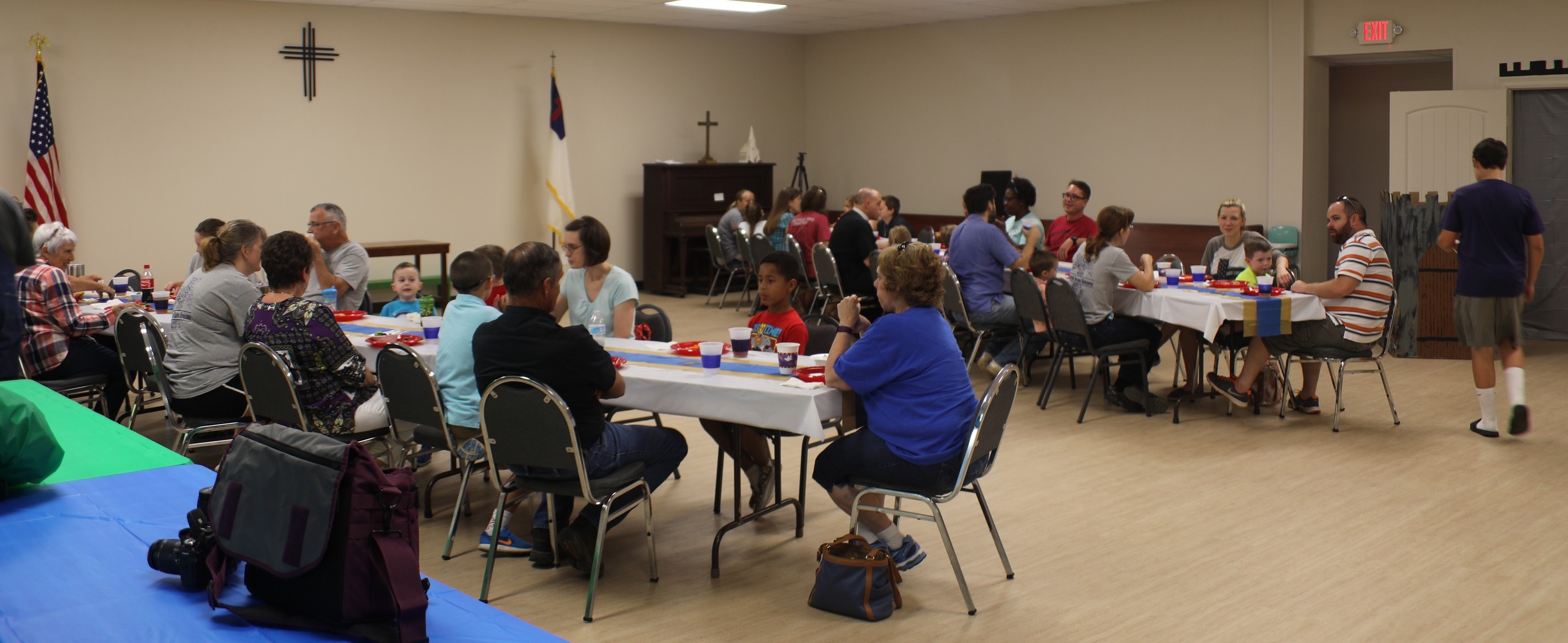 Members and friends of the congregation share the first meal in the new Parish Hall before the first night of Vacation Bible School on July 17, 2017. Such meals before VBS, as those before Advent and Lenten midweek services and those on Sundays before Voters’ Meetings, are just some of the opportunities for people to get to know one another better at Pilgrim Lutheran Church. Photo: Jim & Holly Treadway.