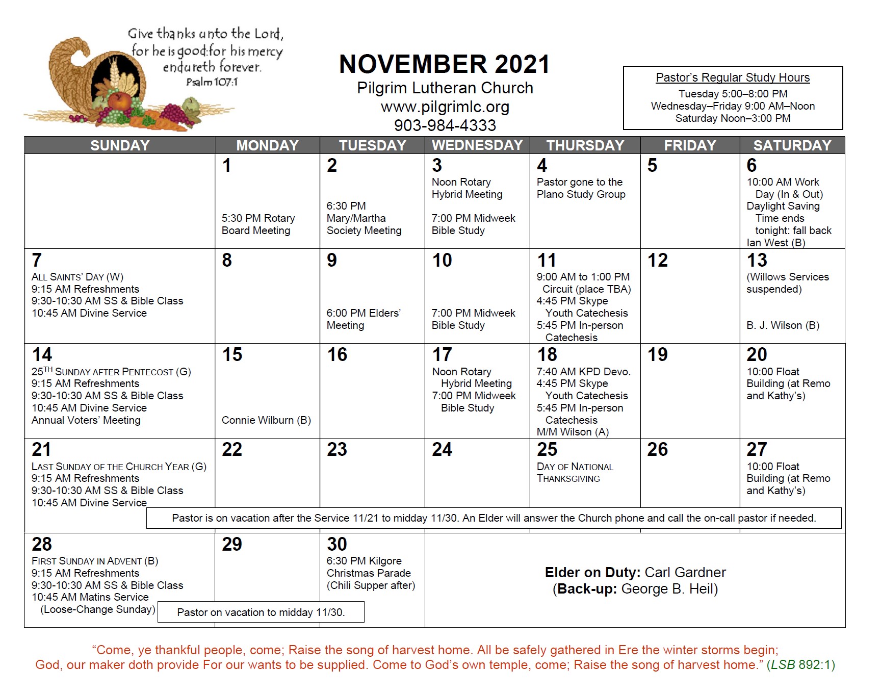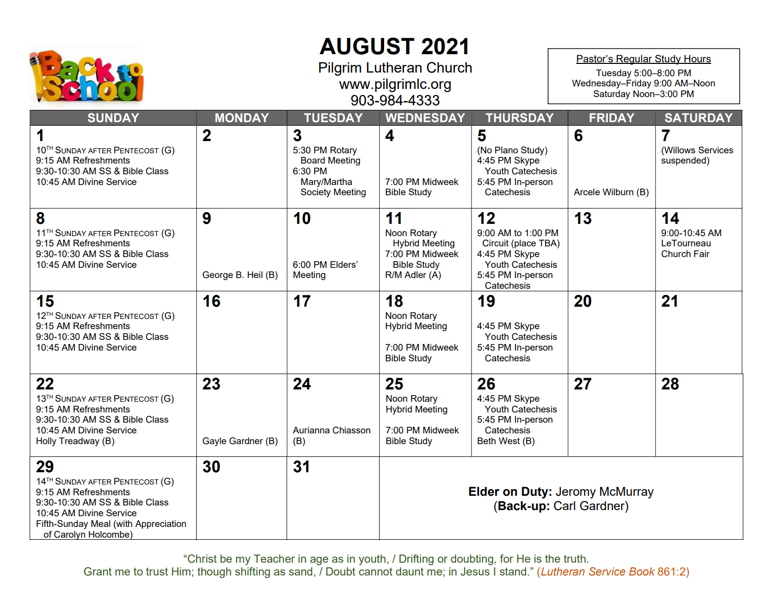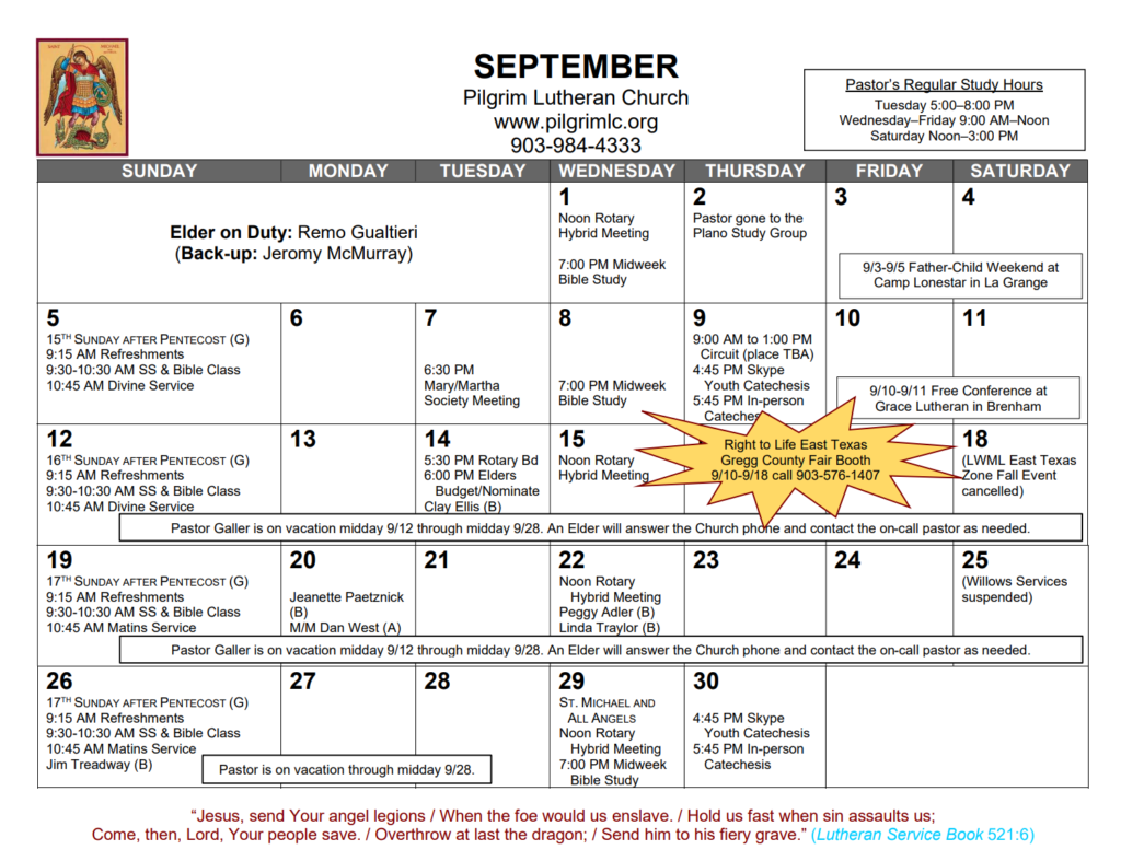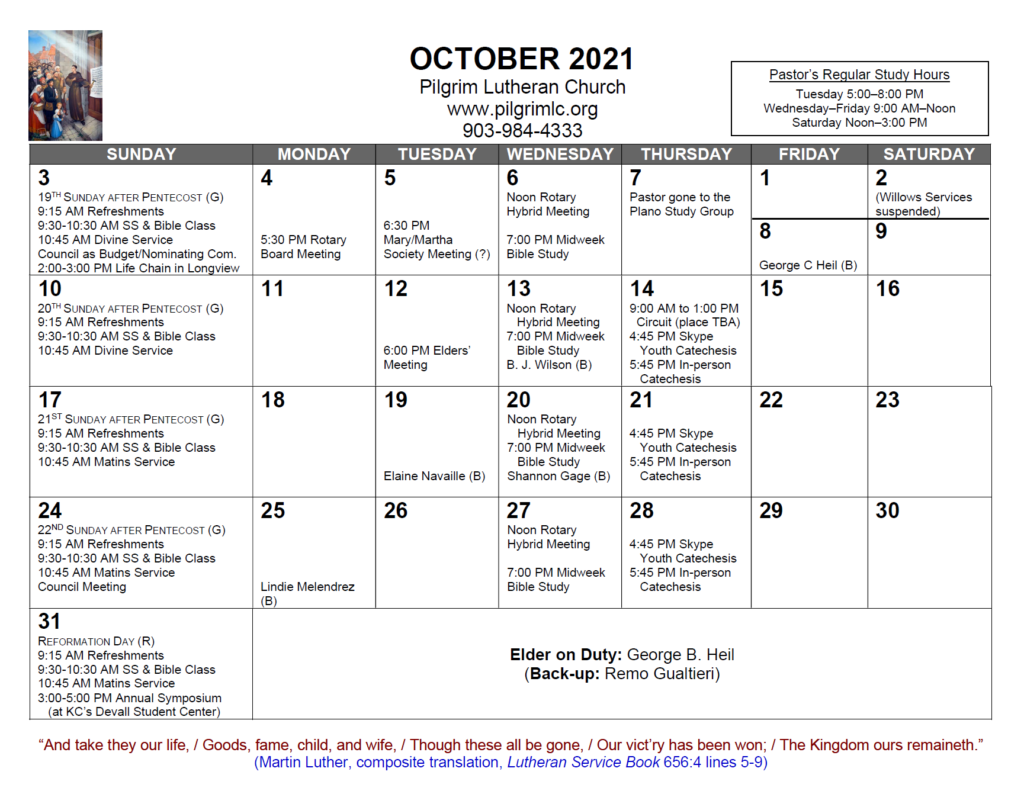 Please note that the services on 10/17, 10/24, and 10/31 will be Divine Services (using Divine Service, Setting Four), not Matins Services, as the calendar errantly indicates. And, in deference to families interested in Trick or Treating, the time for the 10/31 Symposium has since been changed to 2:00-4:00 p.m.