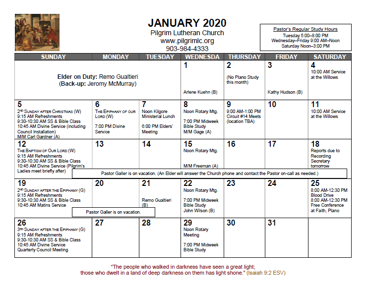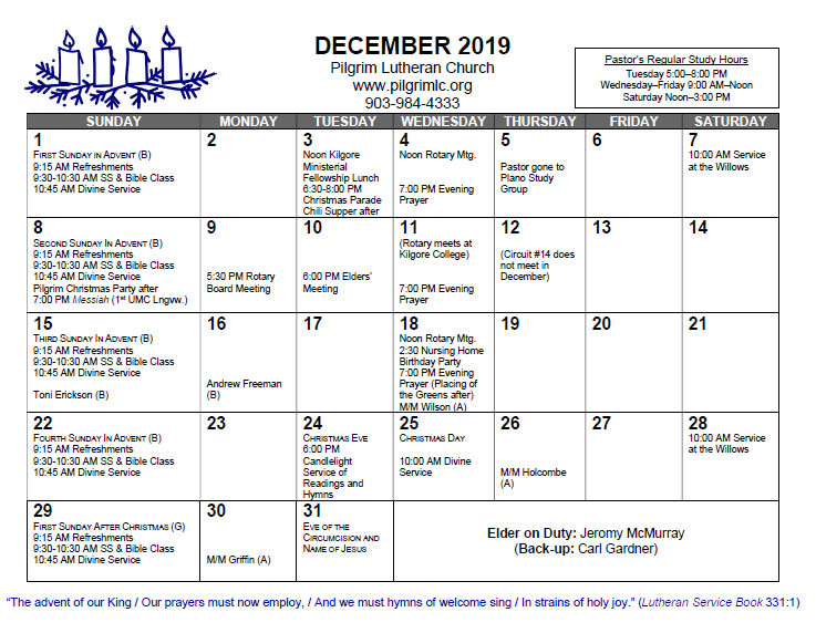 Pastor Galler is normally in his study Tuesdays 5:00-8:00 p.m., Wednesdays through Fridays 9:00 a.m. to Noon, and Saturdays Noon to 3:00 p.m.