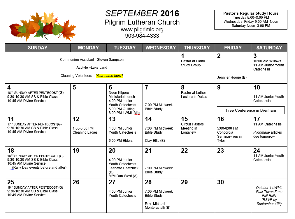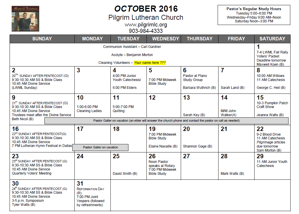 Pastor Galler is normally in his study Tuesdays 5:00-8:00 p.m., Wednesdays through Fridays 9:00 a.m. to Noon, and Saturdays Noon to 3:00 p.m.