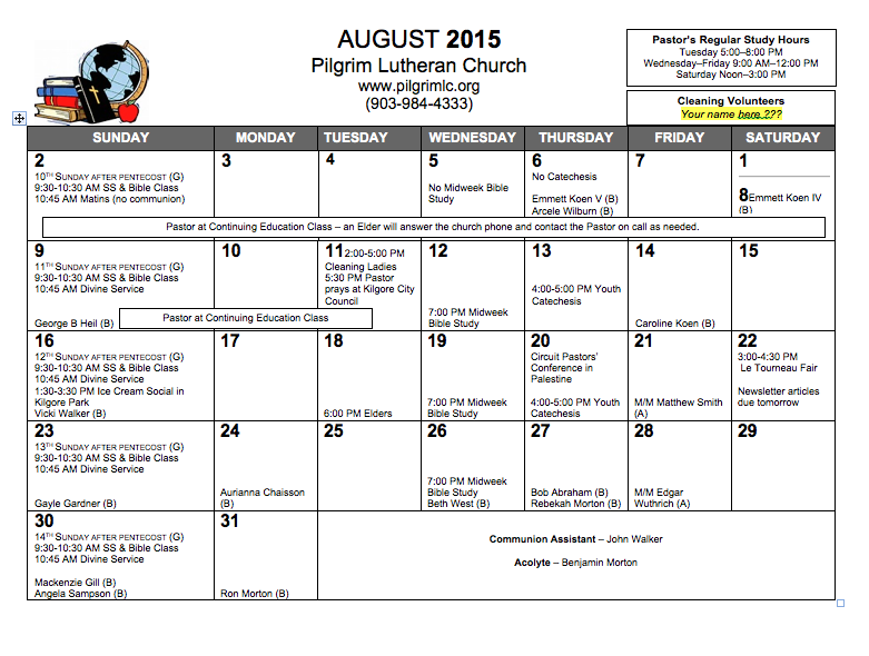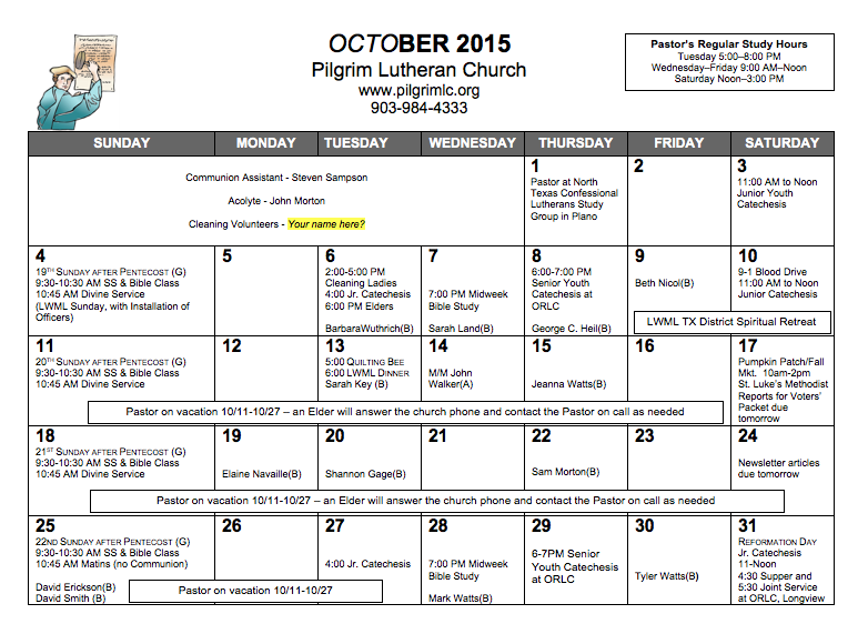 Pastor Galler is normally in his study Tuesdays 5:00-8:00 p.m., Wednesdays through Fridays 9:00 a.m. to Noon, and Saturdays Noon to 3:00 p.m.