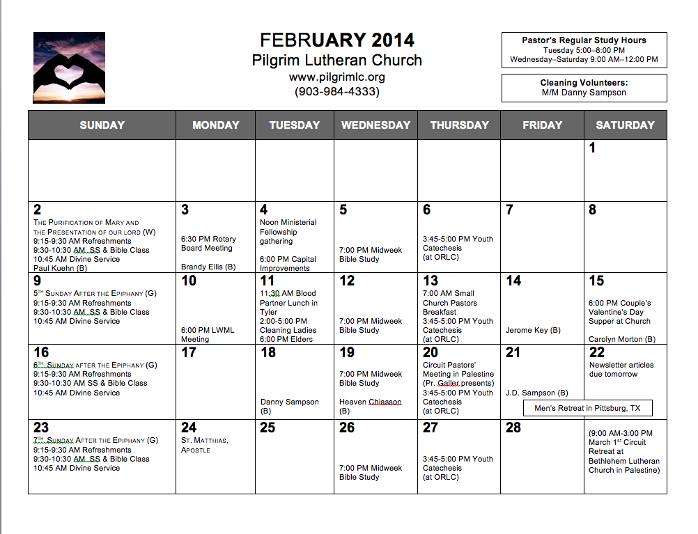 Calendar, February 2014