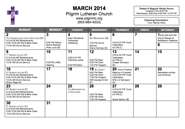 Calendar, March 2014