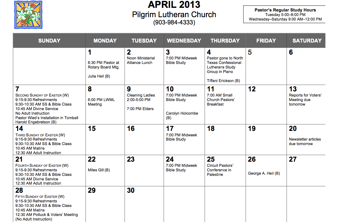 Calendar, April 2013