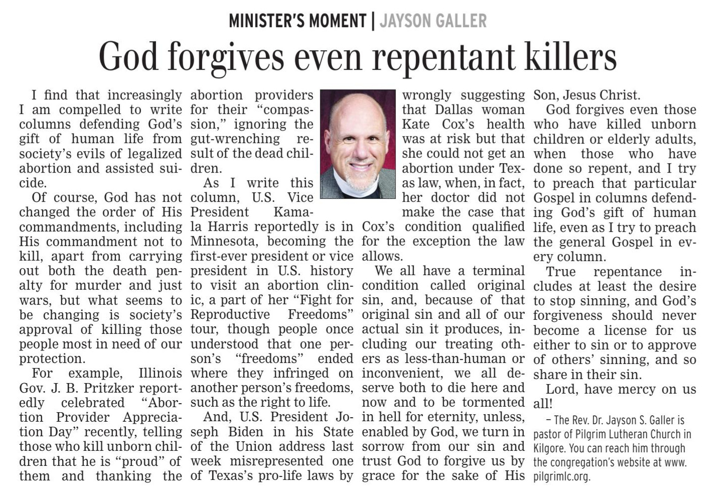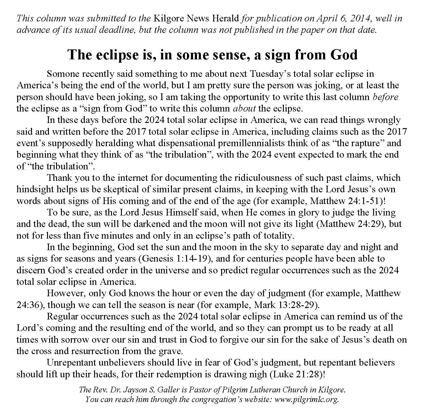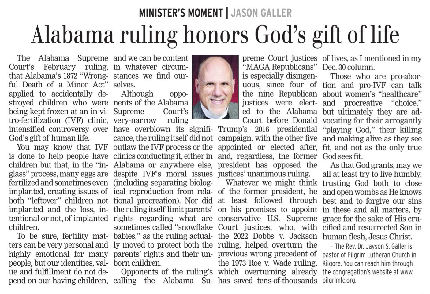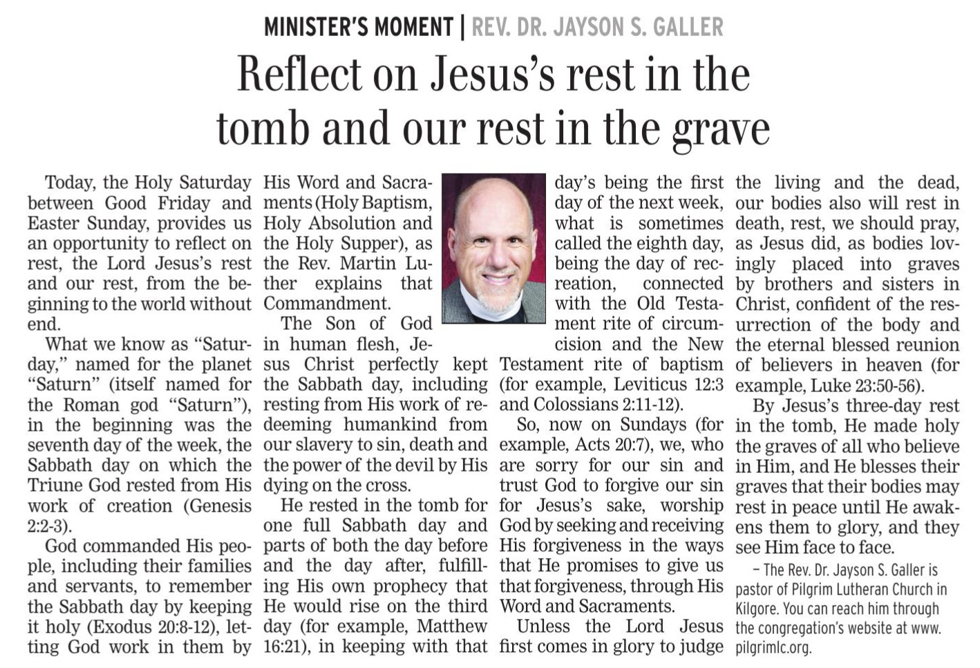 Each Saturday the Kilgore News Herald runs a column written by local pastors titled "Minister's Moment". Pastor Galler's columns currently run the first and third Saturdays of the month. Past columns are posted below (the most-recent first), with an image of the hard copy hosted on this site (which links to a full-screen version of the image), an offsite link to the newspaper's electronic version of the column (available to all for about two weeks after the column's publication and to newspaper subscribers who log-in after that), and any other onsite or offsite links to related content. Pastor Galler welcomes your comments or questions about the past columns and your suggestions for future ones; you can email him at pastor@pilgrimlc.org. (Note that some of Pastor Galler's columns have also run in The Henderson News.)