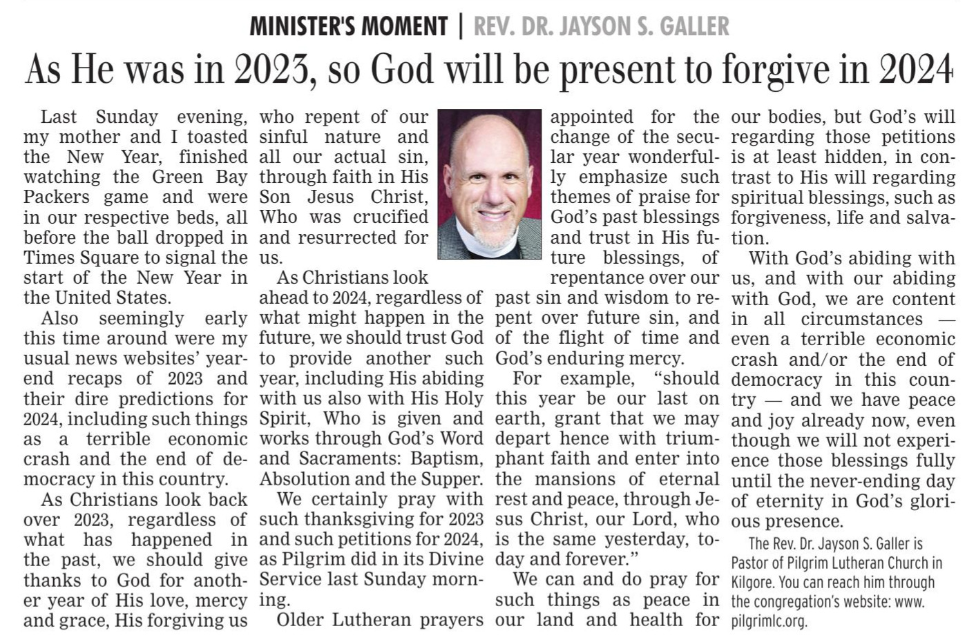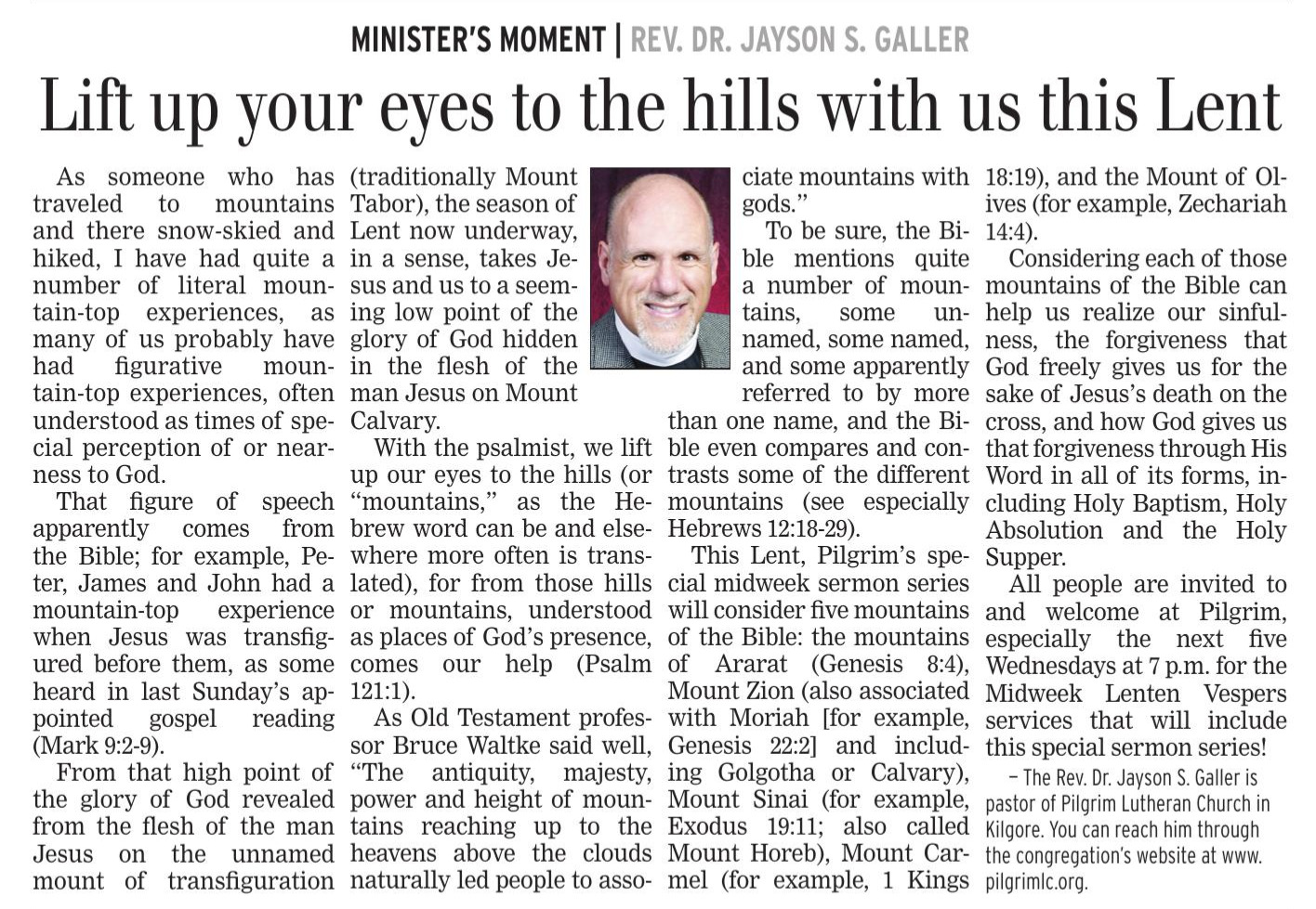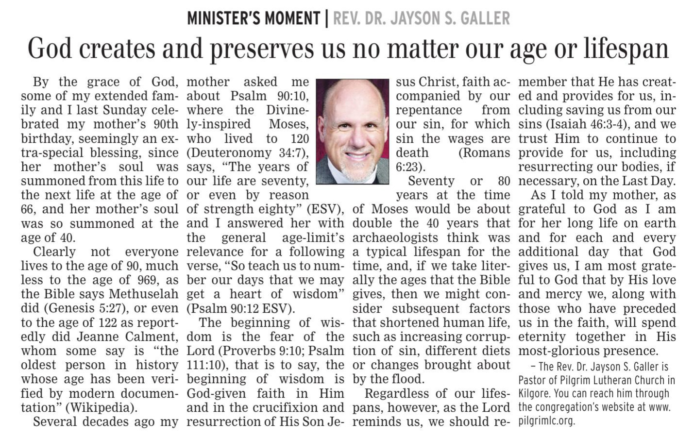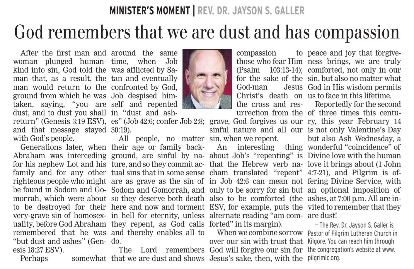 Each Saturday the Kilgore News Herald runs a column written by local pastors titled "Minister's Moment". Pastor Galler's columns currently run the first and third Saturdays of the month. Past columns are posted below (the most-recent first), with an image of the hard copy hosted on this site (which links to a full-screen version of the image), an offsite link to the newspaper's electronic version of the column (available to all for about two weeks after the column's publication and to newspaper subscribers who log-in after that), and any other onsite or offsite links to related content. Pastor Galler welcomes your comments or questions about the past columns and your suggestions for future ones; you can email him at pastor@pilgrimlc.org. (Note that some of Pastor Galler's columns have also run in The Henderson News.)