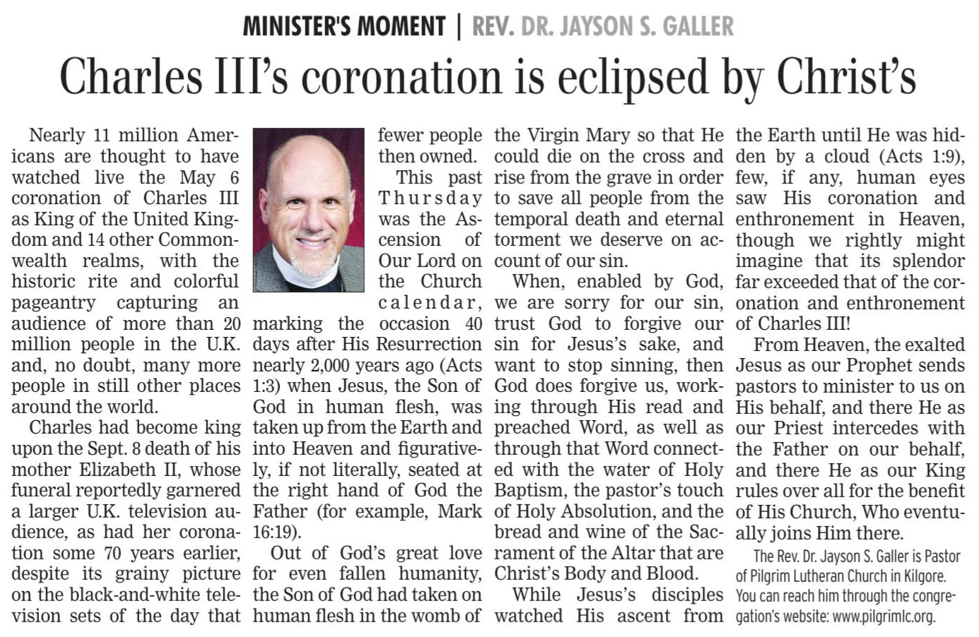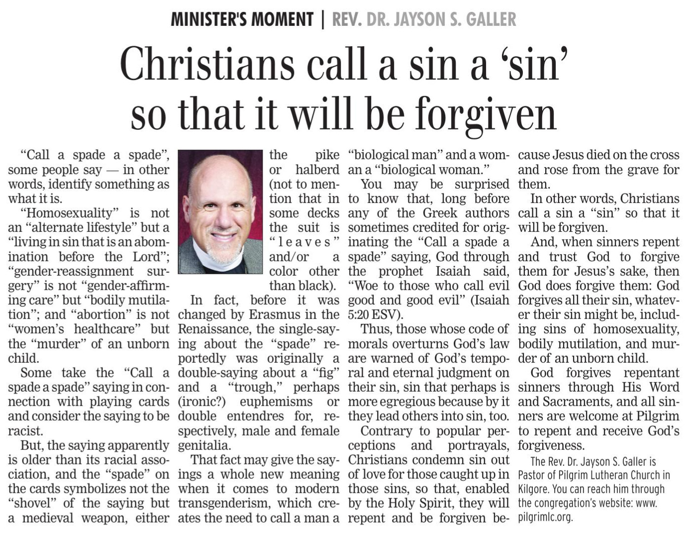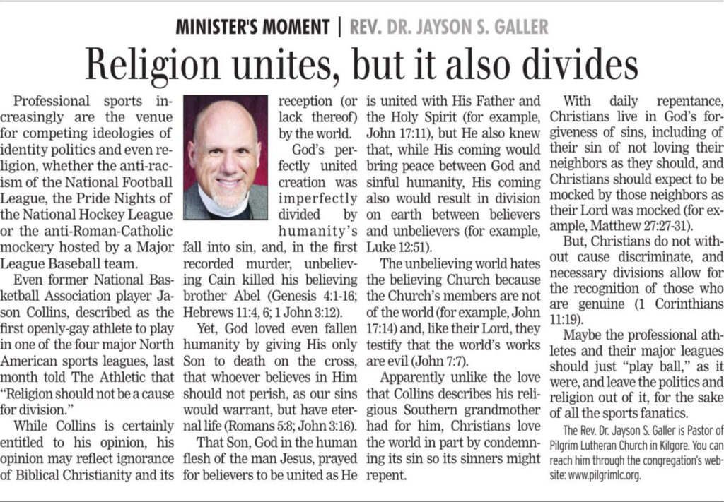 Each Saturday the Kilgore News Herald runs a column written by local pastors titled "Minister's Moment". Pastor Galler's columns currently run the first and third Saturdays of the month. Past columns are posted below (the most-recent first), with an image of the hard copy hosted on this site (which links to a full-screen version of the image), an offsite link to the newspaper's electronic version of the column (available to all for about two weeks after the column's publication and to newspaper subscribers who log-in after that), and any other onsite or offsite links to related content. Pastor Galler welcomes your comments or questions about the past columns and your suggestions for future ones; you can email him at pastor@pilgrimlc.org. (Note that some of Pastor Galler's columns have also run in The Henderson News.)