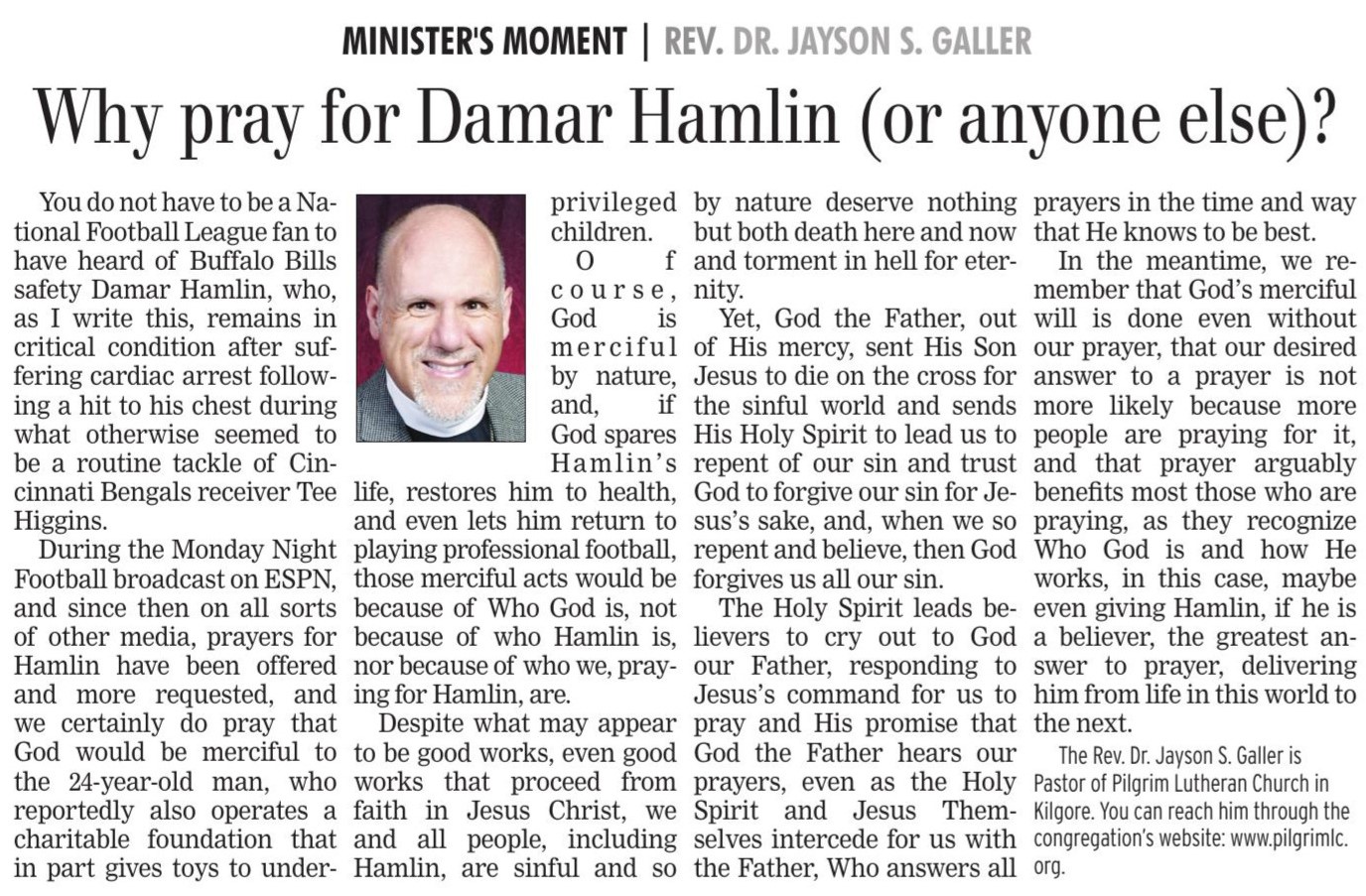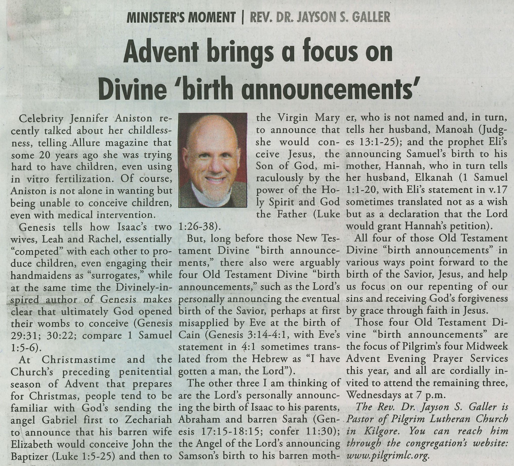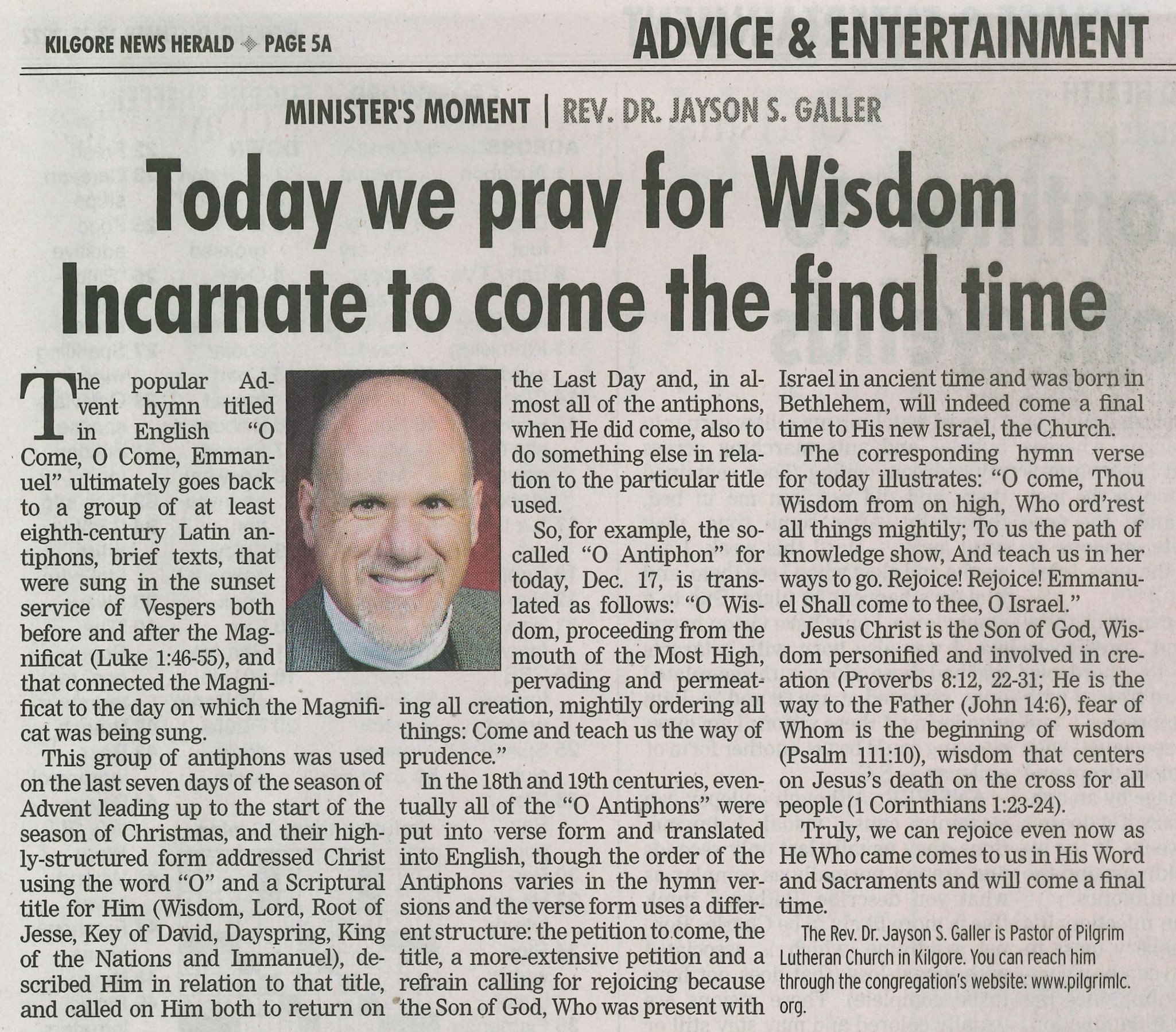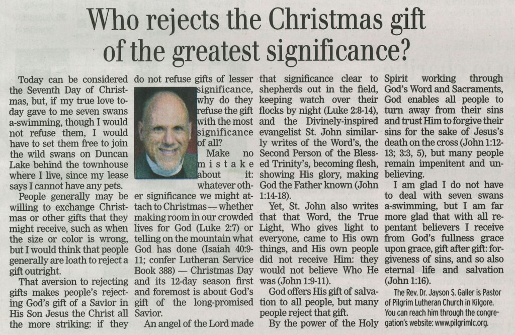 Each Saturday the Kilgore News Herald runs a column written by local pastors titled "Minister's Moment". Pastor Galler's columns currently run the first and third Saturdays of the month. Past columns are posted below (the most-recent first), with an image of the hard copy hosted on this site (which links to a full-screen version of the image), an offsite link to the newspaper's electronic version of the column (available to all for about two weeks after the column's publication and to newspaper subscribers who log-in after that), and any other onsite or offsite links to related content. Pastor Galler welcomes your comments or questions about the past columns and your suggestions for future ones; you can email him at pastor@pilgrimlc.org. (Note that some of Pastor Galler's columns have also run in The Henderson News.)