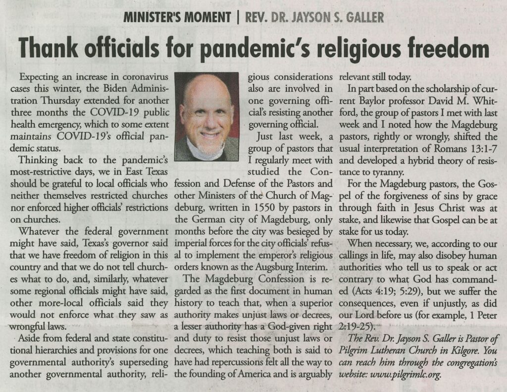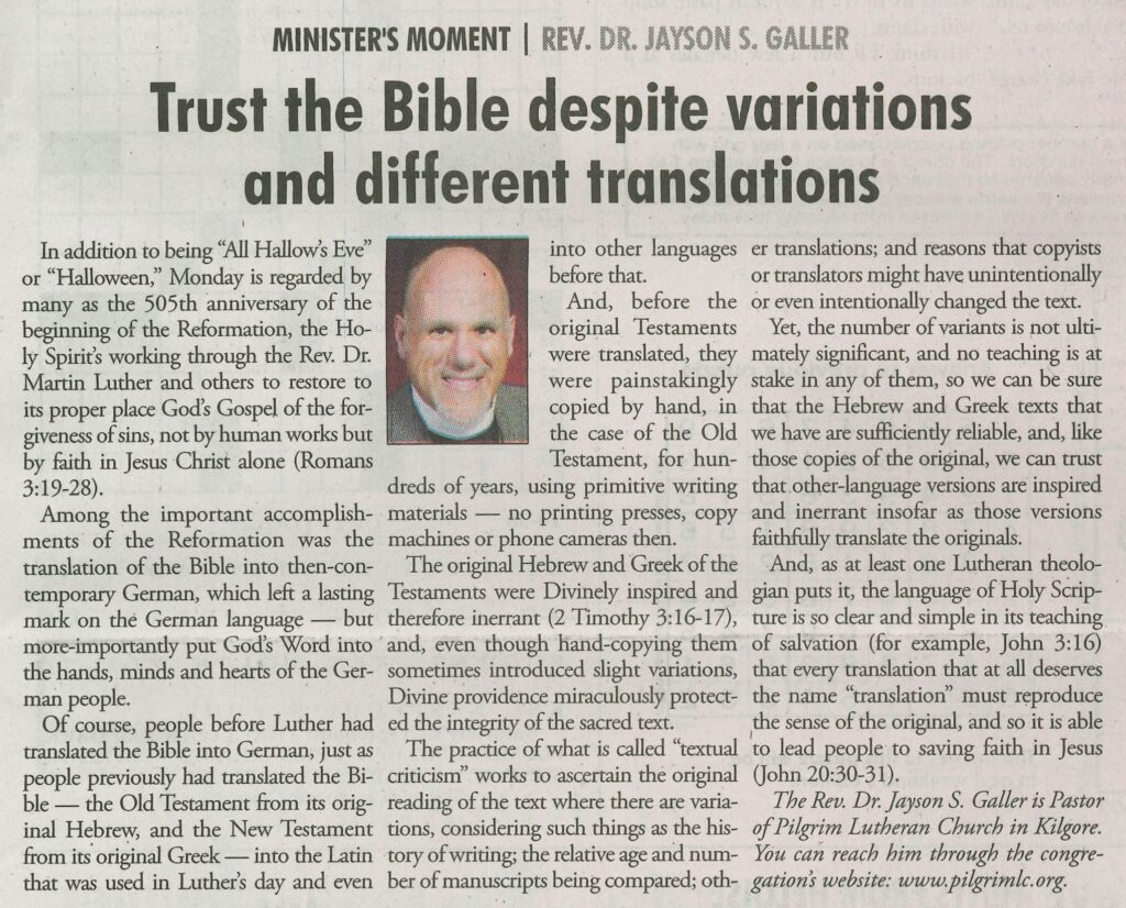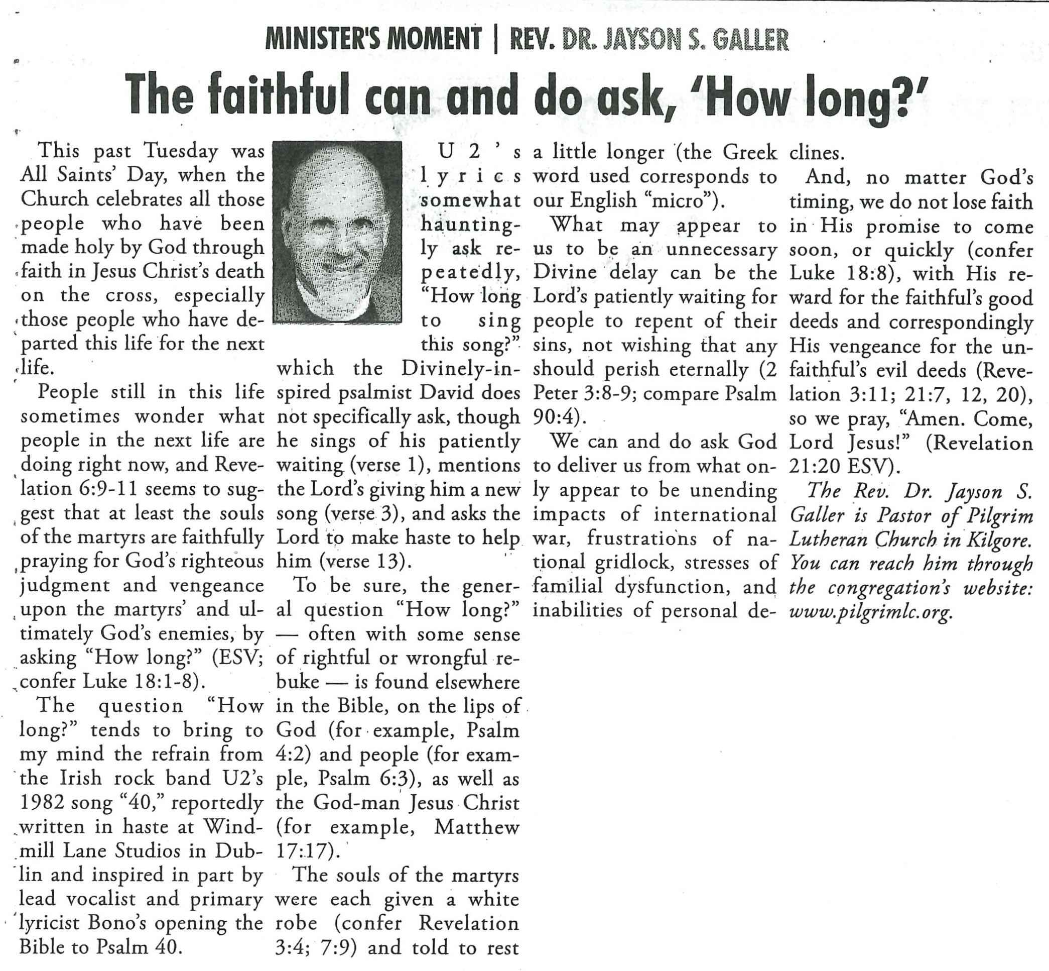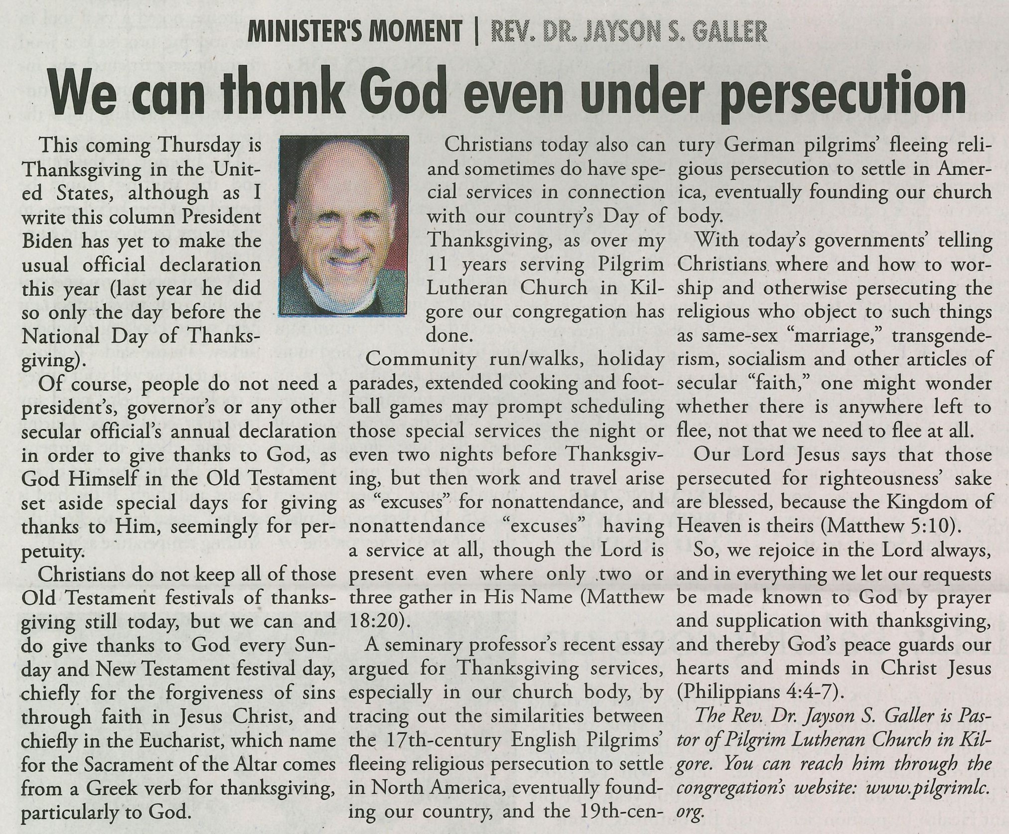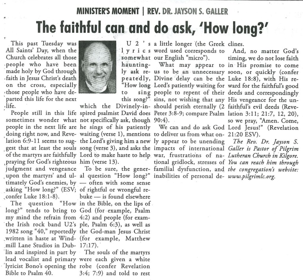 Each Saturday the Kilgore News Herald runs a column written by local pastors titled "Minister's Moment". Pastor Galler's columns currently run the first and third Saturdays of the month. Past columns are posted below (the most-recent first), with an image of the hard copy hosted on this site (which links to a full-screen version of the image), an offsite link to the newspaper's electronic version of the column (available to all for about two weeks after the column's publication and to newspaper subscribers who log-in after that), and any other onsite or offsite links to related content. Pastor Galler welcomes your comments or questions about the past columns and your suggestions for future ones; you can email him at pastor@pilgrimlc.org. (Note that some of Pastor Galler's columns have also run in The Henderson News.)