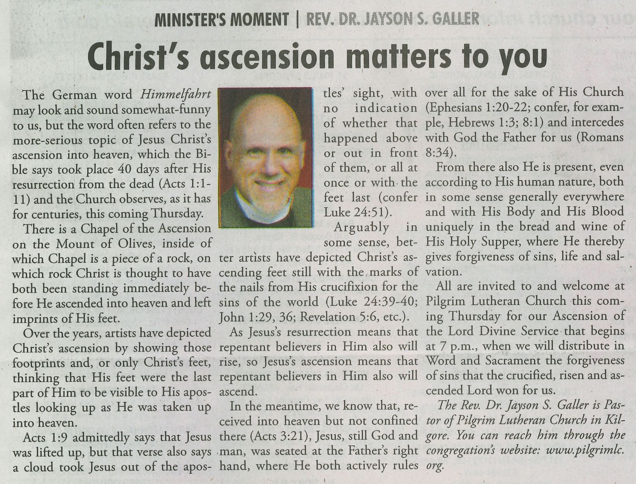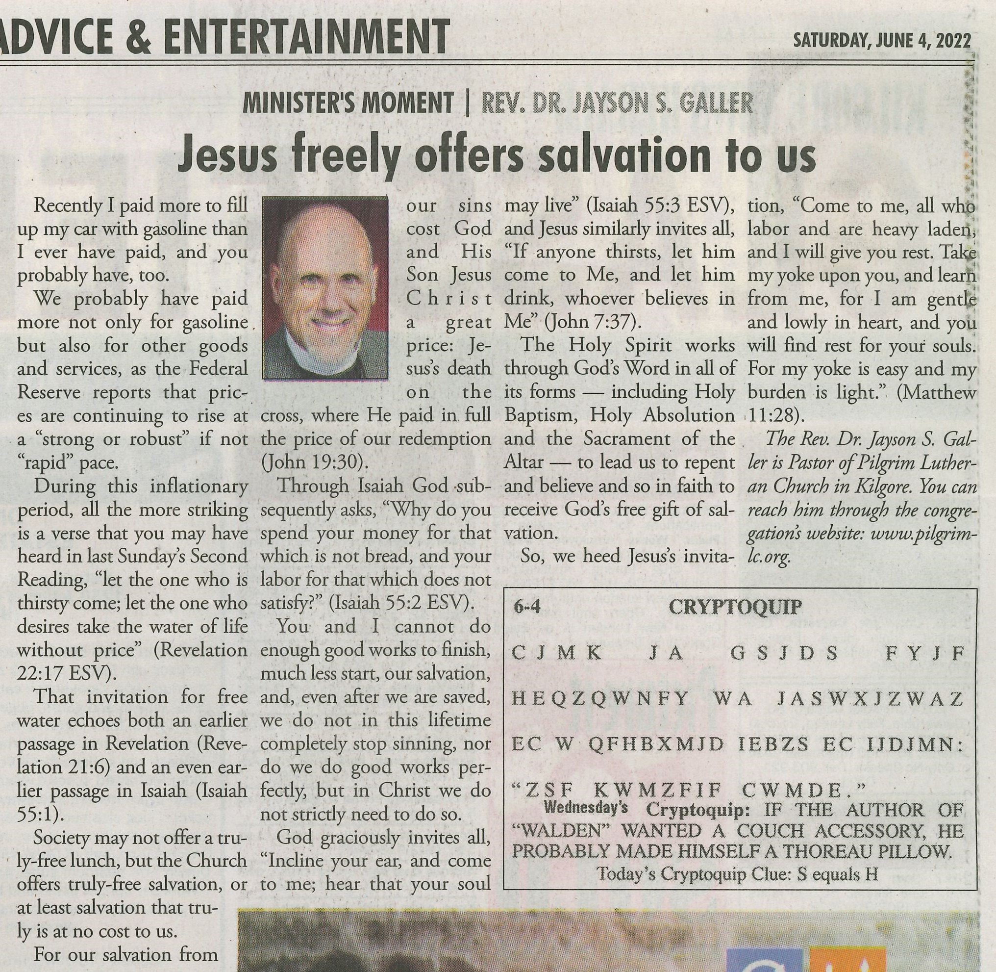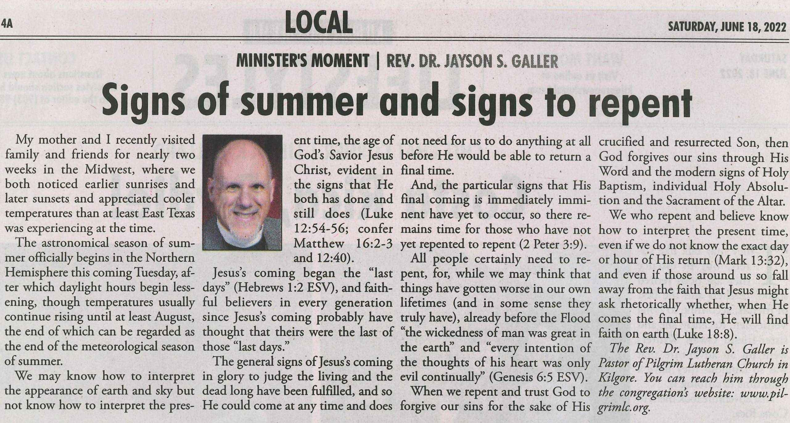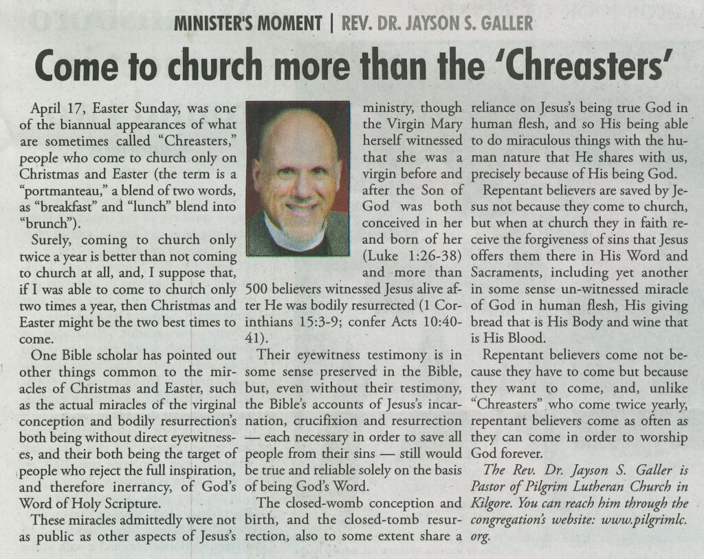 Each Saturday the Kilgore News Herald runs a column written by local pastors titled "Minister's Moment". Pastor Galler's columns currently run the first and third Saturdays of the month. Past columns are posted below (the most-recent first), with an image of the hard copy hosted on this site (which links to a full-screen version of the image), an offsite link to the newspaper's electronic version of the column (available to all for about two weeks after the column's publication and to newspaper subscribers who log-in after that), and any other onsite or offsite links to related content. Pastor Galler welcomes your comments or questions about the past columns and your suggestions for future ones; you can email him at pastor@pilgrimlc.org. (Note that some of Pastor Galler's columns have also run in The Henderson News.)