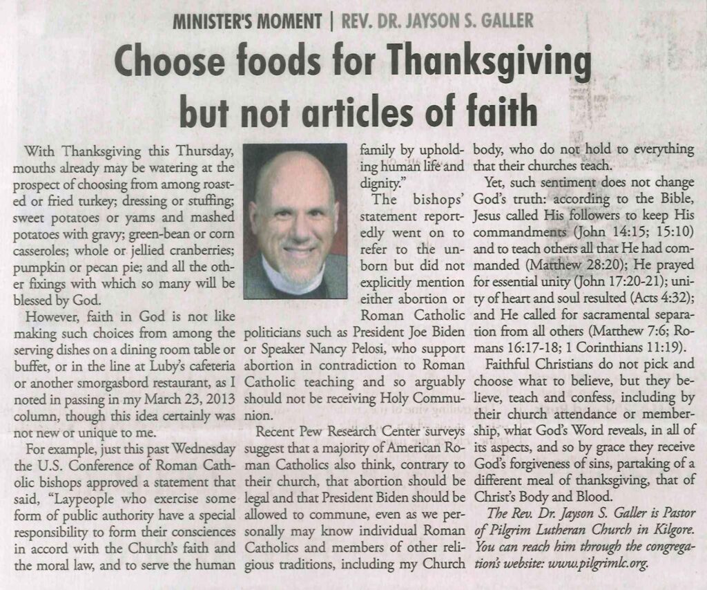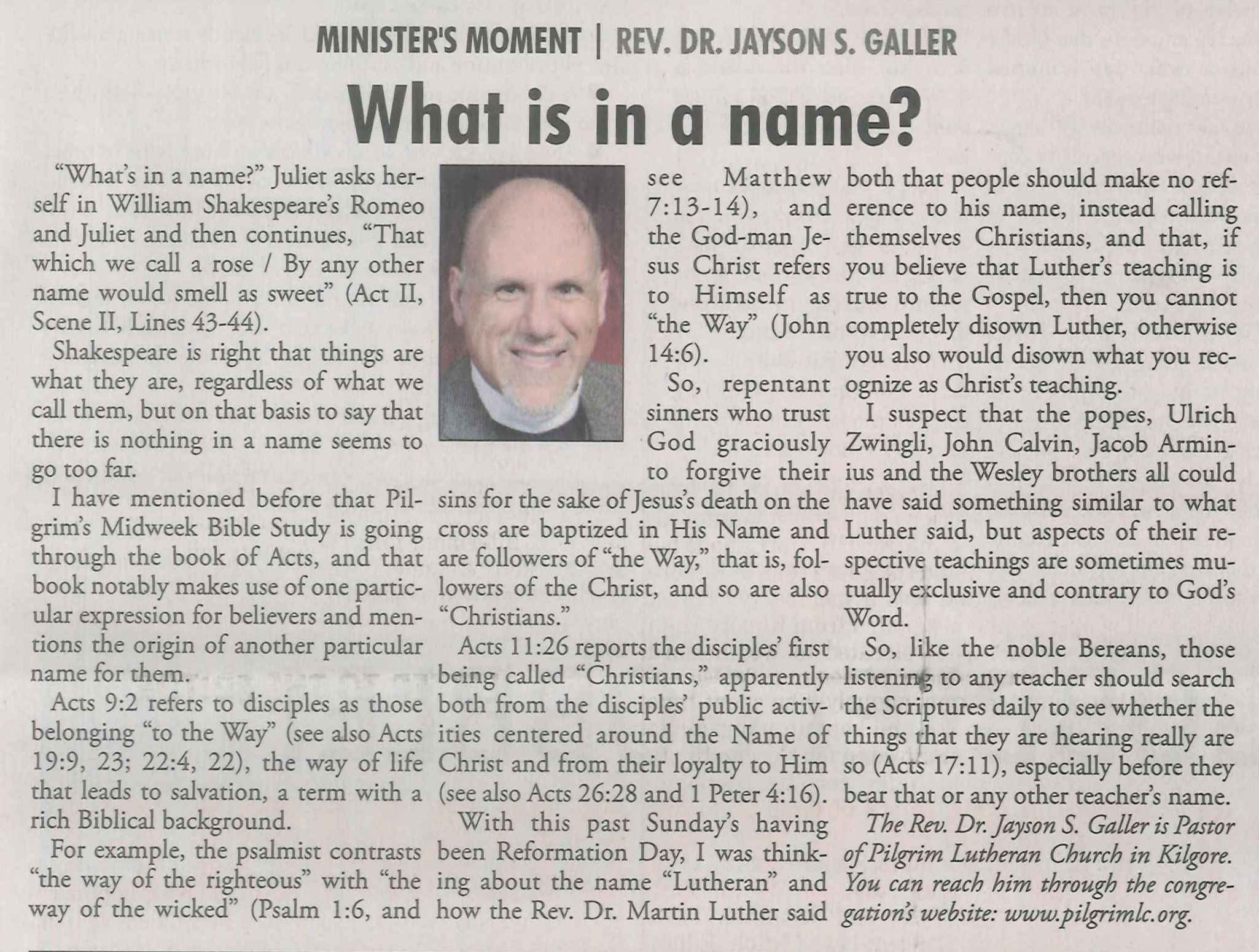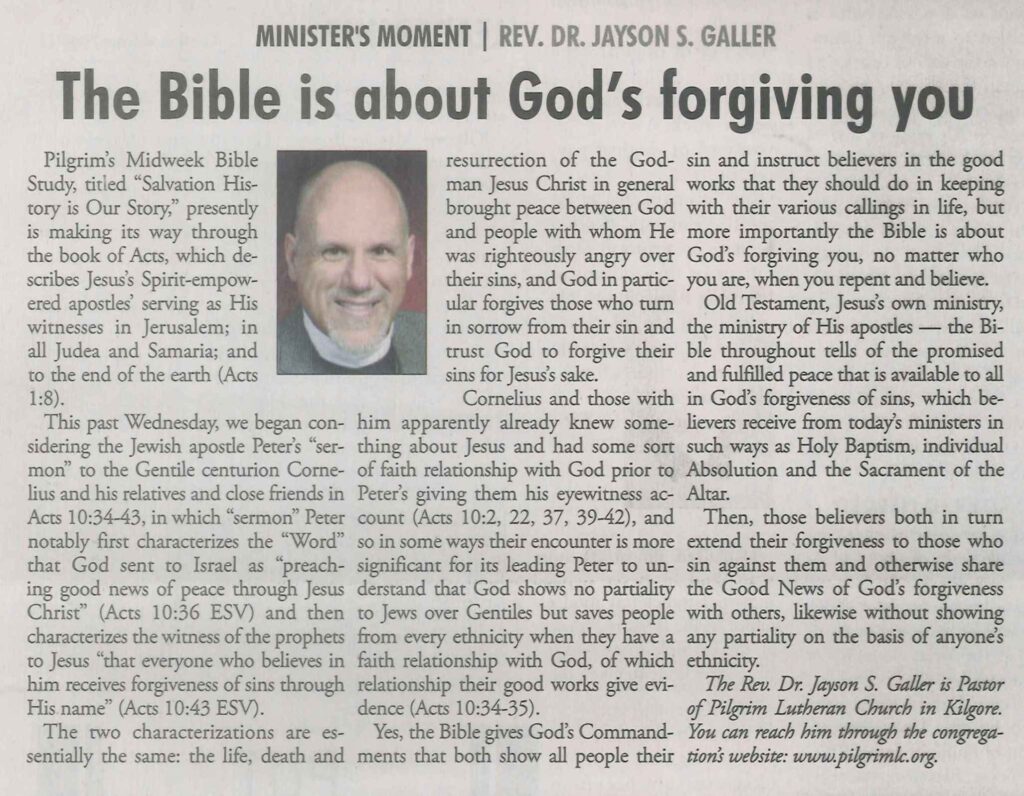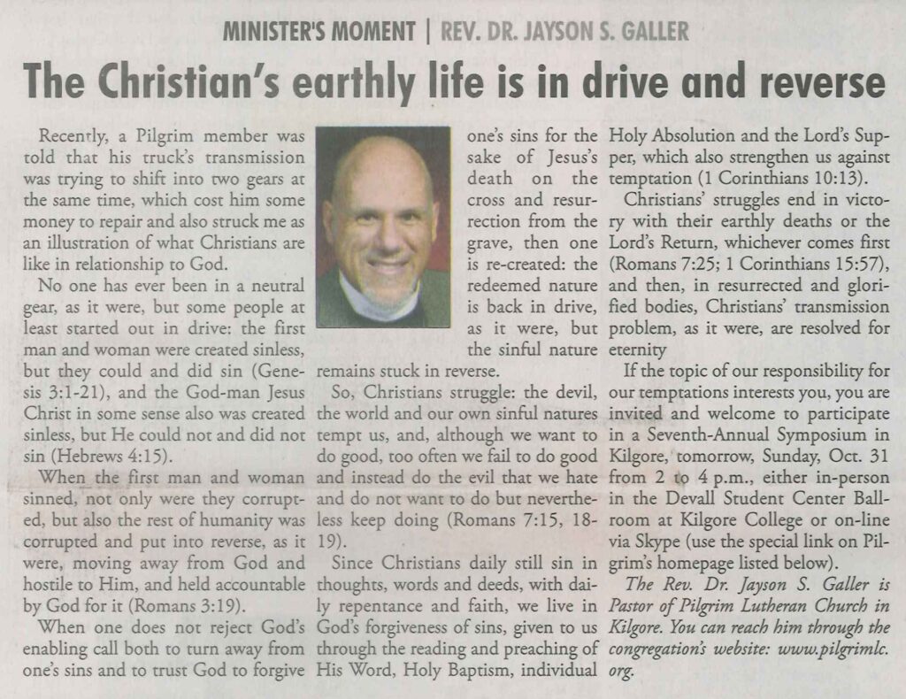 Each Saturday the Kilgore News Herald runs a column written by local pastors titled "Minister's Moment". Pastor Galler's columns currently run the first and third Saturdays of the month. Past columns are posted below (the most-recent first), with an image of the hard copy hosted on this site (which links to a full-screen version of the image), an offsite link to the newspaper's electronic version of the column (available to all for about two weeks after the column's publication and to newspaper subscribers who log-in after that), and any other onsite or offsite links to related content. Pastor Galler welcomes your comments or questions about the past columns and your suggestions for future ones; you can email him at pastor@pilgrimlc.org. (Note that some of Pastor Galler's columns have also run in The Henderson News.)