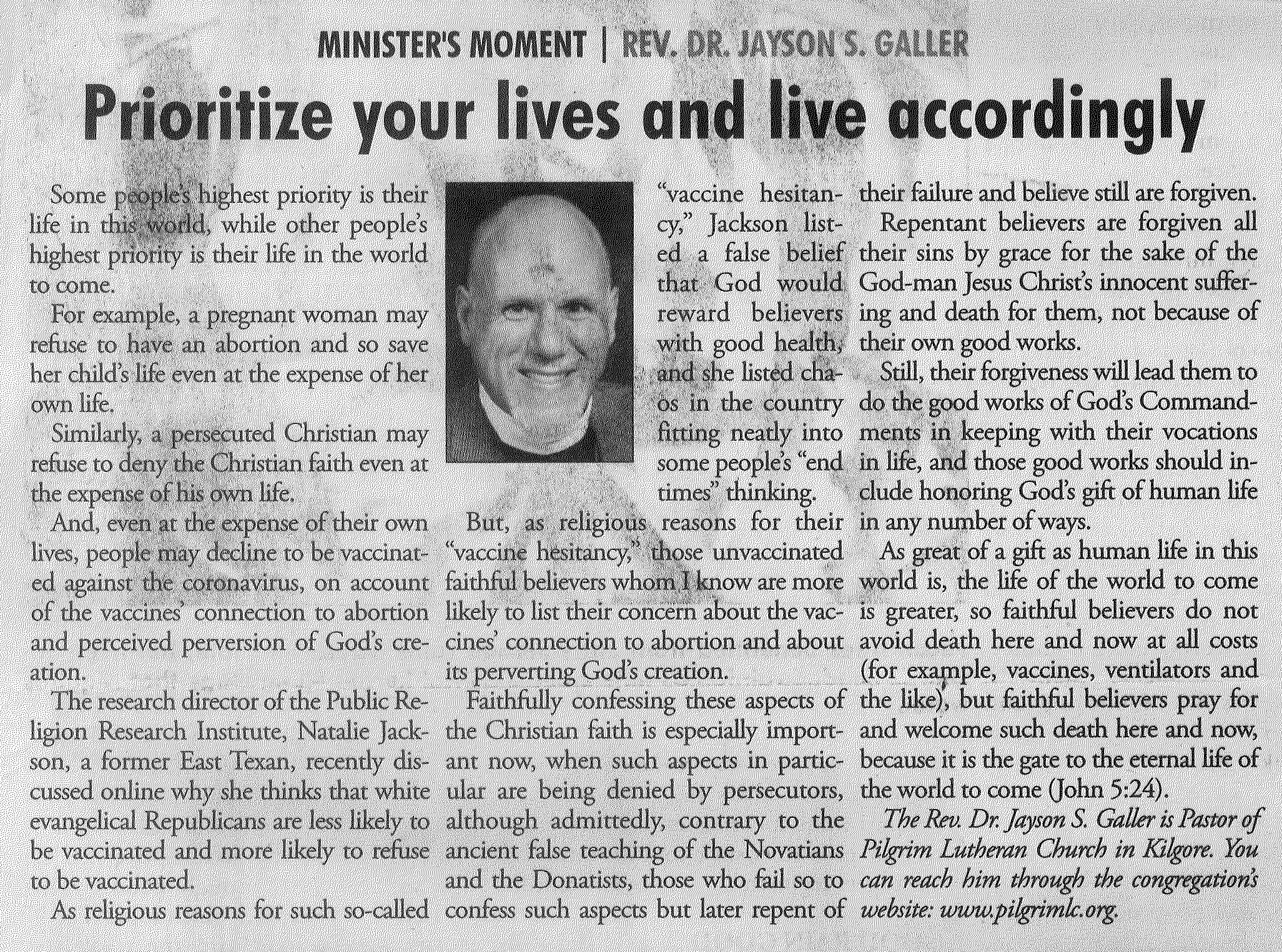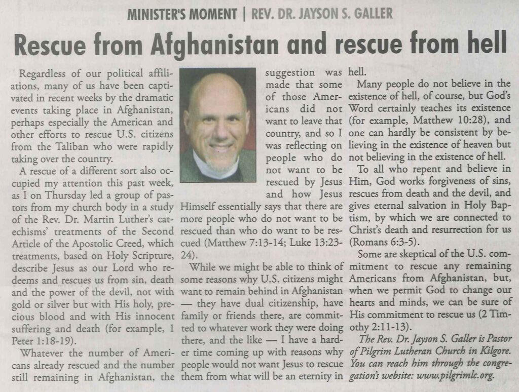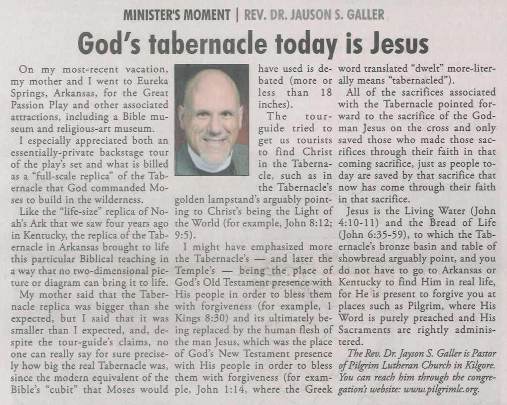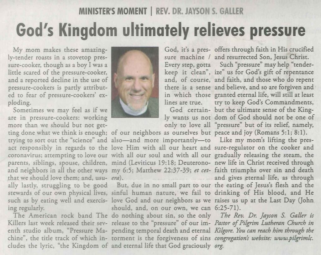 Each Saturday the Kilgore News Herald runs a column written by local pastors titled "Minister's Moment". Pastor Galler's columns currently run the first and third Saturdays of the month. Past columns are posted below (the most-recent first), with an image of the hard copy hosted on this site (which links to a full-screen version of the image), an offsite link to the newspaper's electronic version of the column (available to all for about two weeks after the column's publication and to newspaper subscribers who log-in after that), and any other onsite or offsite links to related content. Pastor Galler welcomes your comments or questions about the past columns and your suggestions for future ones; you can email him at pastor@pilgrimlc.org. (Note that some of Pastor Galler's columns have also run in The Henderson News.)