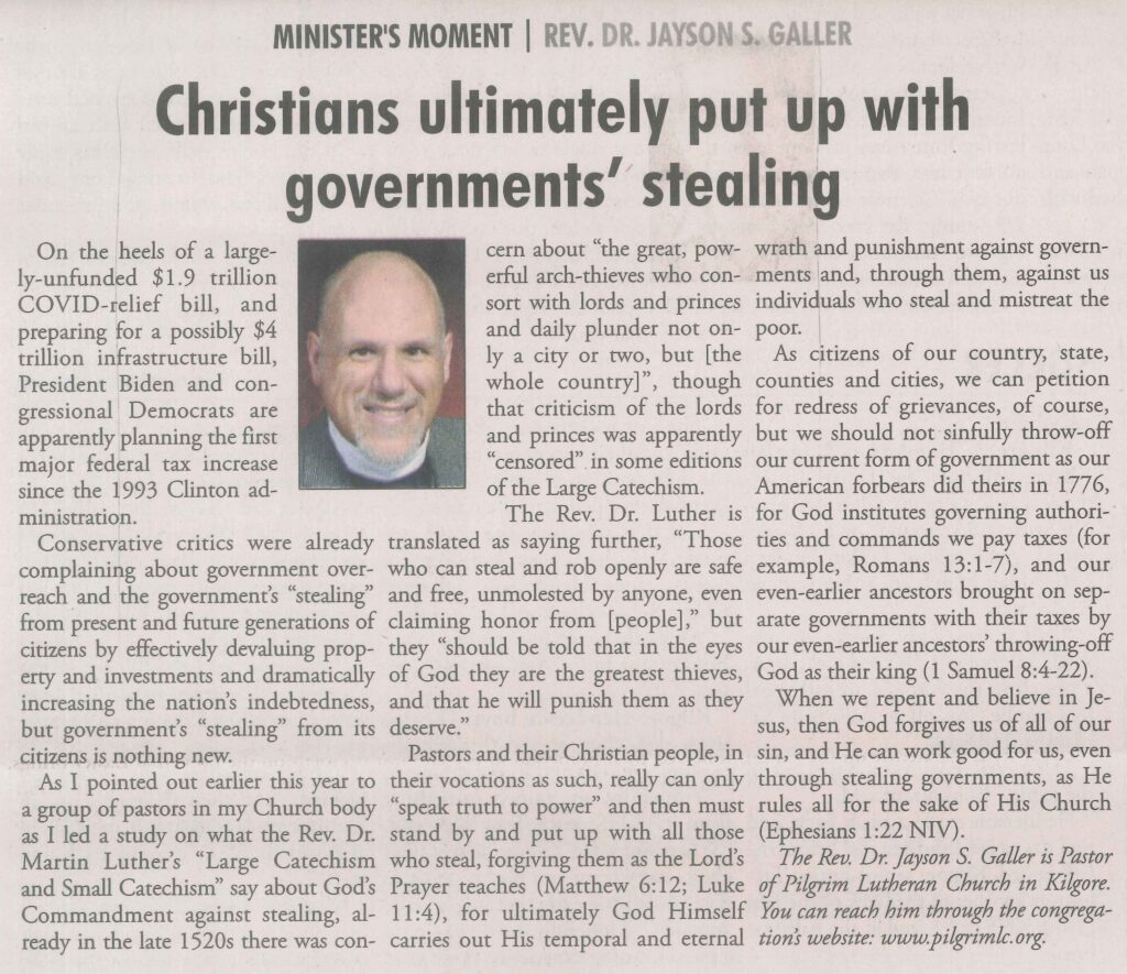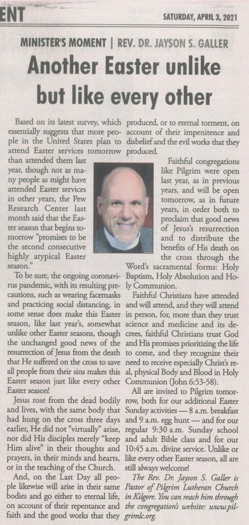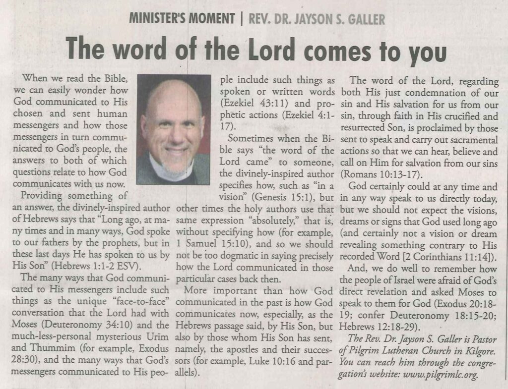 Each Saturday the Kilgore News Herald runs a column written by local pastors titled "Minister's Moment". Pastor Galler's columns currently run the first and third Saturdays of the month. Past columns are posted below (the most-recent first), with an image of the hard copy hosted on this site (which links to a full-screen version of the image), an offsite link to the newspaper's electronic version of the column (available to all for about two weeks after the column's publication and to newspaper subscribers who log-in after that), and any other onsite or offsite links to related content. Pastor Galler welcomes your comments or questions about the past columns and your suggestions for future ones; you can email him at pastor@pilgrimlc.org. (Note that some of Pastor Galler's columns have also run in The Henderson News.)