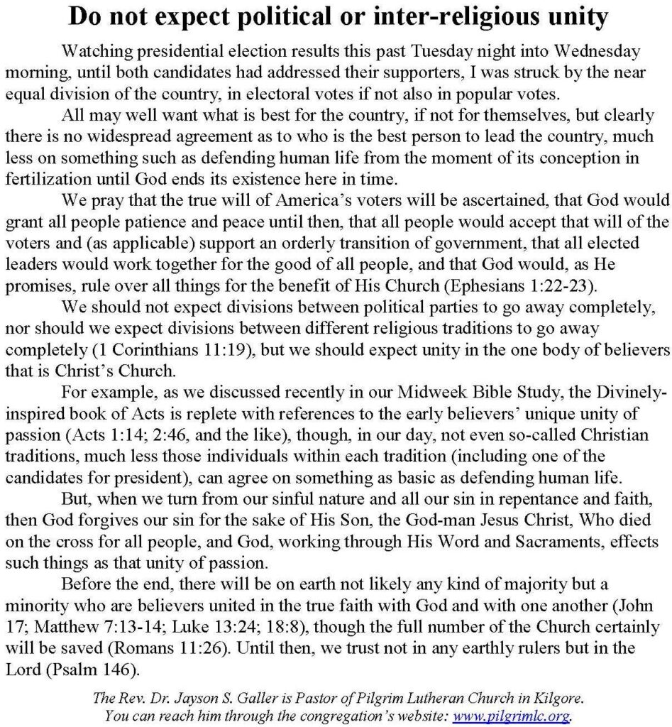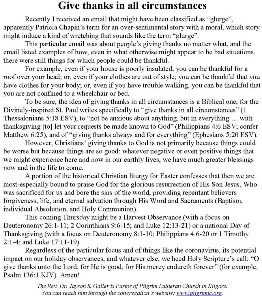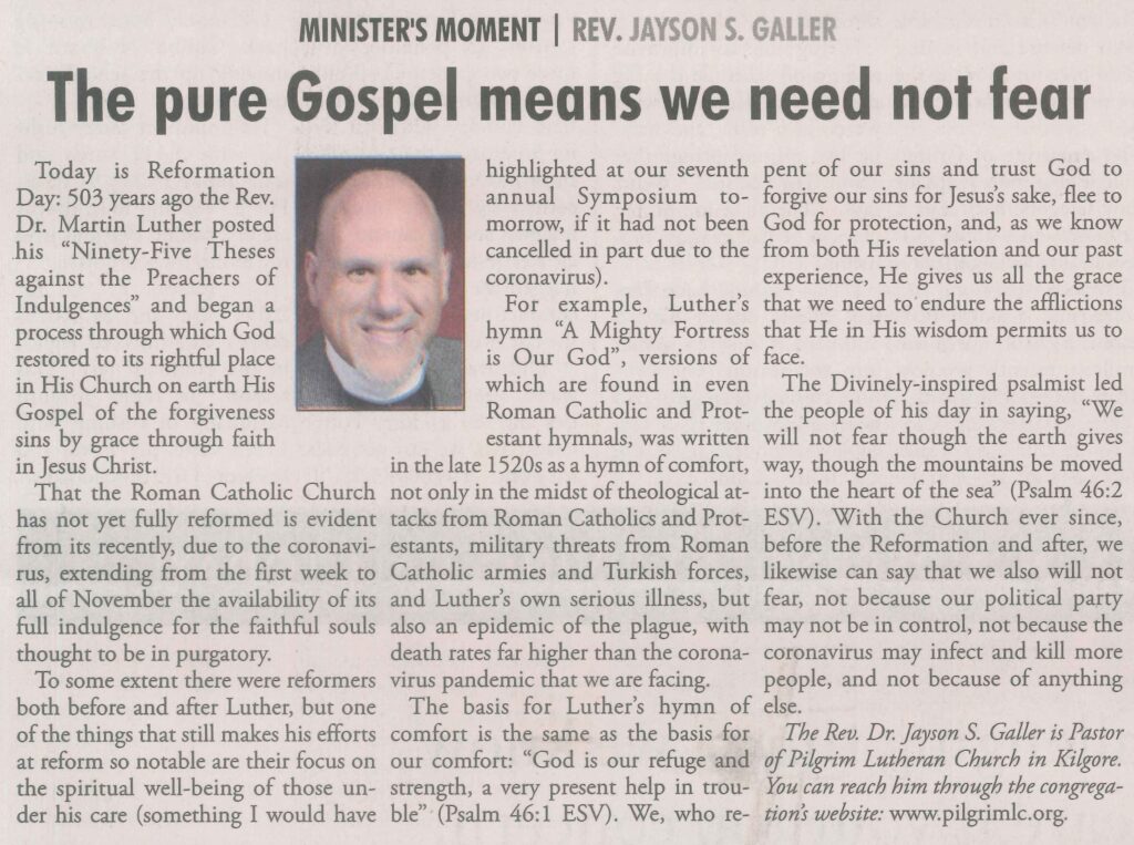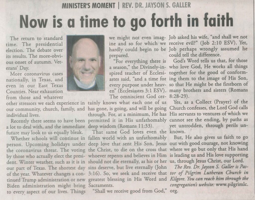 Each Saturday the Kilgore News Herald runs a column written by local pastors titled "Minister's Moment". Pastor Galler's columns currently run the first and third Saturdays of the month. Past columns are posted below (the most-recent first), with an image of the hard copy hosted on this site (which links to a full-screen version of the image), an offsite link to the newspaper's electronic version of the column (available to all for about two weeks after the column's publication and to newspaper subscribers who log-in after that), and any other onsite or offsite links to related content. Pastor Galler welcomes your comments or questions about the past columns and your suggestions for future ones; you can email him at pastor@pilgrimlc.org. (Note that some of Pastor Galler's columns have also run in The Henderson News.)