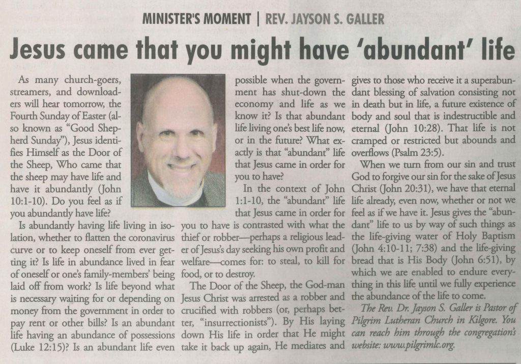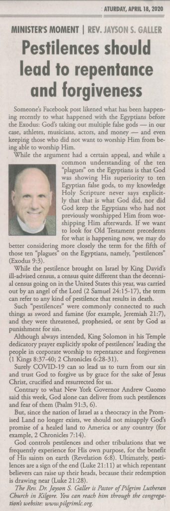 What matters most to us is that the Holy Spirit is sent and does come. For, He leads us to know our sin and to know the Son and so also to know the Father. Through God’s means of grace we receive the Spirit, Who, when and where He pleases, works in us faith that receives the Father’s forgiveness of sins for the sake of the Son crucified for us. And, the Spirit’s renewing us leads us to strive to overcome sin and do good works according to our vocations.