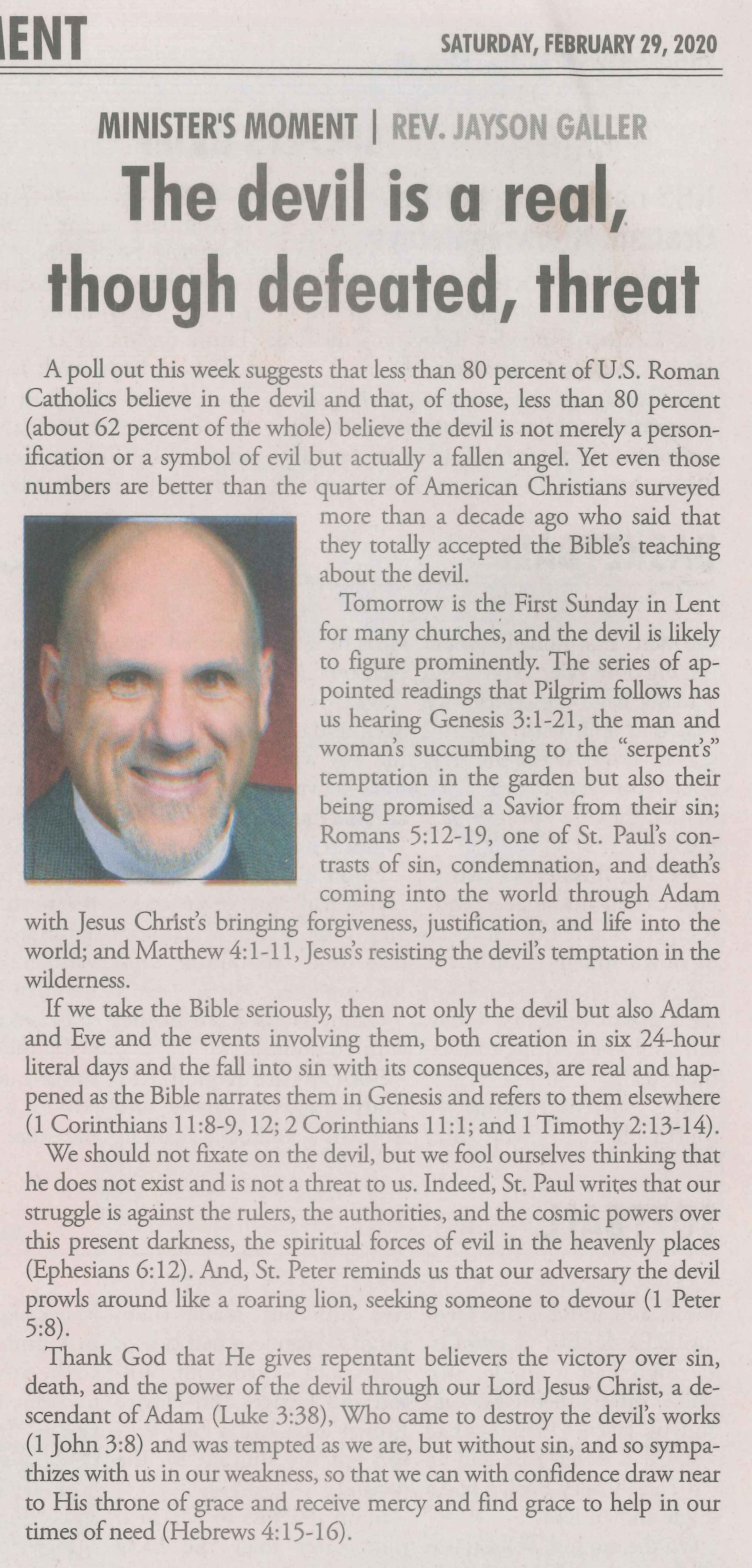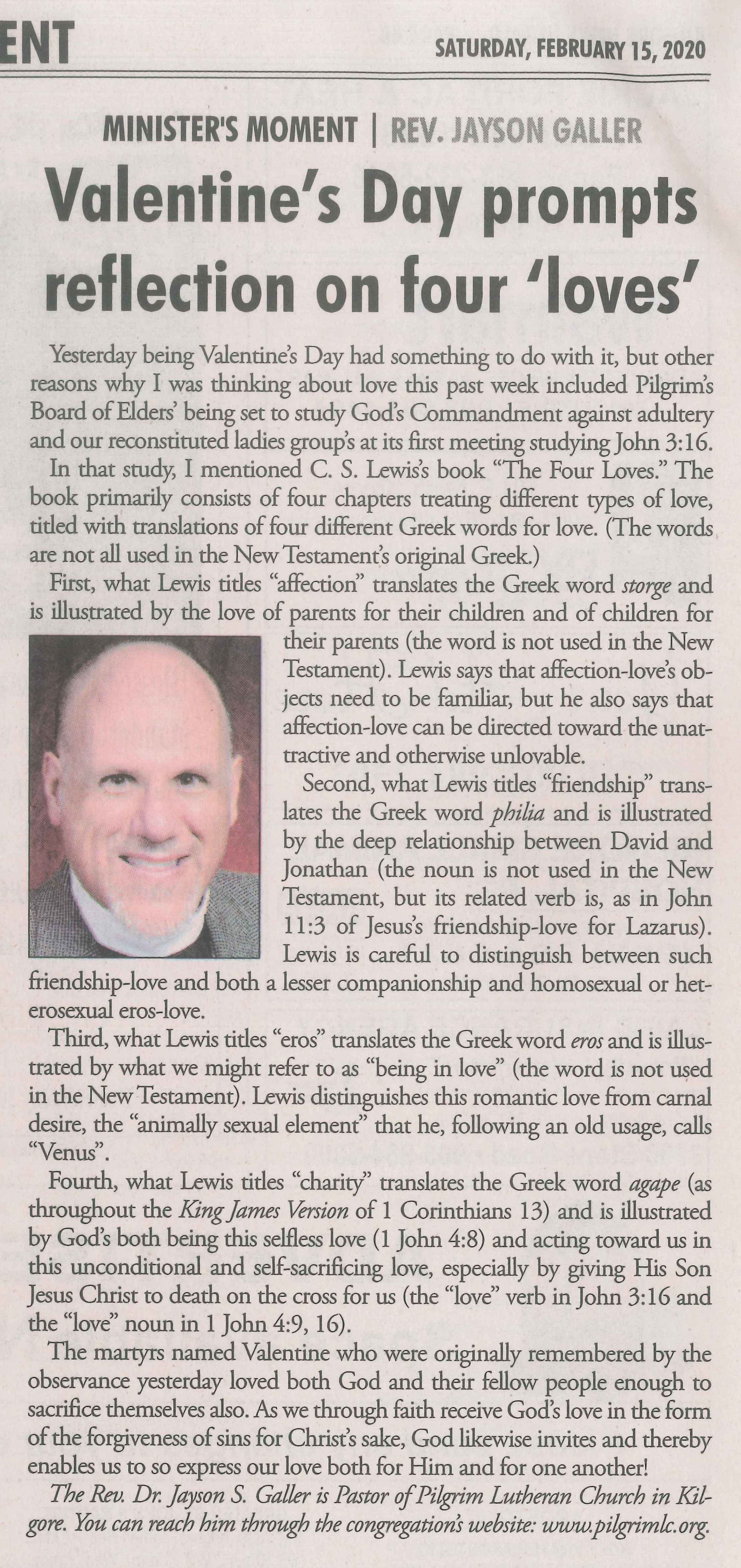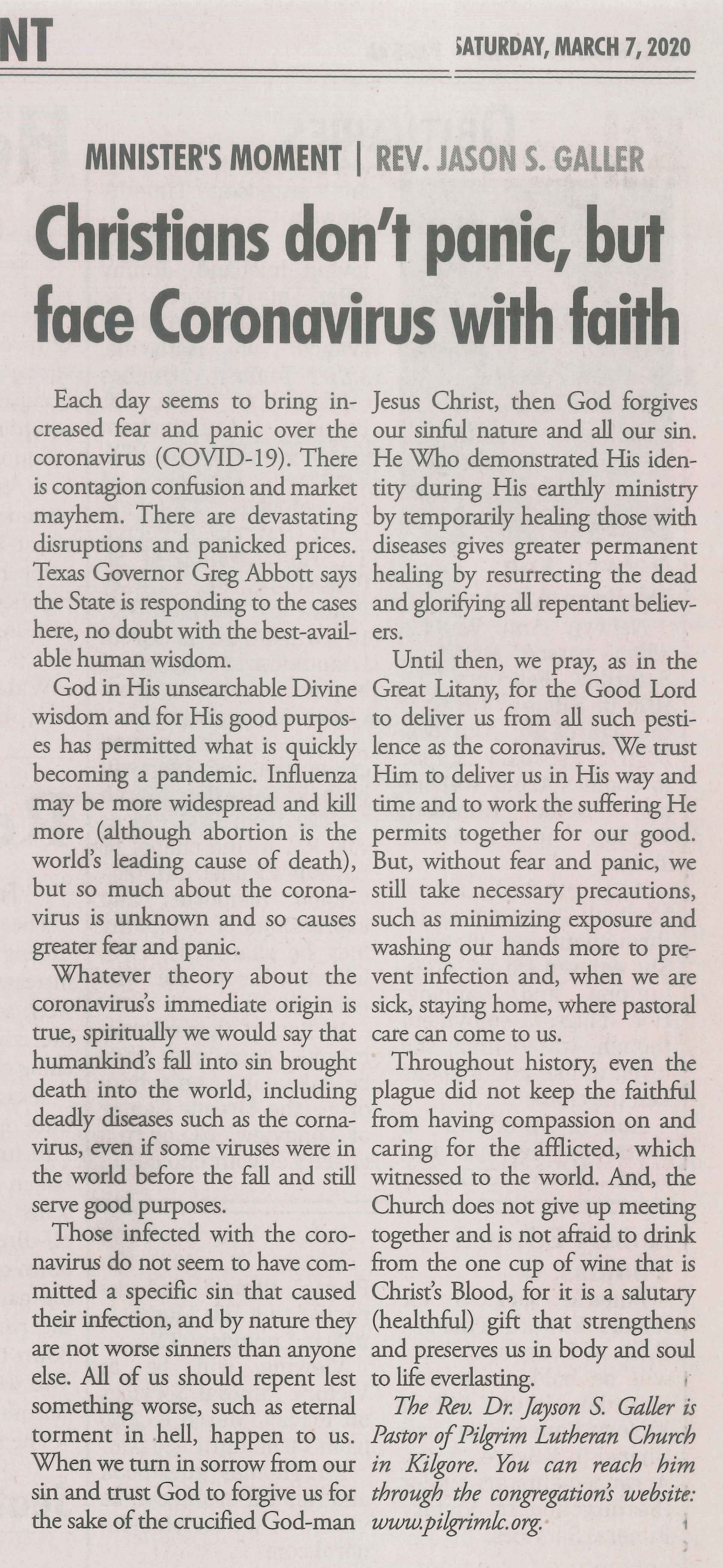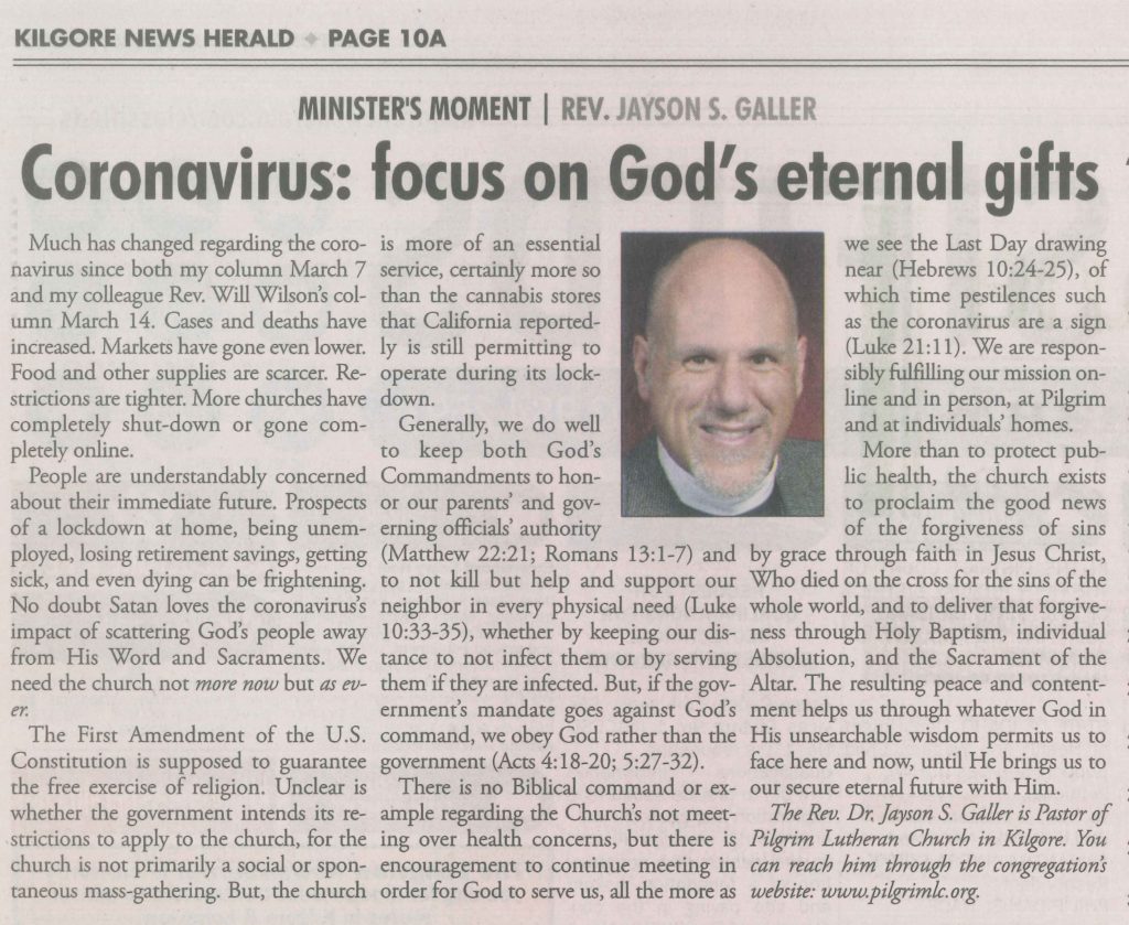Each Saturday the Kilgore News Herald runs a column written by local pastors titled "Minister's Moment". Pastor Galler's columns currently run the first and third Saturdays of the month. Past columns are posted below (the most-recent first), with an image of the hard copy hosted on this site (which links to a full-screen version of the image), an offsite link to the newspaper's electronic version of the column (available to all for about two weeks after the column's publication and to newspaper subscribers who log-in after that), and any other onsite or offsite links to related content. Pastor Galler welcomes your comments or questions about the past columns and your suggestions for future ones; you can email him at pastor@pilgrimlc.org. (Note that some of Pastor Galler's columns have also run in The Henderson News.)