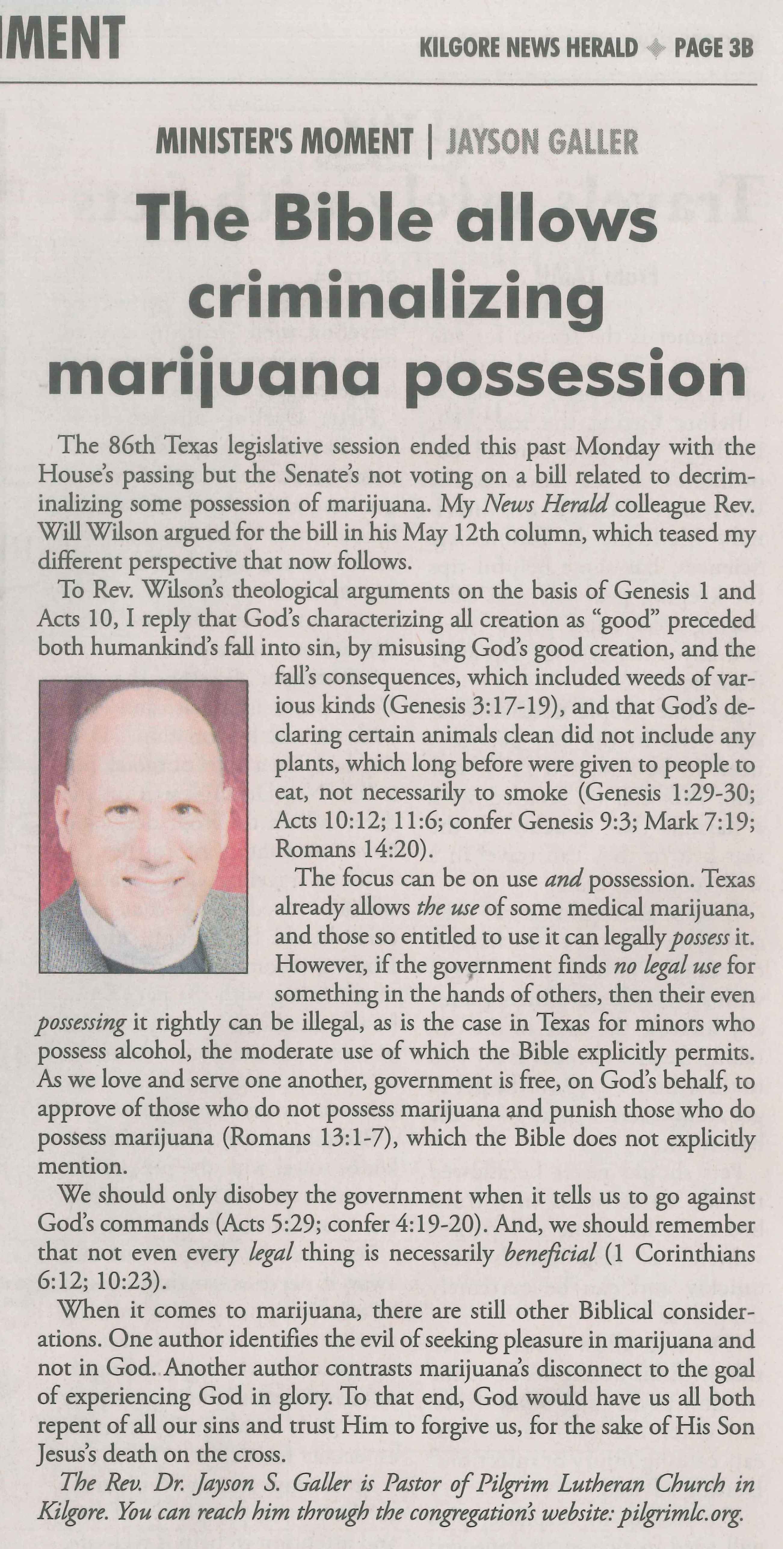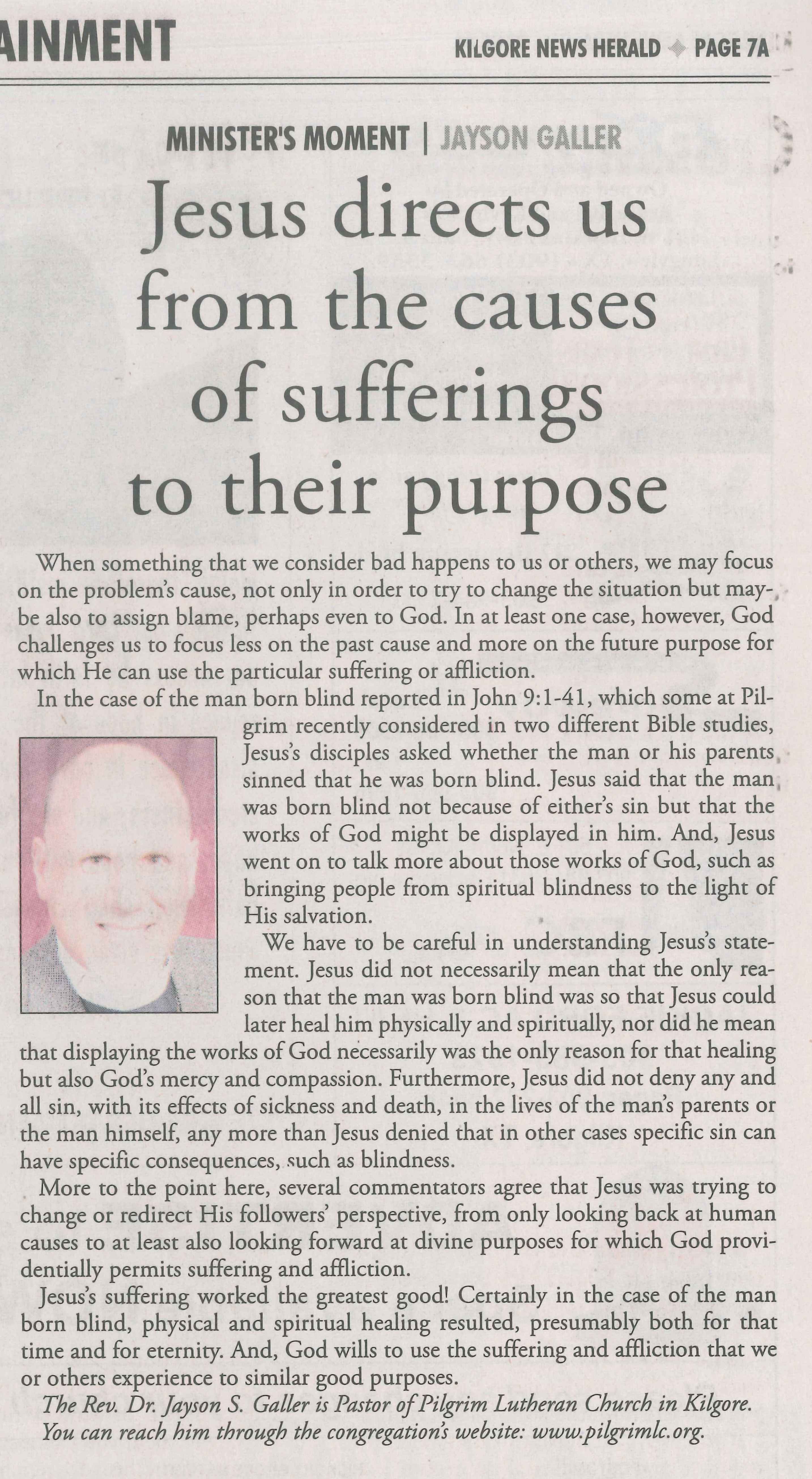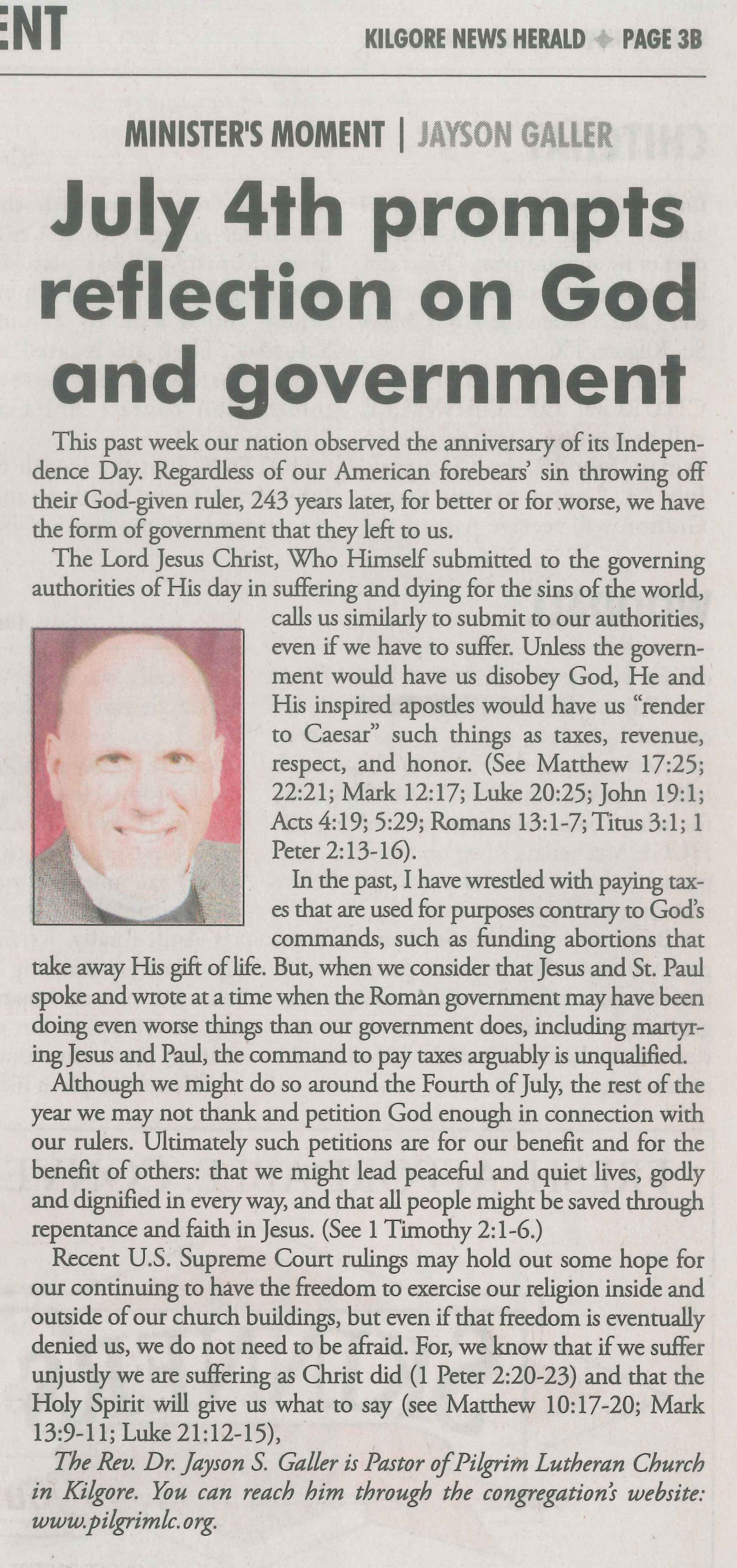 Each Saturday the Kilgore News Herald runs a column written by local pastors titled "Minister's Moment". Pastor Galler's columns currently run the first and third Saturdays of the month. Past columns are posted below (the most-recent first), with an image of the hard copy hosted on this site (which links to a full-screen version of the image), an offsite link to the newspaper's electronic version of the column (available to all for about two weeks after the column's publication and to newspaper subscribers who log-in after that), and any other onsite or offsite links to related content. Pastor Galler welcomes your comments or questions about the past columns and your suggestions for future ones; you can email him at pastor@pilgrimlc.org. (Note that some of Pastor Galler's columns have also run in The Henderson News.)