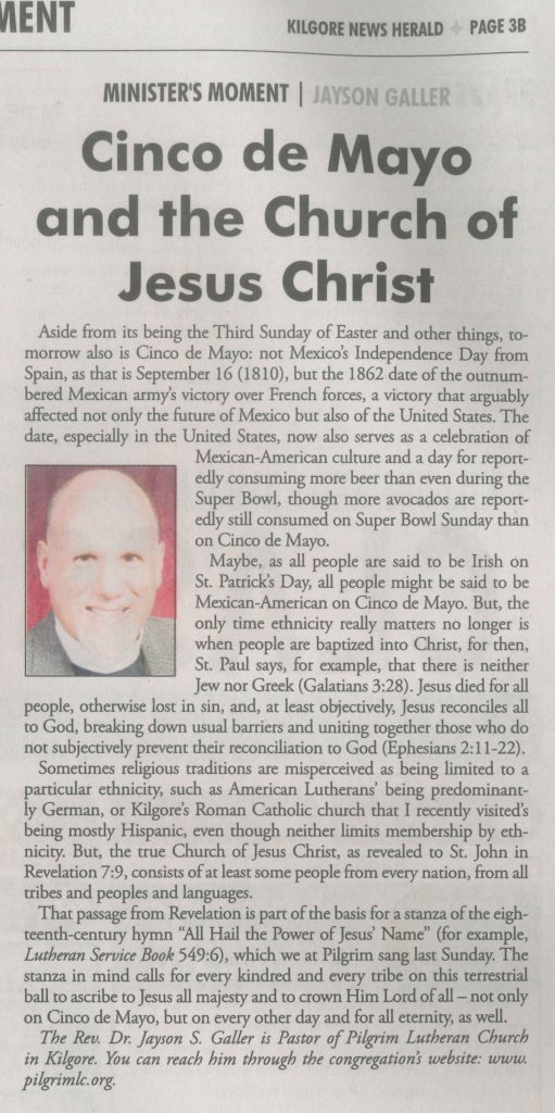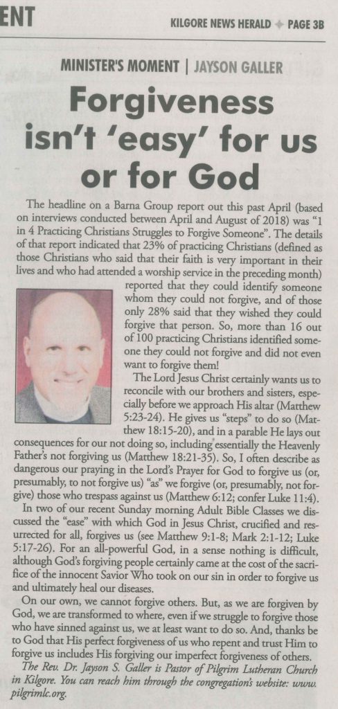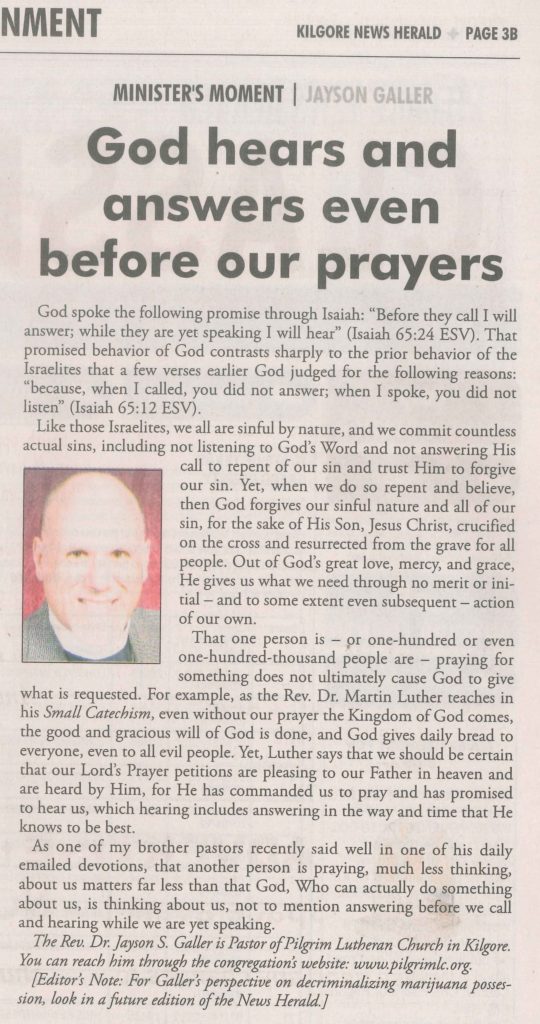 Each Saturday the Kilgore News Herald runs a column written by local pastors titled "Minister's Moment". Pastor Galler's columns currently run the first and third Saturdays of the month. Past columns are posted below (the most-recent first), with an image of the hard copy hosted on this site (which links to a full-screen version of the image), an offsite link to the newspaper's electronic version of the column (available to all for about two weeks after the column's publication and to newspaper subscribers who log-in after that), and any other onsite or offsite links to related content. Pastor Galler welcomes your comments or questions about the past columns and your suggestions for future ones; you can email him at pastor@pilgrimlc.org. (Note that some of Pastor Galler's columns have also run in The Henderson News.)
