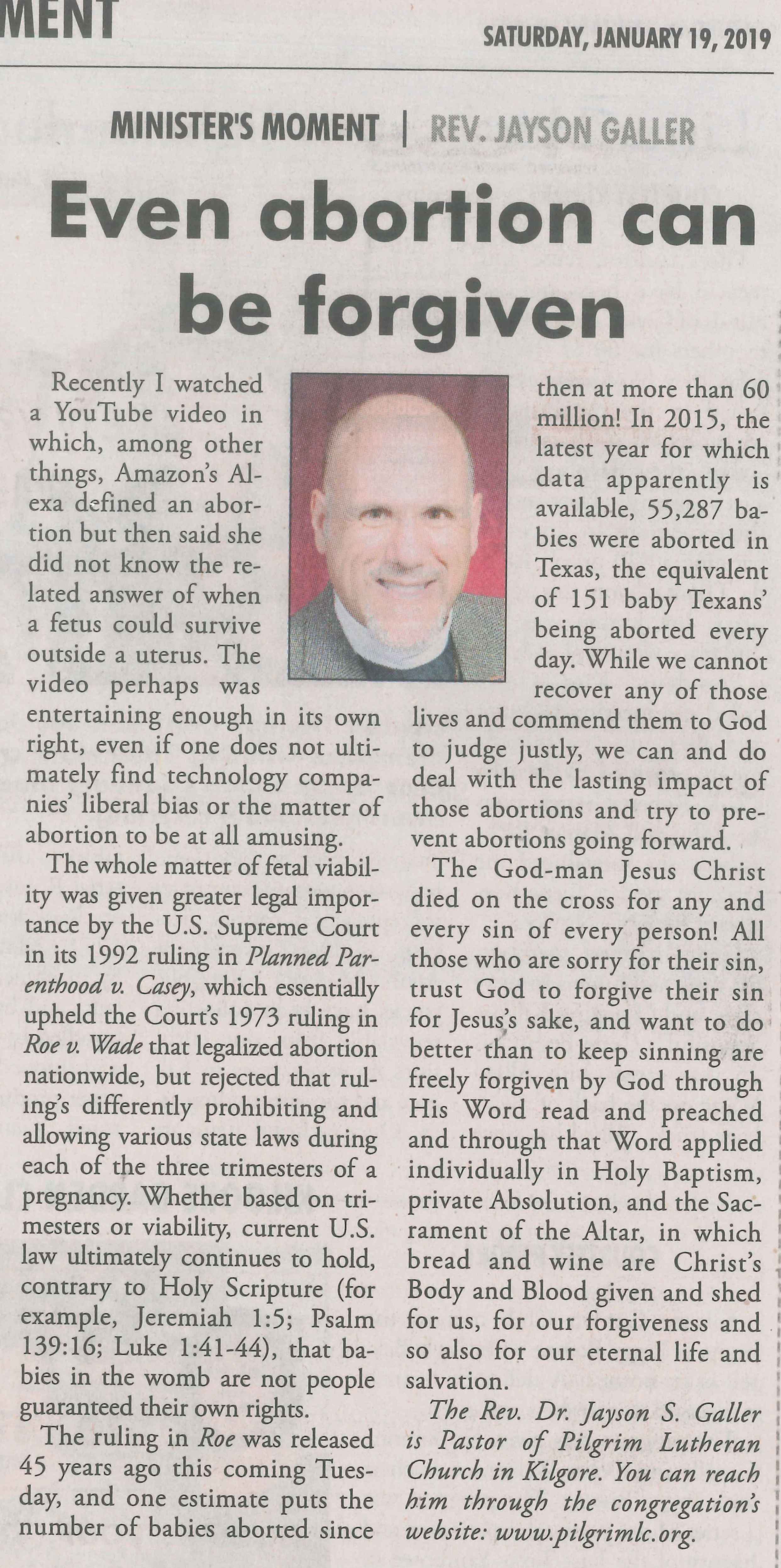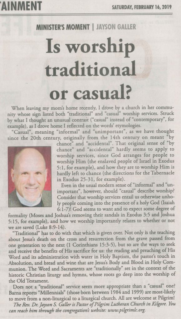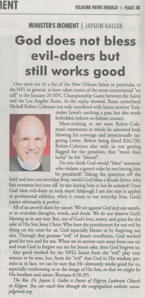 Each Saturday the Kilgore News Herald runs a column written by local pastors titled "Minister's Moment". Pastor Galler's columns currently run the first and third Saturdays of the month. Past columns are posted below (the most-recent first), with an image of the hard copy hosted on this site (which links to a full-screen version of the image), an offsite link to the newspaper's electronic version of the column (available to all for about two weeks after the column's publication and to newspaper subscribers who log-in after that), and any other onsite or offsite links to related content. Pastor Galler welcomes your comments or questions about the past columns and your suggestions for future ones; you can email him at pastor@pilgrimlc.org. (Note that some of Pastor Galler's columns have also run in The Henderson News.)