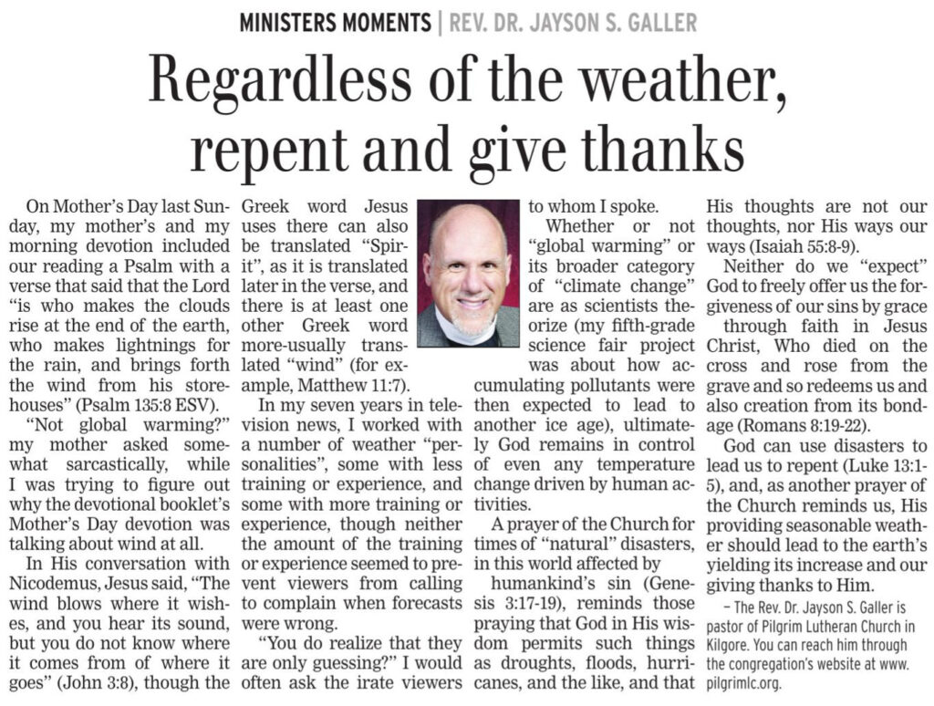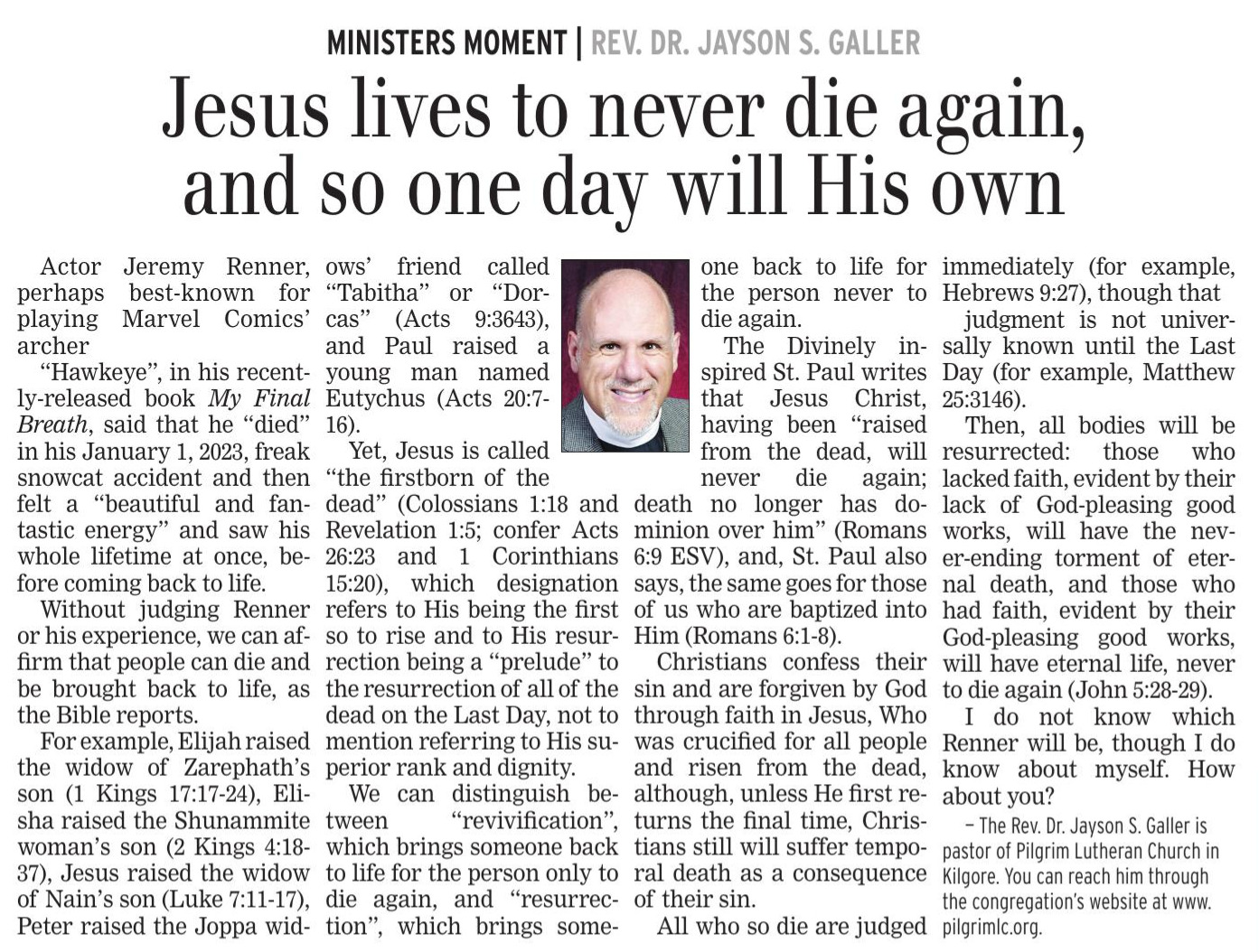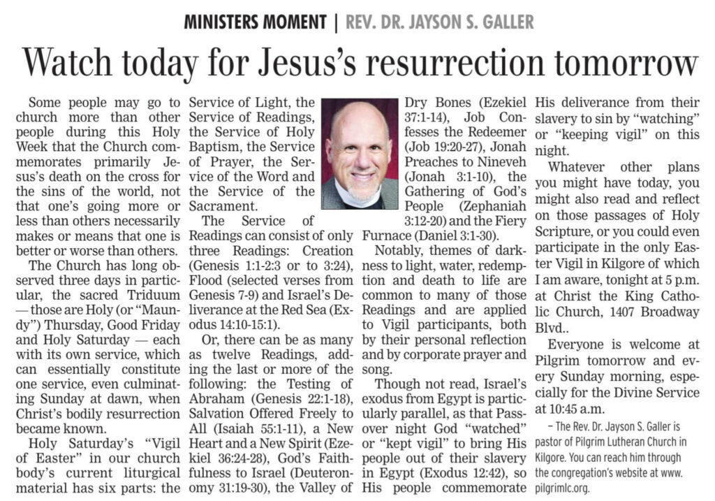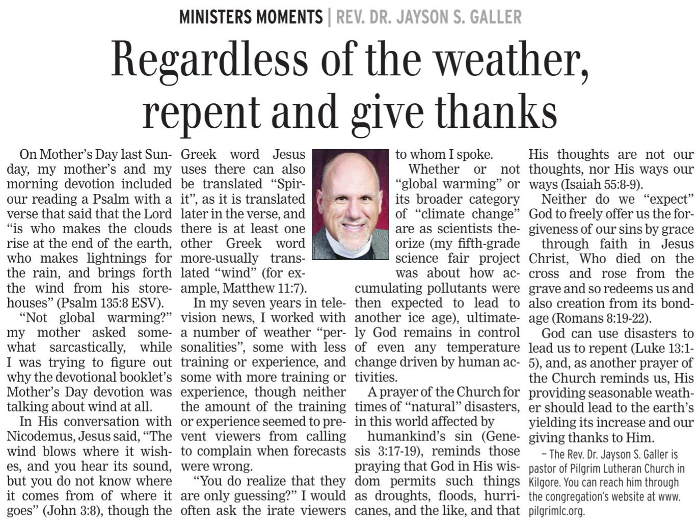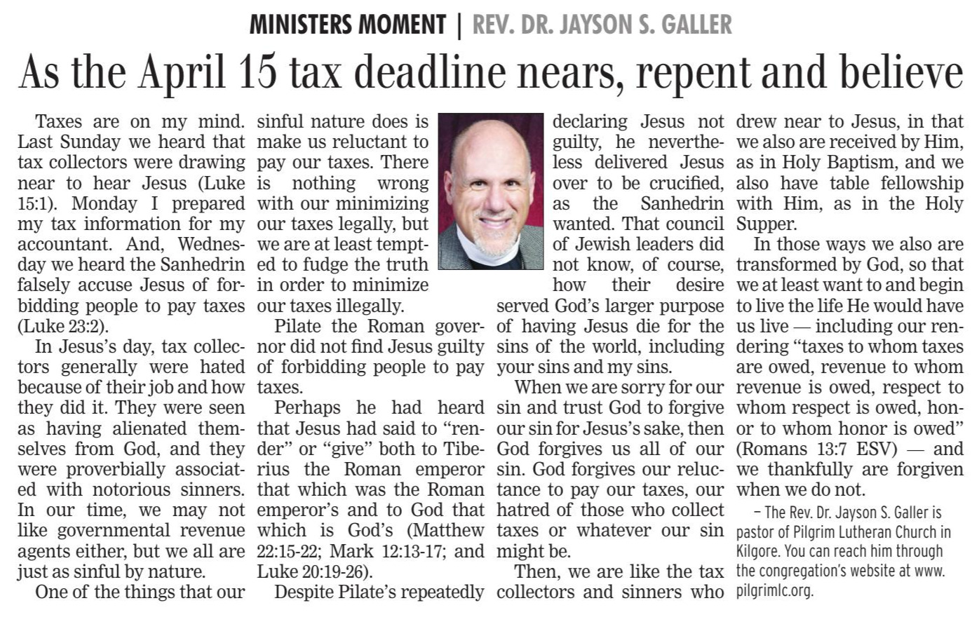 Each Saturday the Kilgore News Herald runs a column written by local pastors titled "Minister's Moment". Pastor Galler's columns currently run the first and third Saturdays of the month. Past columns are posted below (the most-recent first), with an image of the hard copy hosted on this site (which links to a full-screen version of the image), an offsite link to the newspaper's electronic version of the column (available to all for about two weeks after the column's publication and to newspaper subscribers who log-in after that), and any other onsite or offsite links to related content. Pastor Galler welcomes your comments or questions about the past columns and your suggestions for future ones; you can email him at pastor@pilgrimlc.org. (Note that some of Pastor Galler's columns have also run in The Henderson News.)