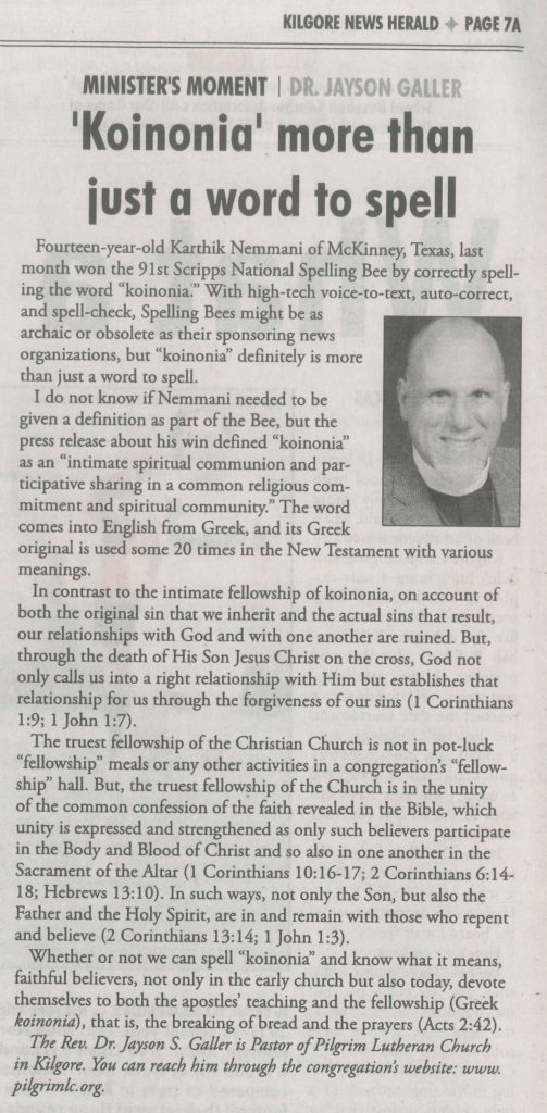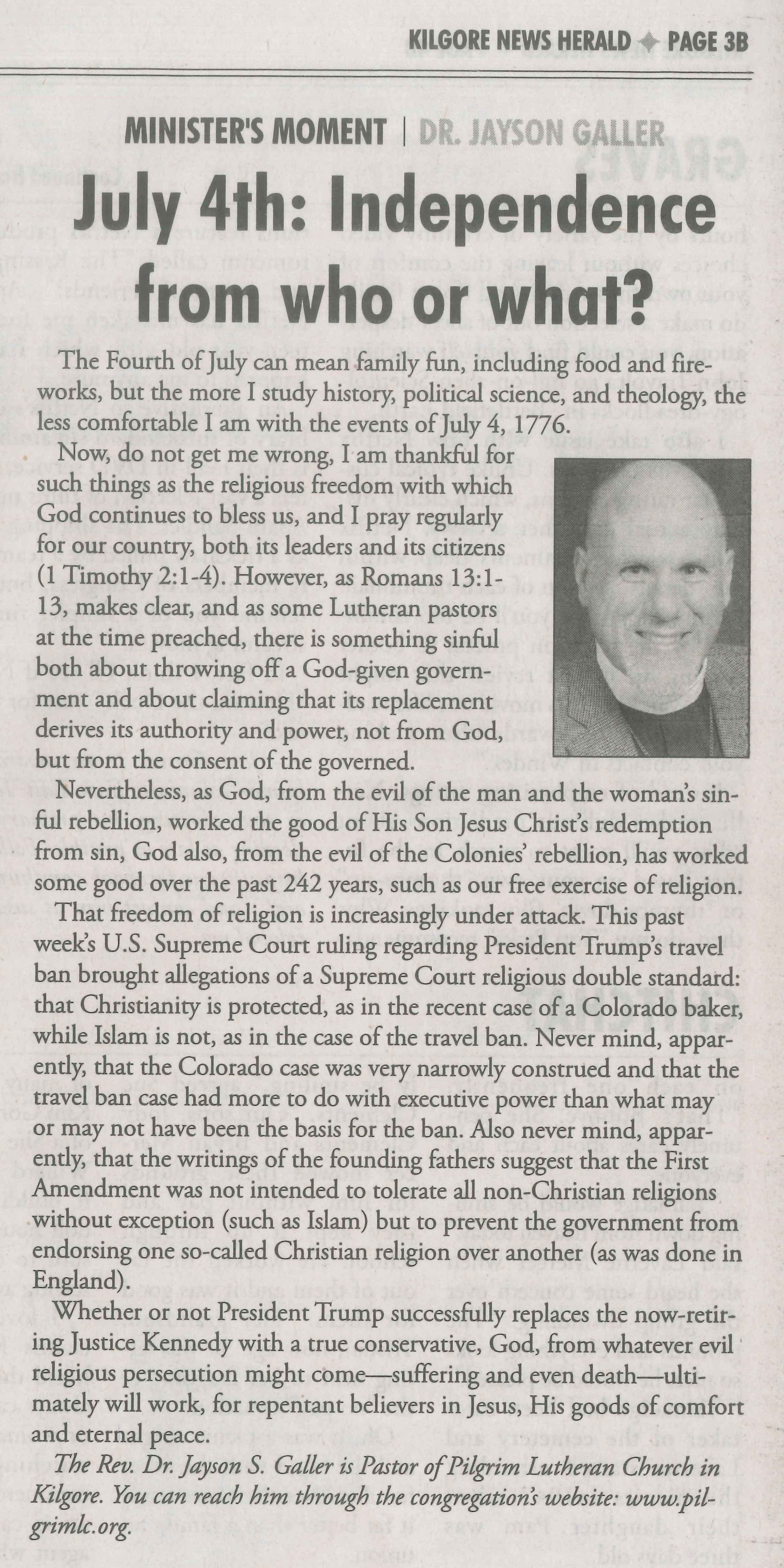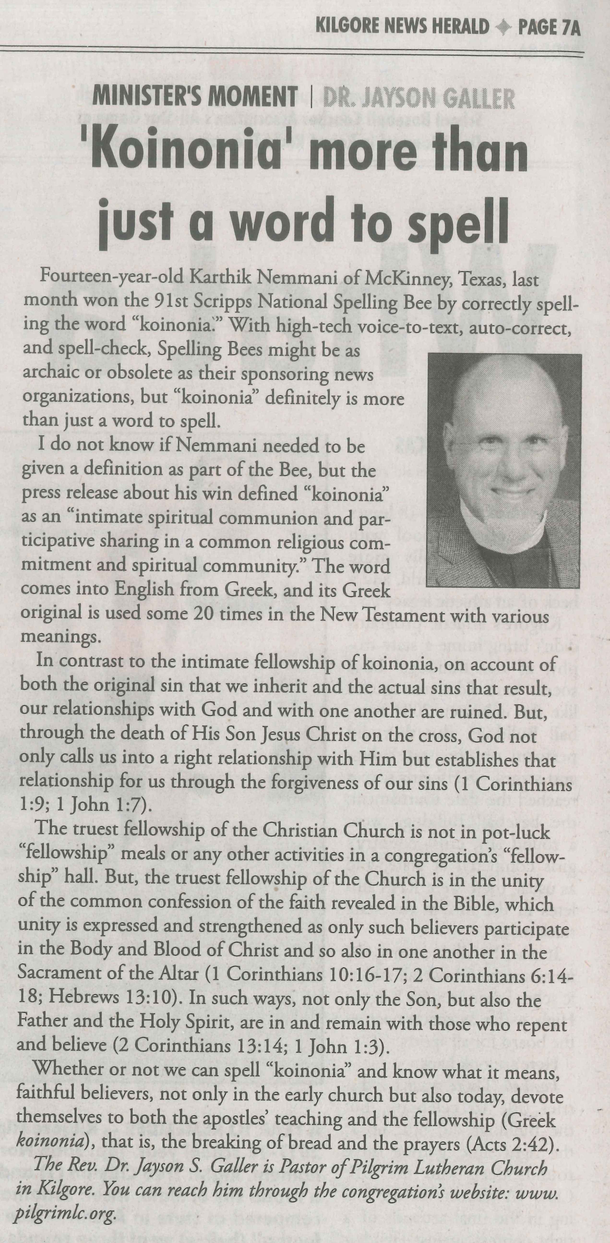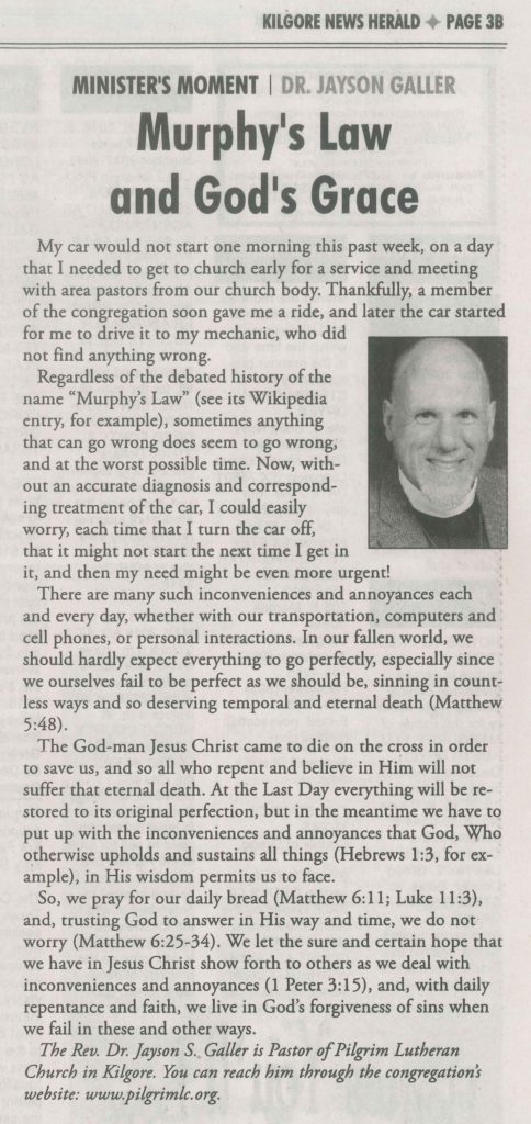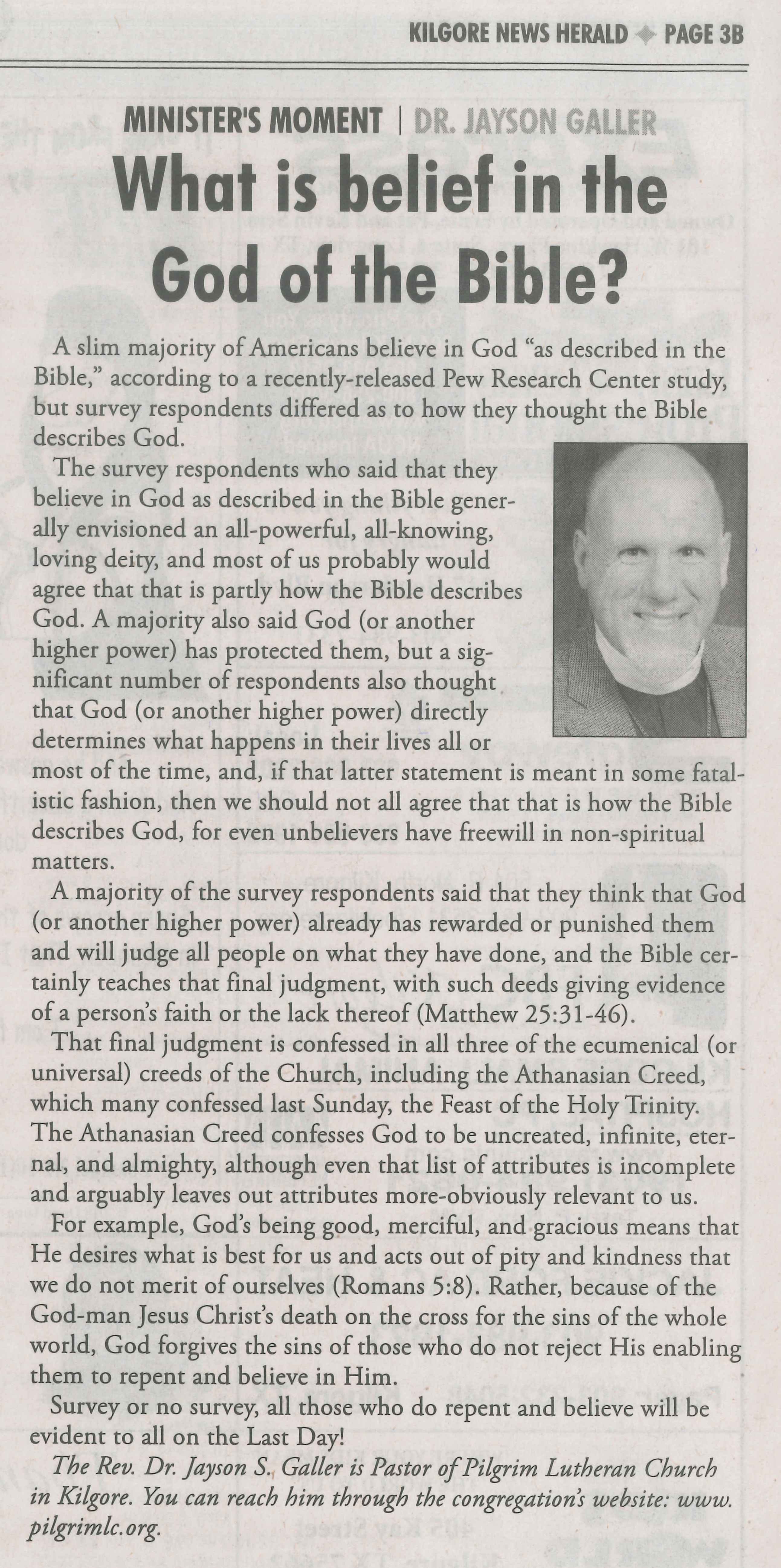 Each Saturday the Kilgore News Herald runs a column written by local pastors titled "Minister's Moment". Pastor Galler's columns currently run the first and third Saturdays of the month. Past columns are posted below (the most-recent first), with an image of the hard copy hosted on this site (which links to a full-screen version of the image), an offsite link to the newspaper's electronic version of the column (available to all for about two weeks after the column's publication and to newspaper subscribers who log-in after that), and any other onsite or offsite links to related content. Pastor Galler welcomes your comments or questions about the past columns and your suggestions for future ones; you can email him at pastor@pilgrimlc.org. (Note that some of Pastor Galler's columns have also run in The Henderson News.)