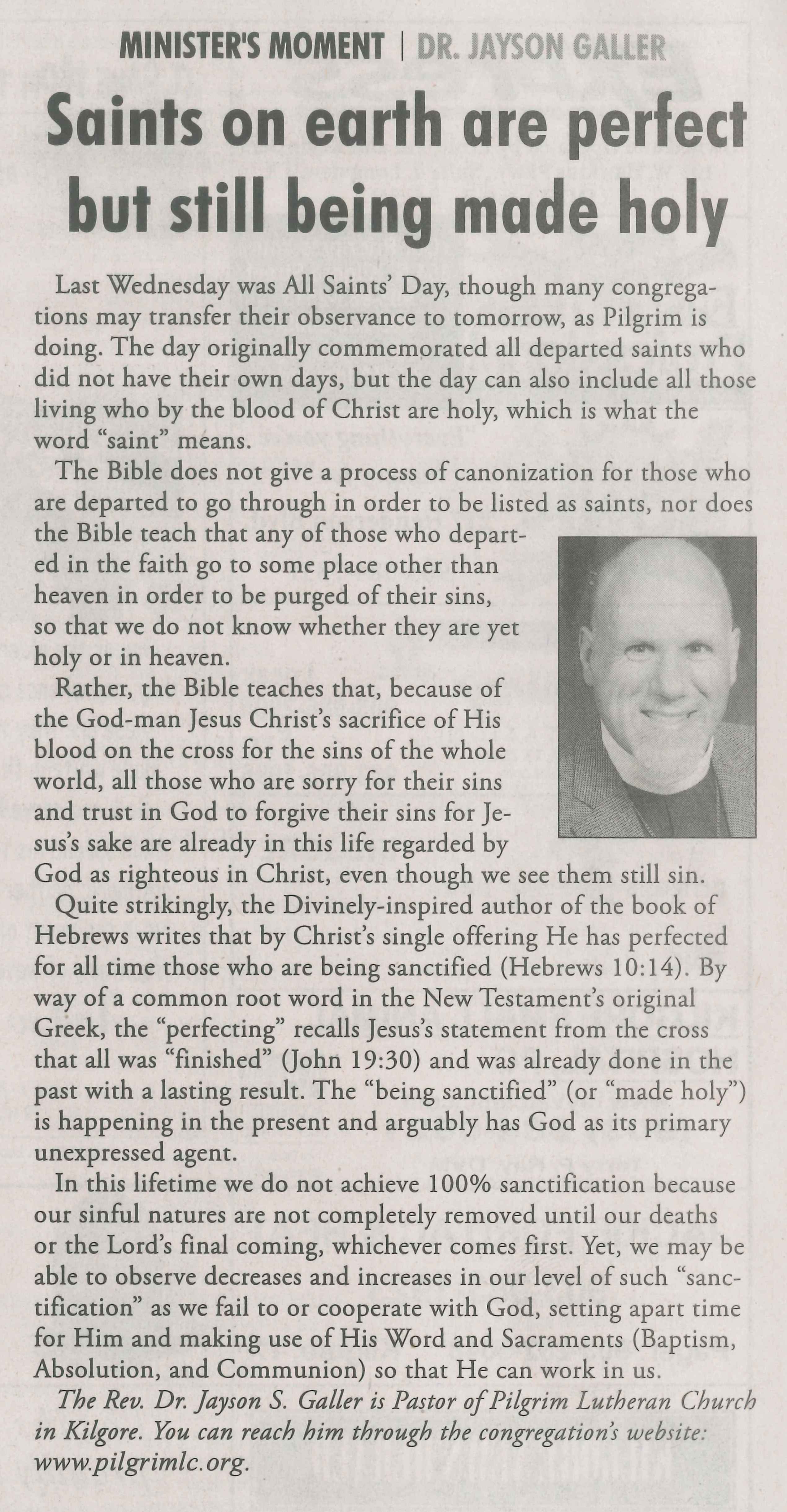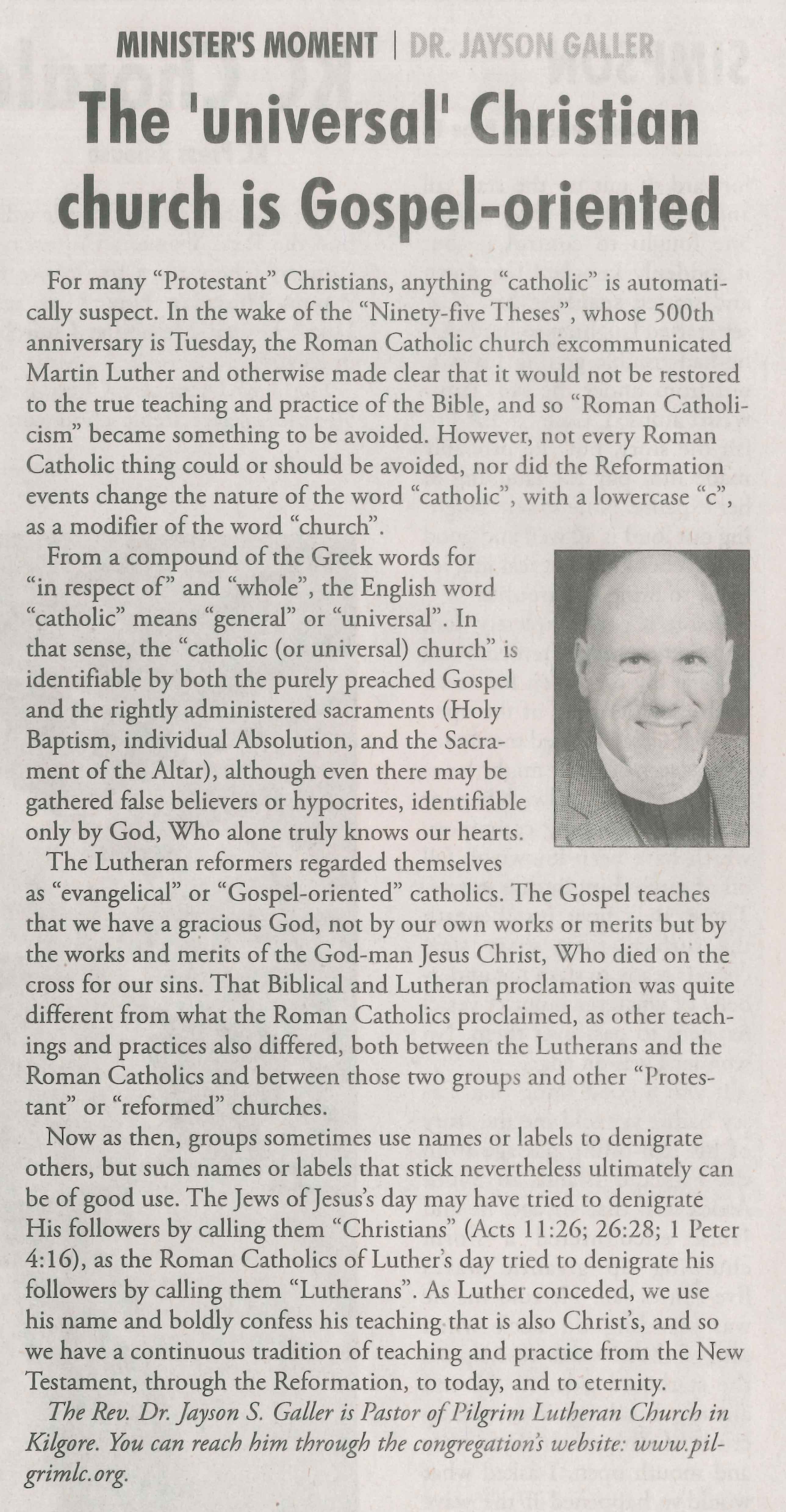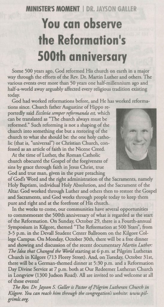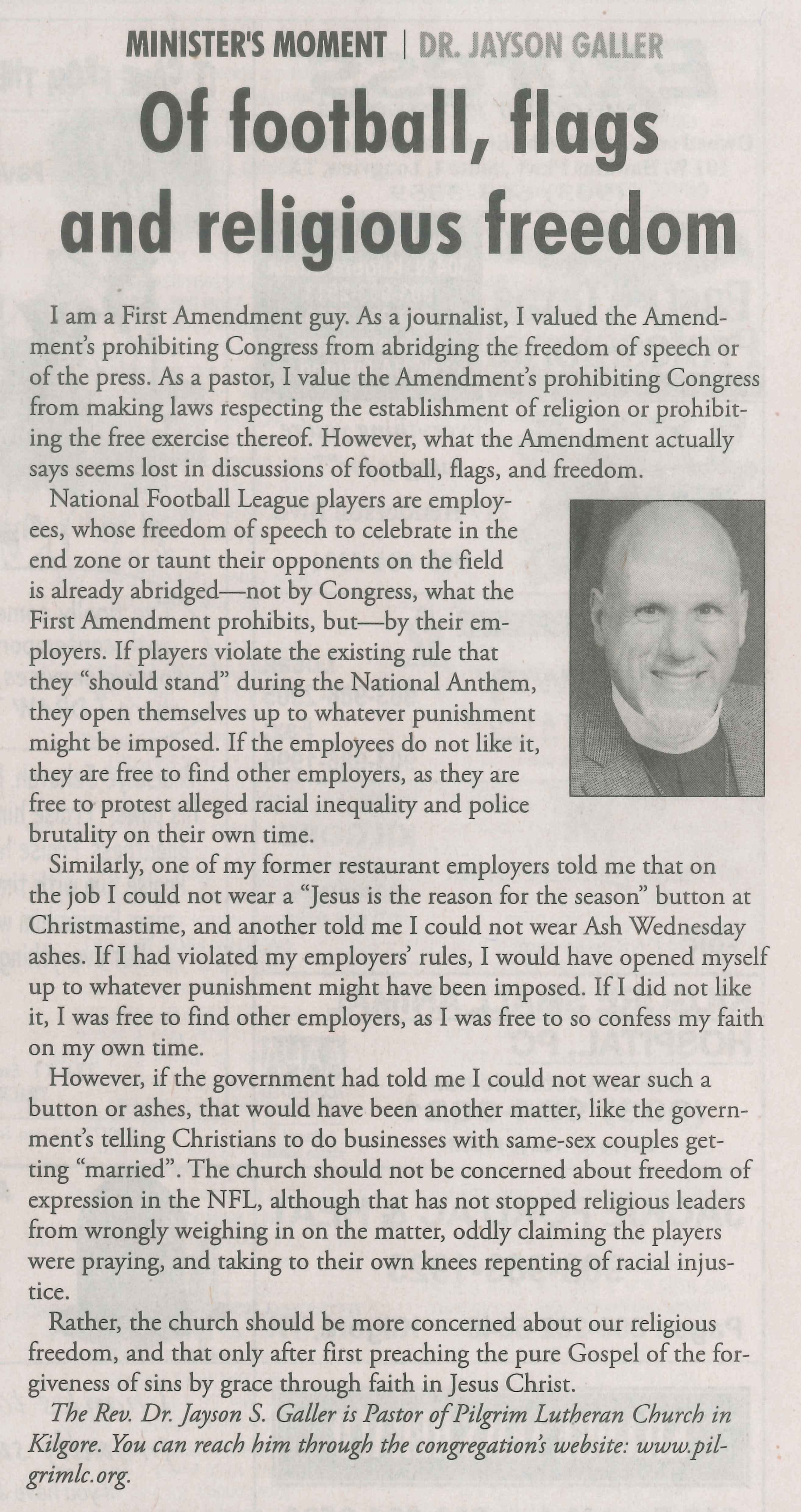 Each Saturday the Kilgore News Herald runs a column written by local pastors titled "Minister's Moment". Pastor Galler's columns currently run the first and third Saturdays of the month. Past columns are posted below (the most-recent first), with an image of the hard copy hosted on this site (which links to a full-screen version of the image), an offsite link to the newspaper's electronic version of the column (available to all for about two weeks after the column's publication and to newspaper subscribers who log-in after that), and any other onsite or offsite links to related content. Pastor Galler welcomes your comments or questions about the past columns and your suggestions for future ones; you can email him at pastor@pilgrimlc.org. (Note that some of Pastor Galler's columns have also run in The Henderson News.)