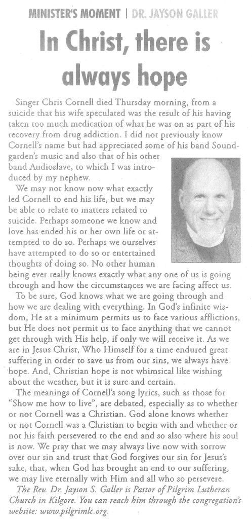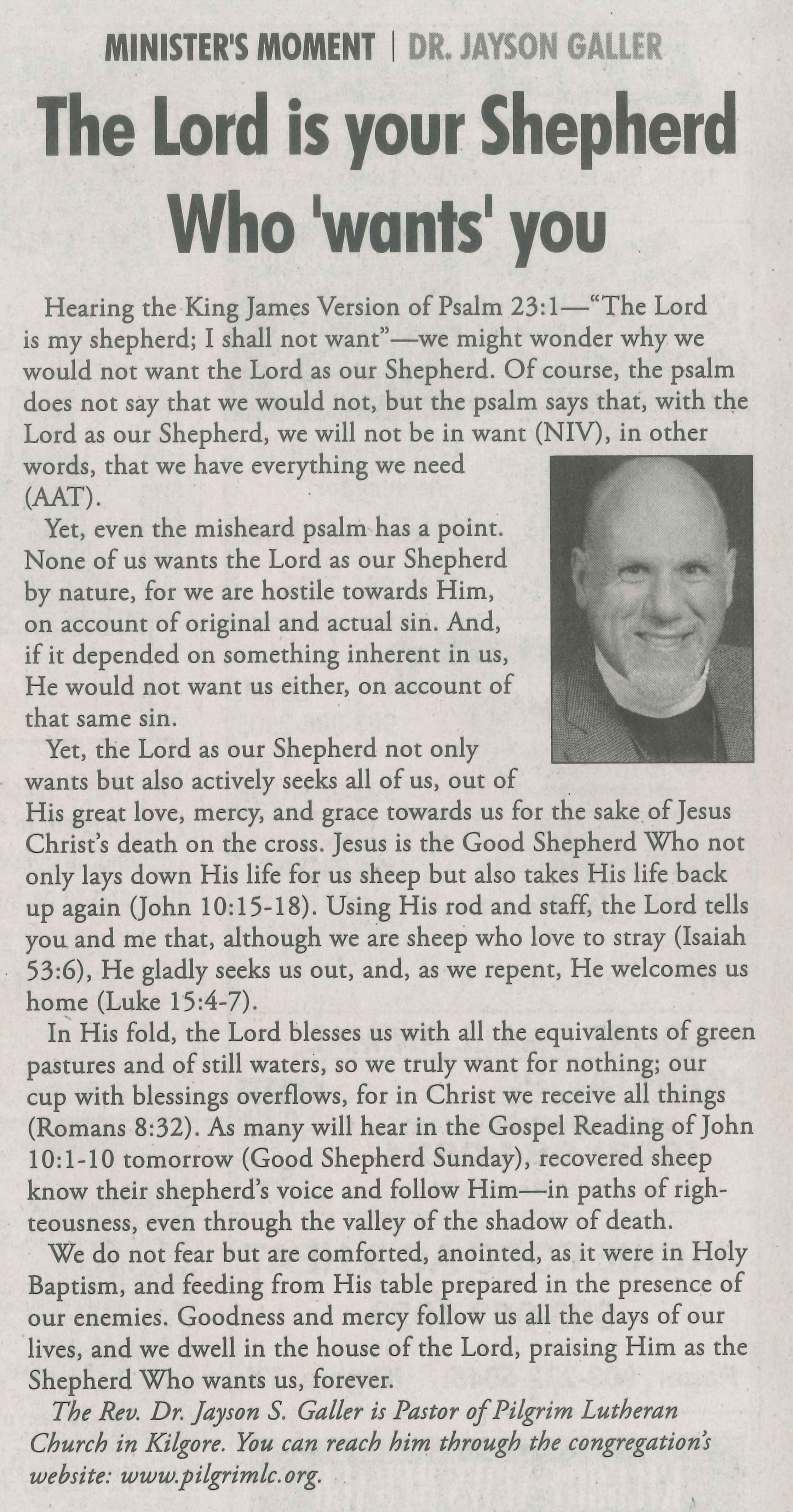 Each Saturday the Kilgore News Herald runs a column written by local pastors titled "Minister's Moment". Pastor Galler's columns currently run the first and third Saturdays of the month. Past columns are posted below (the most-recent first), with an image of the hard copy hosted on this site (which links to a full-screen version of the image), an offsite link to the newspaper's electronic version of the column (available to all for about two weeks after the column's publication and to newspaper subscribers who log-in after that), and any other onsite or offsite links to related content. Pastor Galler welcomes your comments or questions about the past columns and your suggestions for future ones; you can email him at pastor@pilgrimlc.org. (Note that some of Pastor Galler's columns have also run in The Henderson News.)
