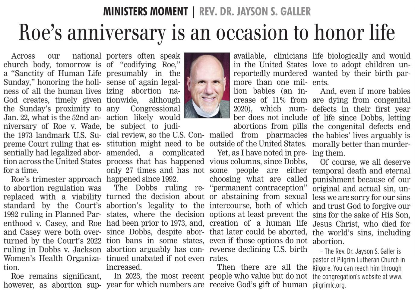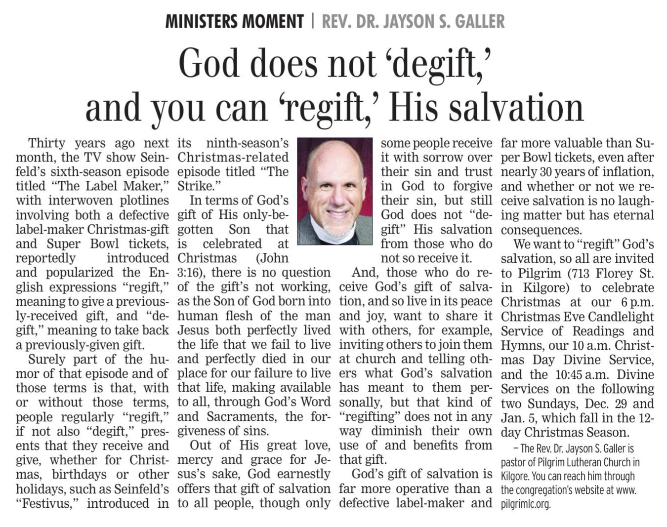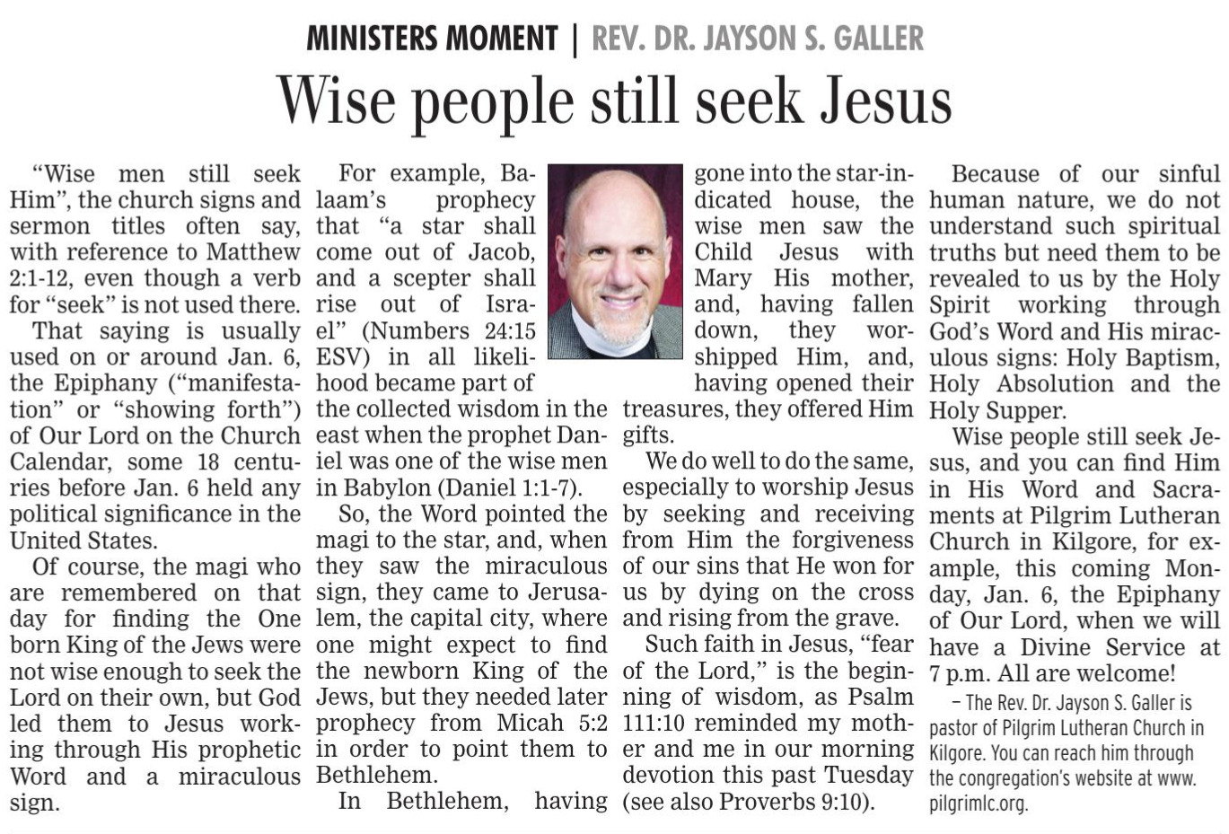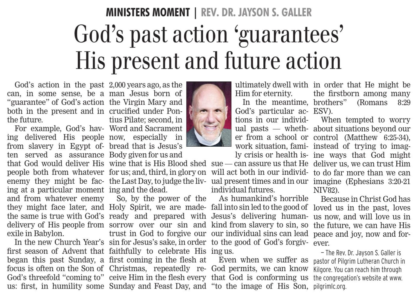 Each Saturday the Kilgore News Herald runs a column written by local pastors titled "Minister's Moment". Pastor Galler's columns currently run the first and third Saturdays of the month. Past columns are posted below (the most-recent first), with an image of the hard copy hosted on this site (which links to a full-screen version of the image), an offsite link to the newspaper's electronic version of the column (available to all for about two weeks after the column's publication and to newspaper subscribers who log-in after that), and any other onsite or offsite links to related content. Pastor Galler welcomes your comments or questions about the past columns and your suggestions for future ones; you can email him at pastor@pilgrimlc.org. (Note that some of Pastor Galler's columns have also run in The Henderson News.)