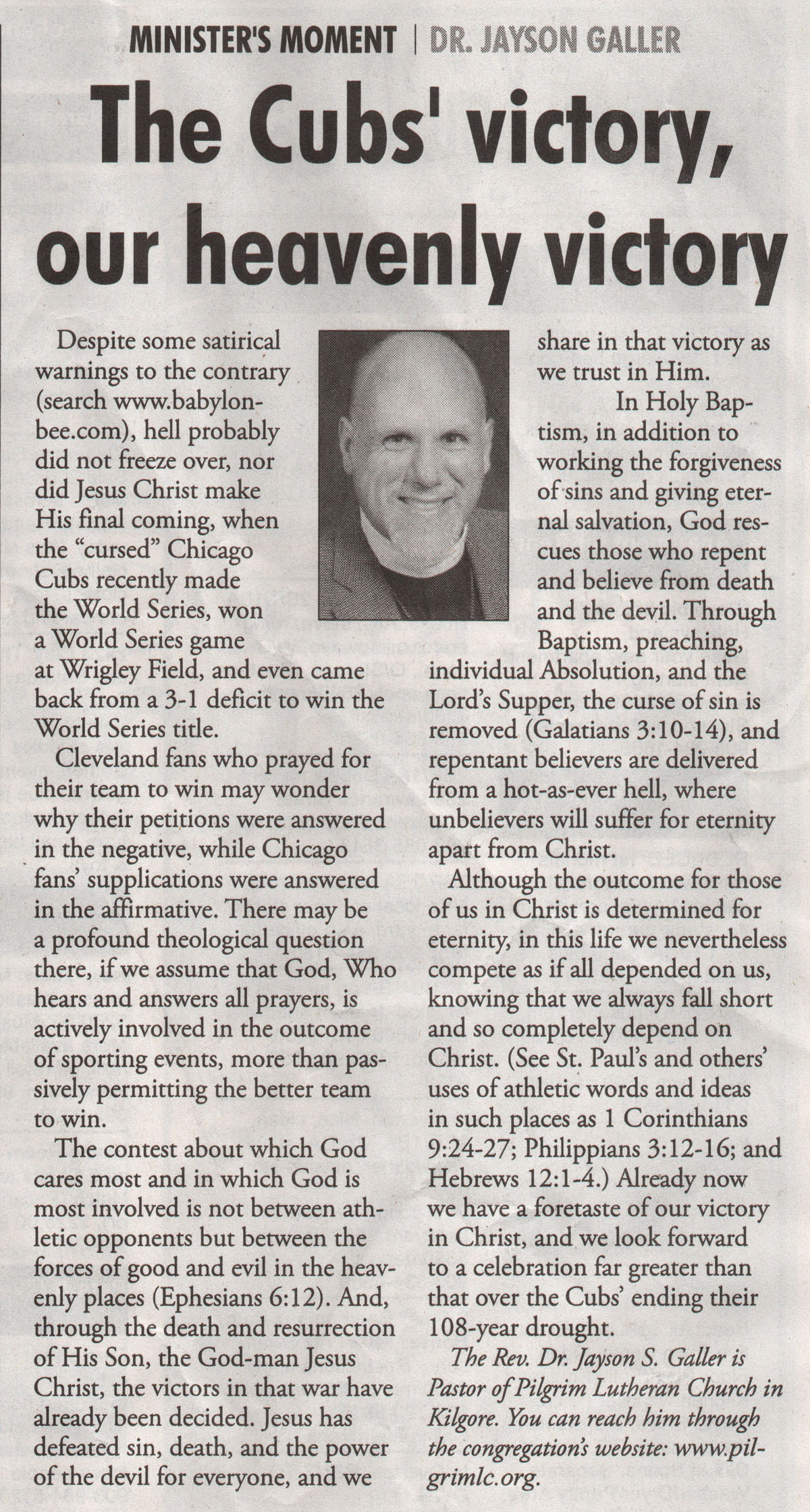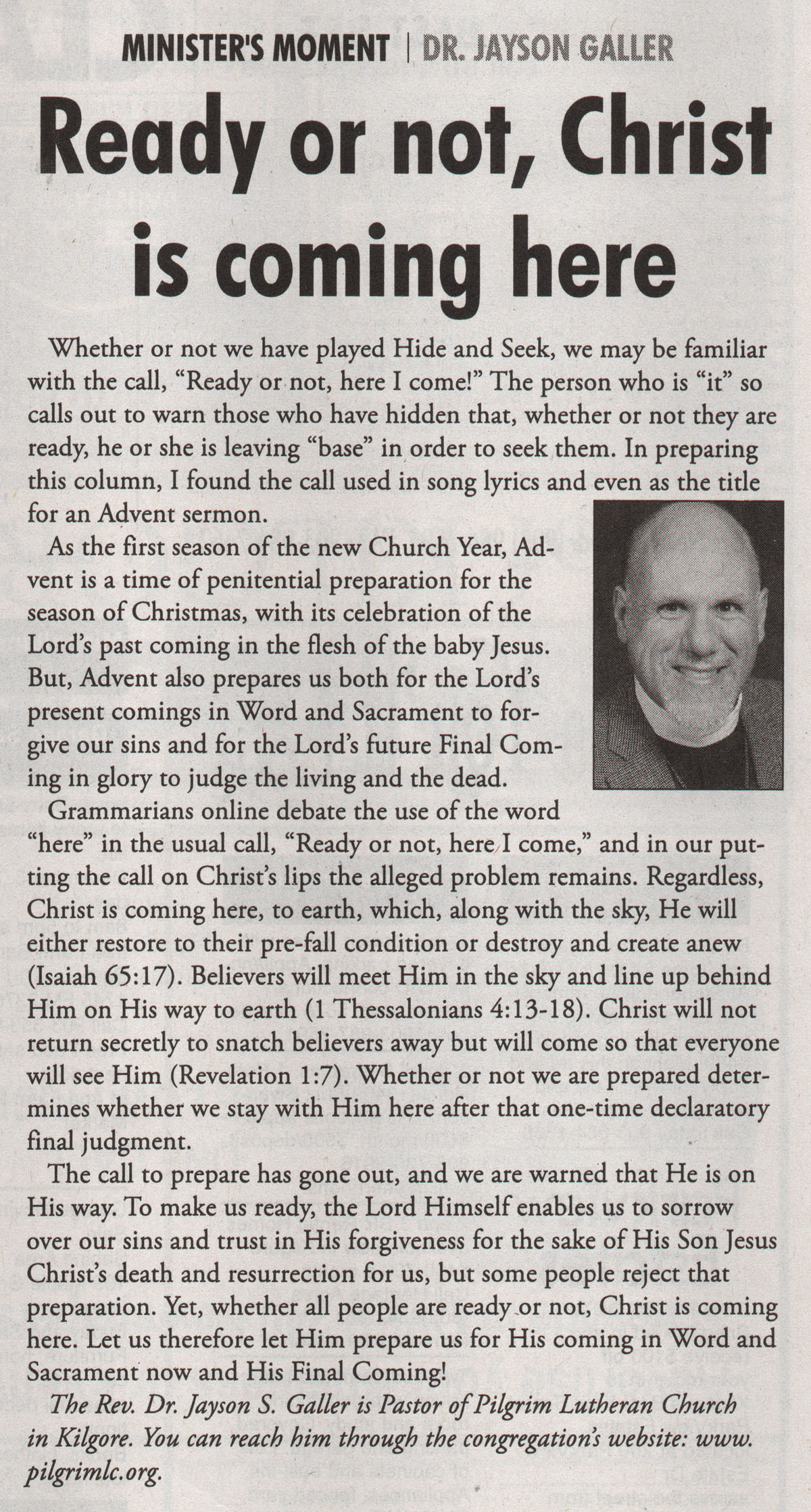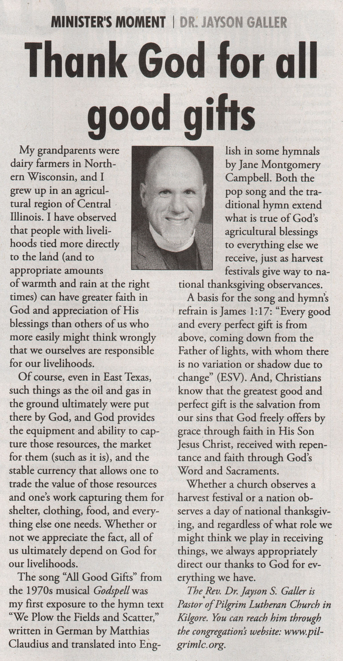 Each Saturday the Kilgore News Herald runs a column written by local pastors titled "Minister's Moment". Pastor Galler's columns currently run the first and third Saturdays of the month. Past columns are posted below (the most-recent first), with an image of the hard copy hosted on this site (which links to a full-screen version of the image), an offsite link to the newspaper's electronic version of the column (available to all for about two weeks after the column's publication and to newspaper subscribers who log-in after that), and any other onsite or offsite links to related content. Pastor Galler welcomes your comments or questions about the past columns and your suggestions for future ones; you can email him at pastor@pilgrimlc.org. (Note that some of Pastor Galler's columns have also run in The Henderson News.)