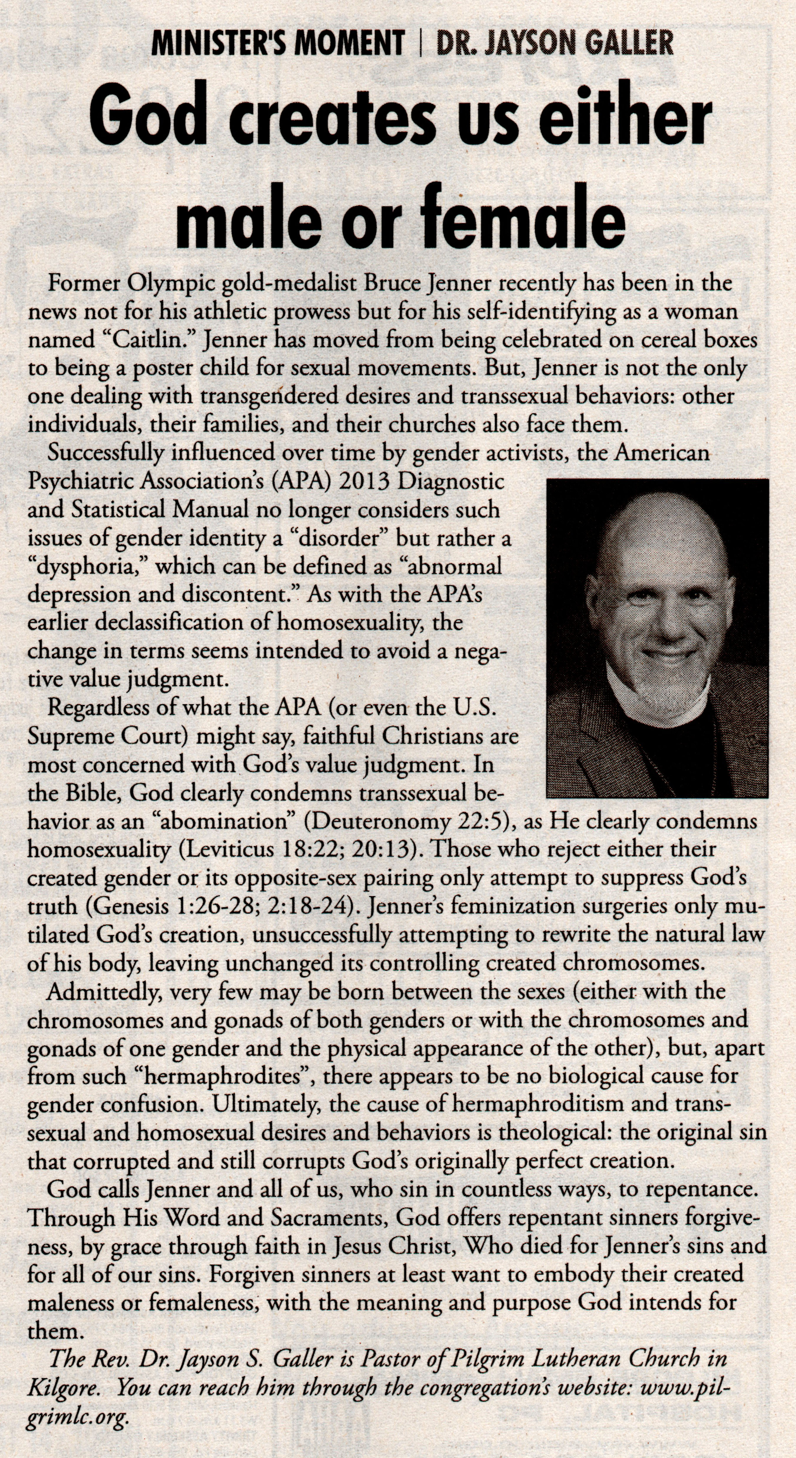 Each Saturday the Kilgore News Herald runs a column written by local pastors titled "Minister's Moment". Pastor Galler's columns currently run the first and third Saturdays of the month. Past columns are posted below (the most-recent first), with an image of the hard copy hosted on this site (which links to a full-screen version of the image), an offsite link to the newspaper's electronic version of the column (available to all for about two weeks after the column's publication and to newspaper subscribers who log-in after that), and any other onsite or offsite links to related content. Pastor Galler welcomes your comments or questions about the past columns and your suggestions for future ones; you can email him at pastor@pilgrimlc.org. (Note that some of Pastor Galler's columns have also run in The Henderson News.)