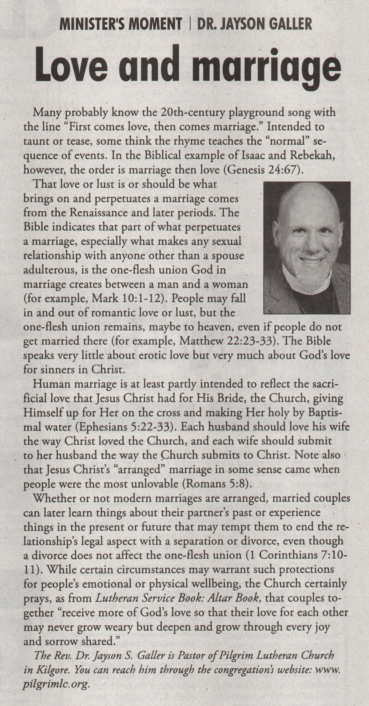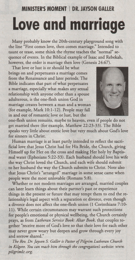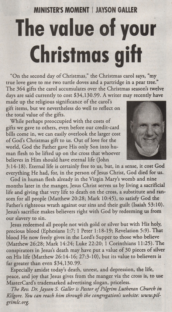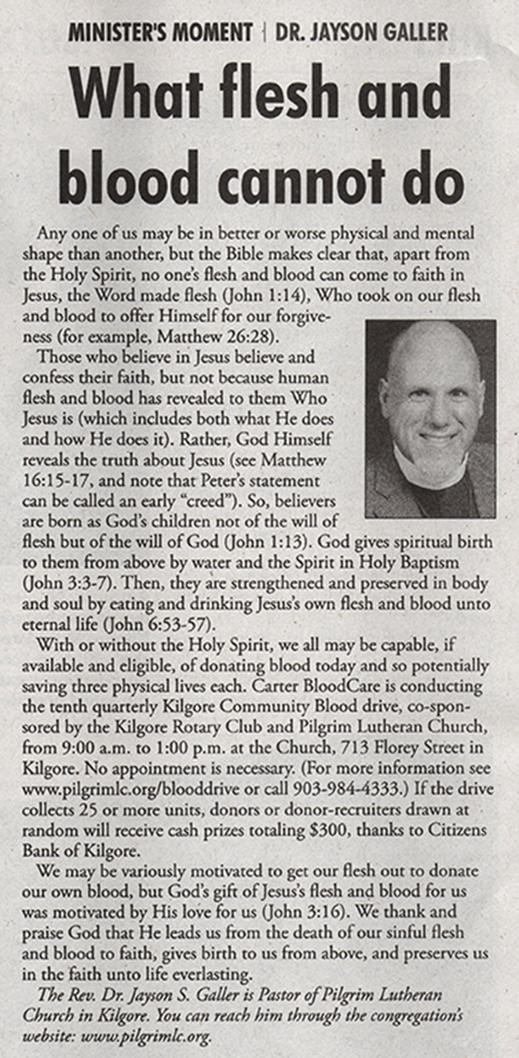 Each Saturday the Kilgore News Herald runs a column written by local pastors titled "Minister's Moment". Pastor Galler's columns currently run the first and third Saturdays of the month. Past columns are posted below (the most-recent first), with an image of the hard copy hosted on this site (which links to a full-screen version of the image), an offsite link to the newspaper's electronic version of the column (available to all for about two weeks after the column's publication and to newspaper subscribers who log-in after that), and any other onsite or offsite links to related content. Pastor Galler welcomes your comments or questions about the past columns and your suggestions for future ones; you can email him at pastor@pilgrimlc.org. (Note that some of Pastor Galler's columns have also run in The Henderson News.)