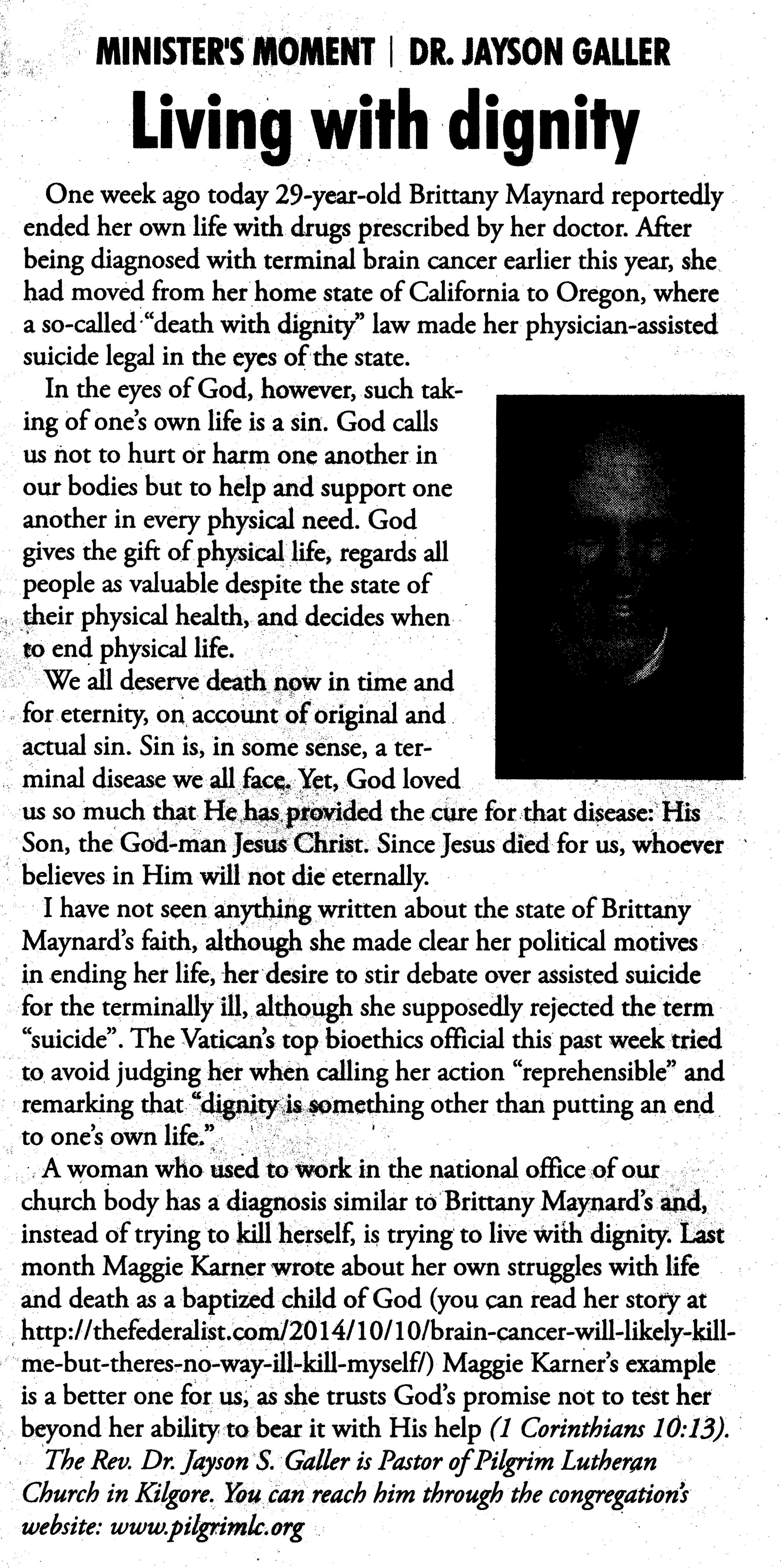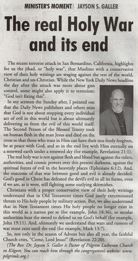 Each Saturday the Kilgore News Herald runs a column written by local pastors titled "Minister's Moment". Pastor Galler's columns currently run the first and third Saturdays of the month. Past columns are posted below (the most-recent first), with an image of the hard copy hosted on this site (which links to a full-screen version of the image), an offsite link to the newspaper's electronic version of the column (available to all for about two weeks after the column's publication and to newspaper subscribers who log-in after that), and any other onsite or offsite links to related content. Pastor Galler welcomes your comments or questions about the past columns and your suggestions for future ones; you can email him at pastor@pilgrimlc.org. (Note that some of Pastor Galler's columns have also run in The Henderson News.)