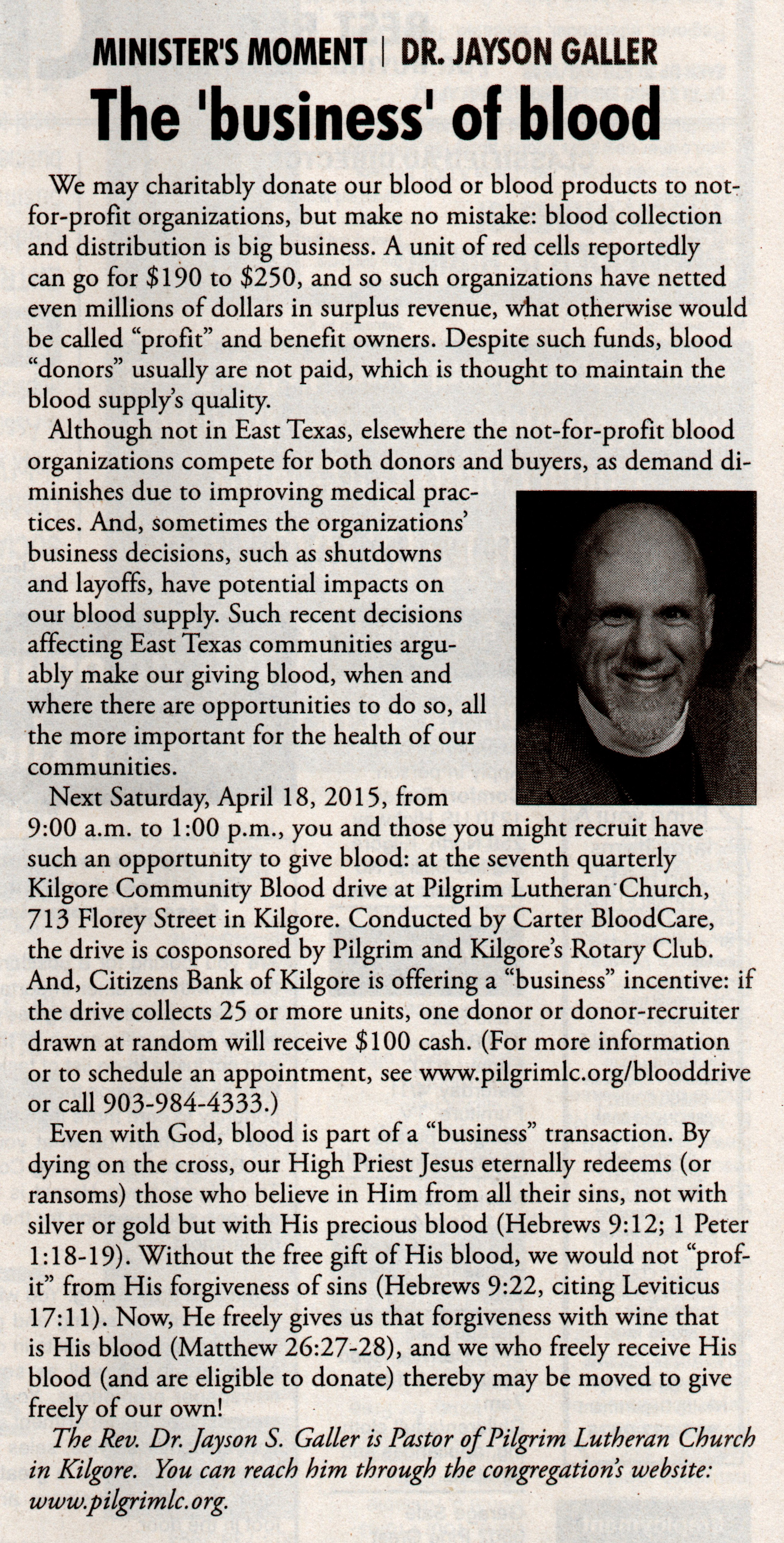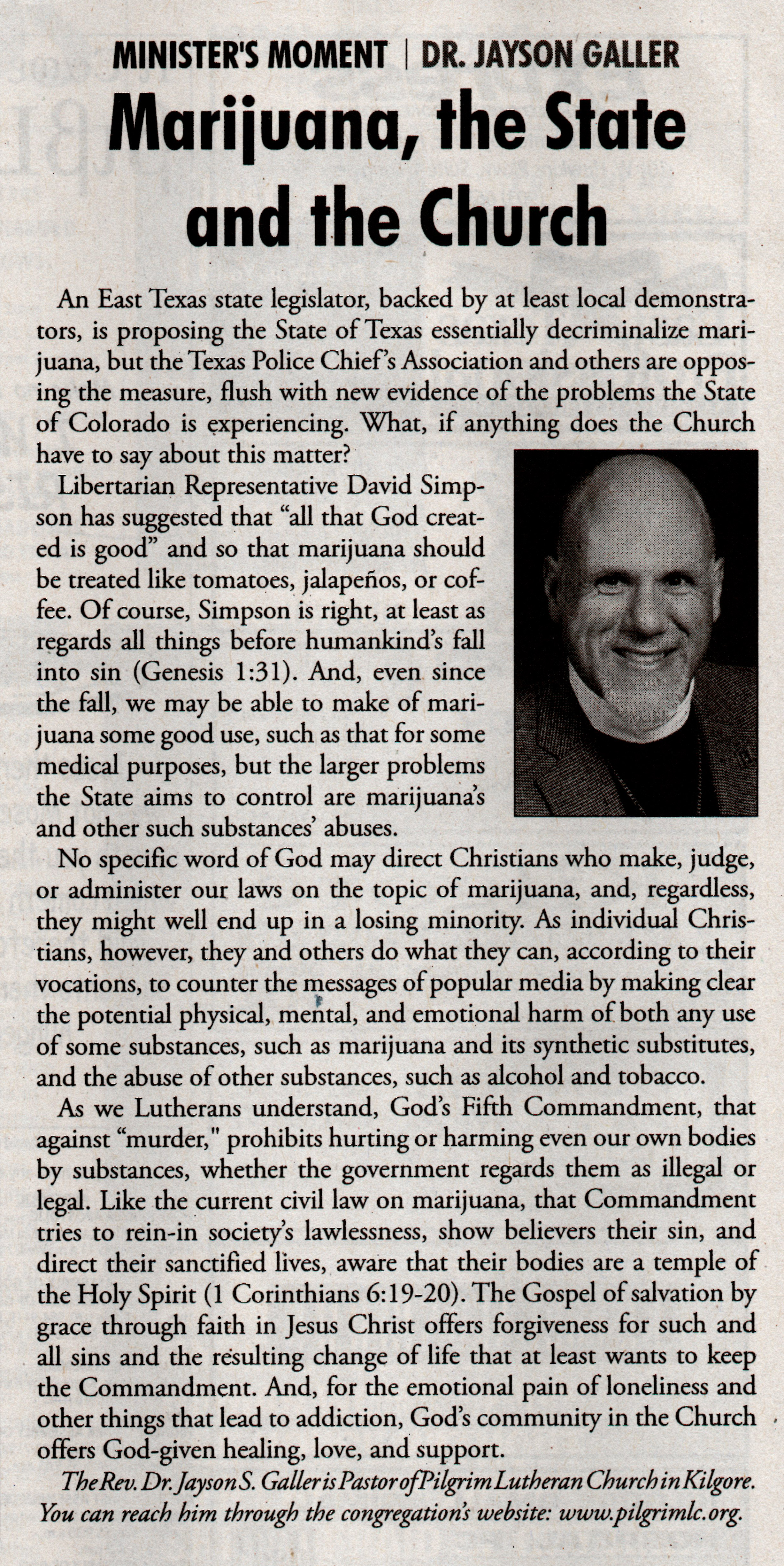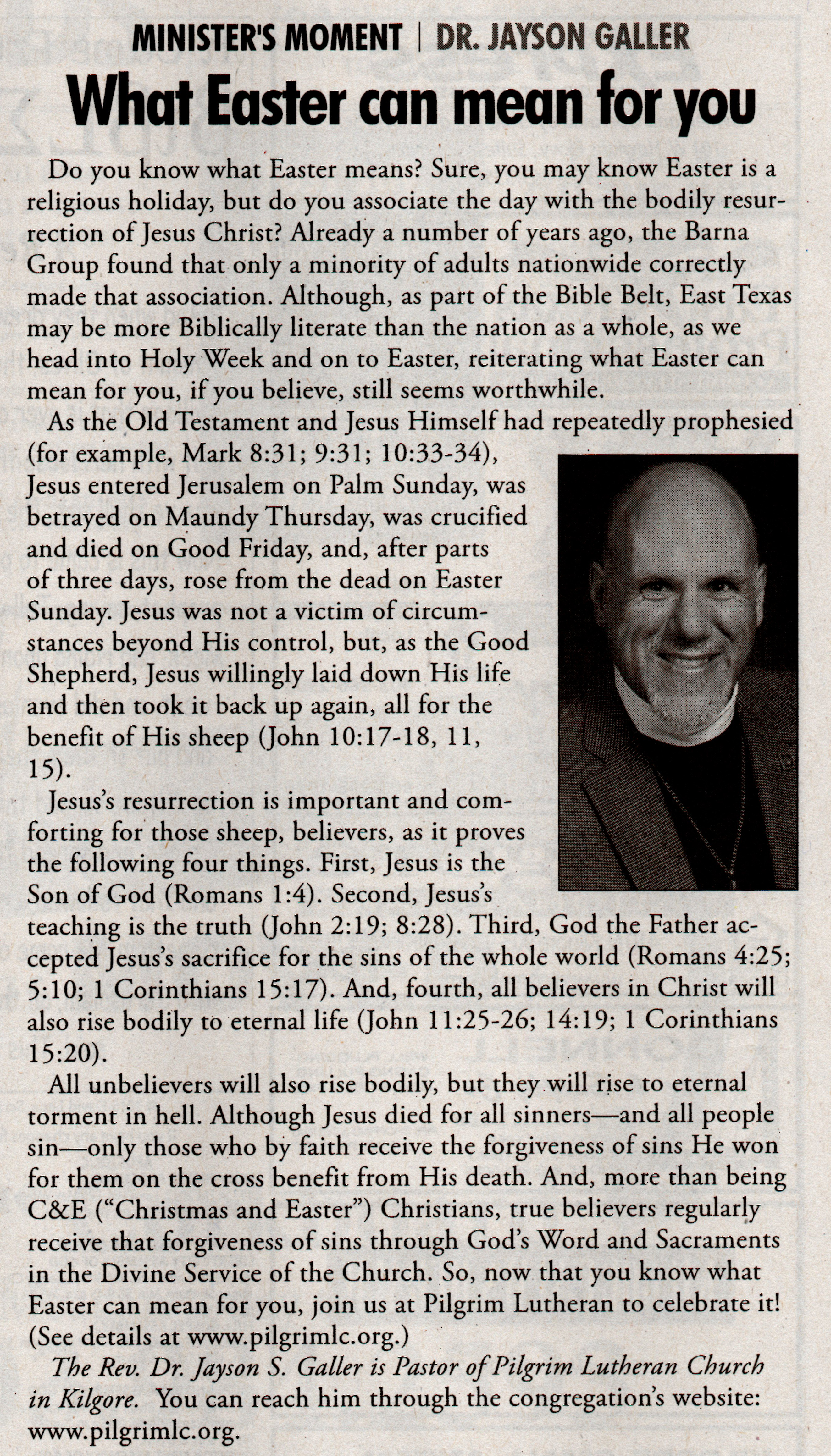 Each Saturday the Kilgore News Herald runs a column written by local pastors titled "Minister's Moment". Pastor Galler's columns currently run the first and third Saturdays of the month. Past columns are posted below (the most-recent first), with an image of the hard copy hosted on this site (which links to a full-screen version of the image), an offsite link to the newspaper's electronic version of the column (available to all for about two weeks after the column's publication and to newspaper subscribers who log-in after that), and any other onsite or offsite links to related content. Pastor Galler welcomes your comments or questions about the past columns and your suggestions for future ones; you can email him at pastor@pilgrimlc.org. (Note that some of Pastor Galler's columns have also run in The Henderson News.)