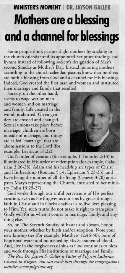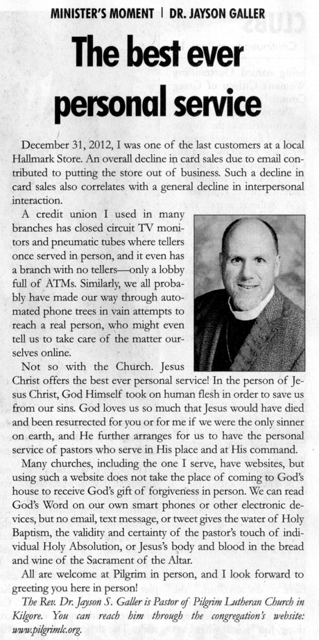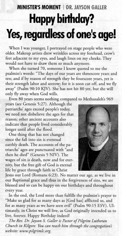Each Saturday the Kilgore News Herald runs a column written by local pastors titled "Minister's Moment". Pastor Galler's columns currently run the first and third Saturdays of the month. Past columns are posted below (the most-recent first), with an image of the hard copy hosted on this site (which links to a full-screen version of the image), an offsite link to the newspaper's electronic version of the column (available to all for about two weeks after the column's publication and to newspaper subscribers who log-in after that), and any other onsite or offsite links to related content. Pastor Galler welcomes your comments or questions about the past columns and your suggestions for future ones; you can email him at pastor@pilgrimlc.org. (Note that some of Pastor Galler's columns have also run in The Henderson News.)