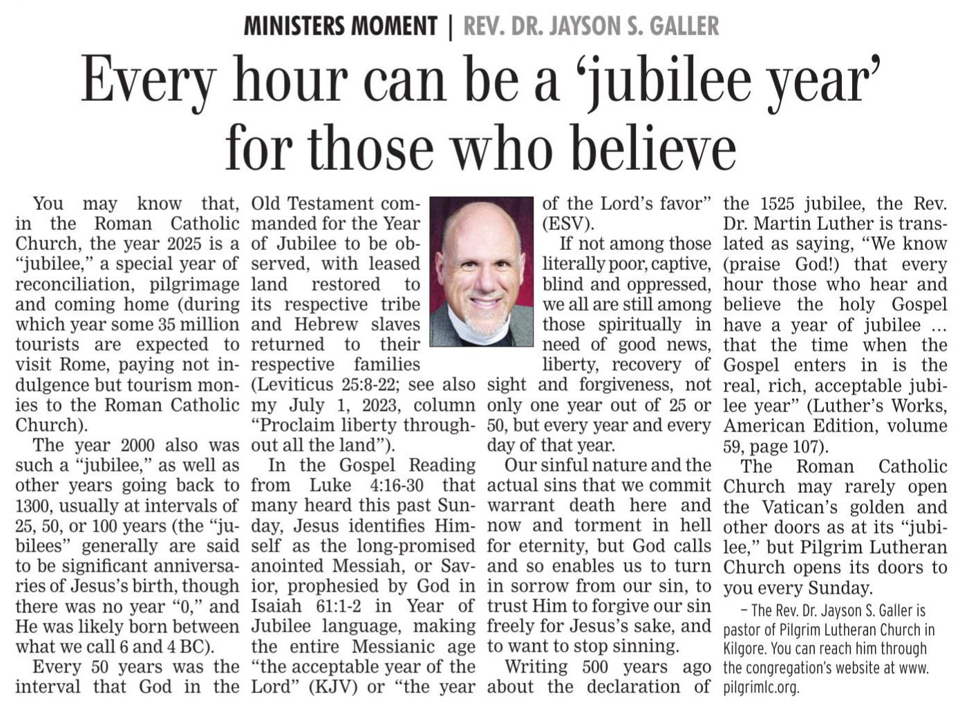 Pastor Galler is normally in his study Tuesdays 5:00-8:00 p.m., Wednesdays through Fridays 9:00 a.m. to Noon, and Saturdays Noon to 3:00 p.m.