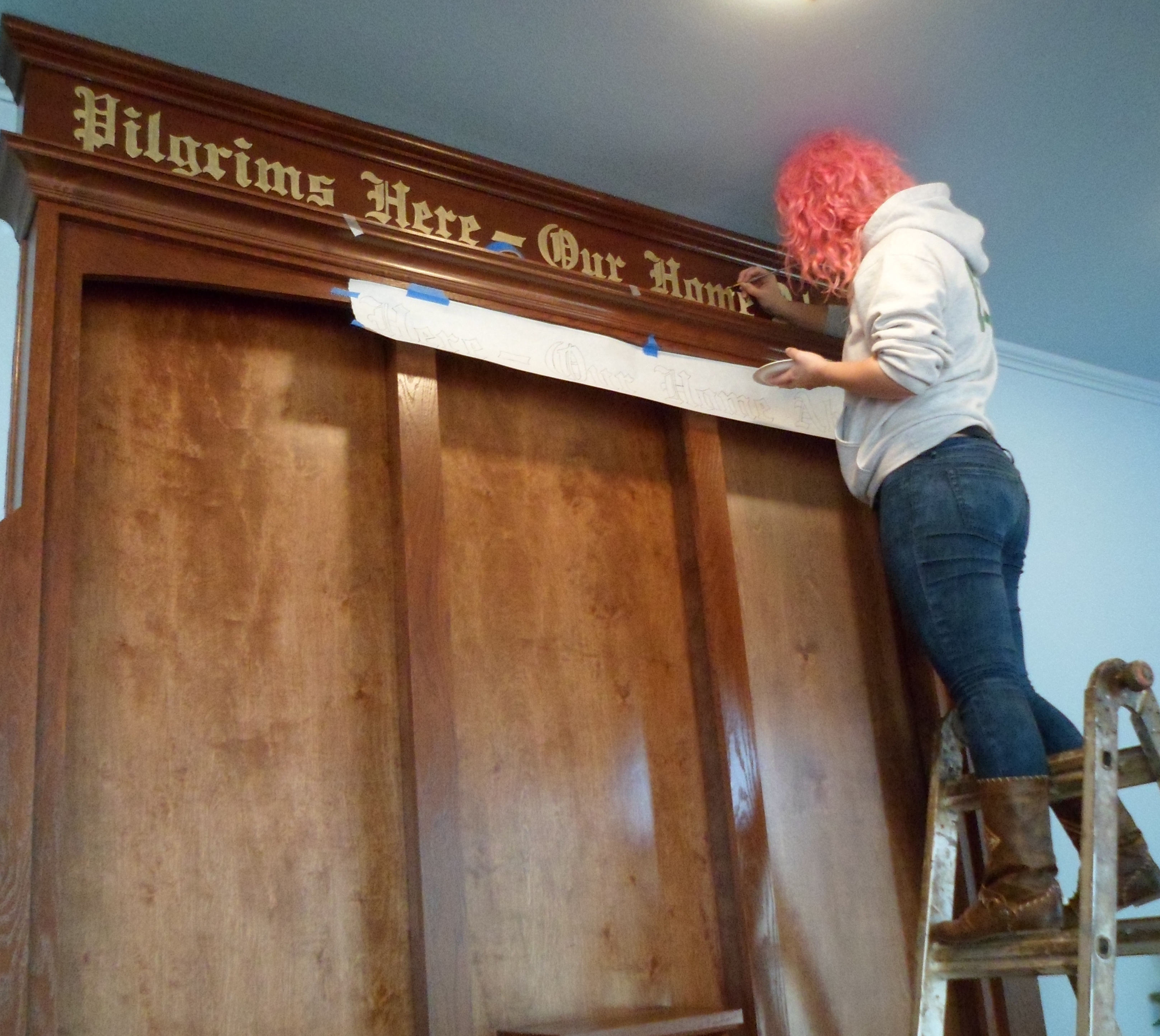 On January 23, 2013, Kilgore artist Sarah Weatherford of Faux Artistry by Lisa puts the second coat of paint on the reredos lettering that connects the congregation’s name to our heavenly goal.